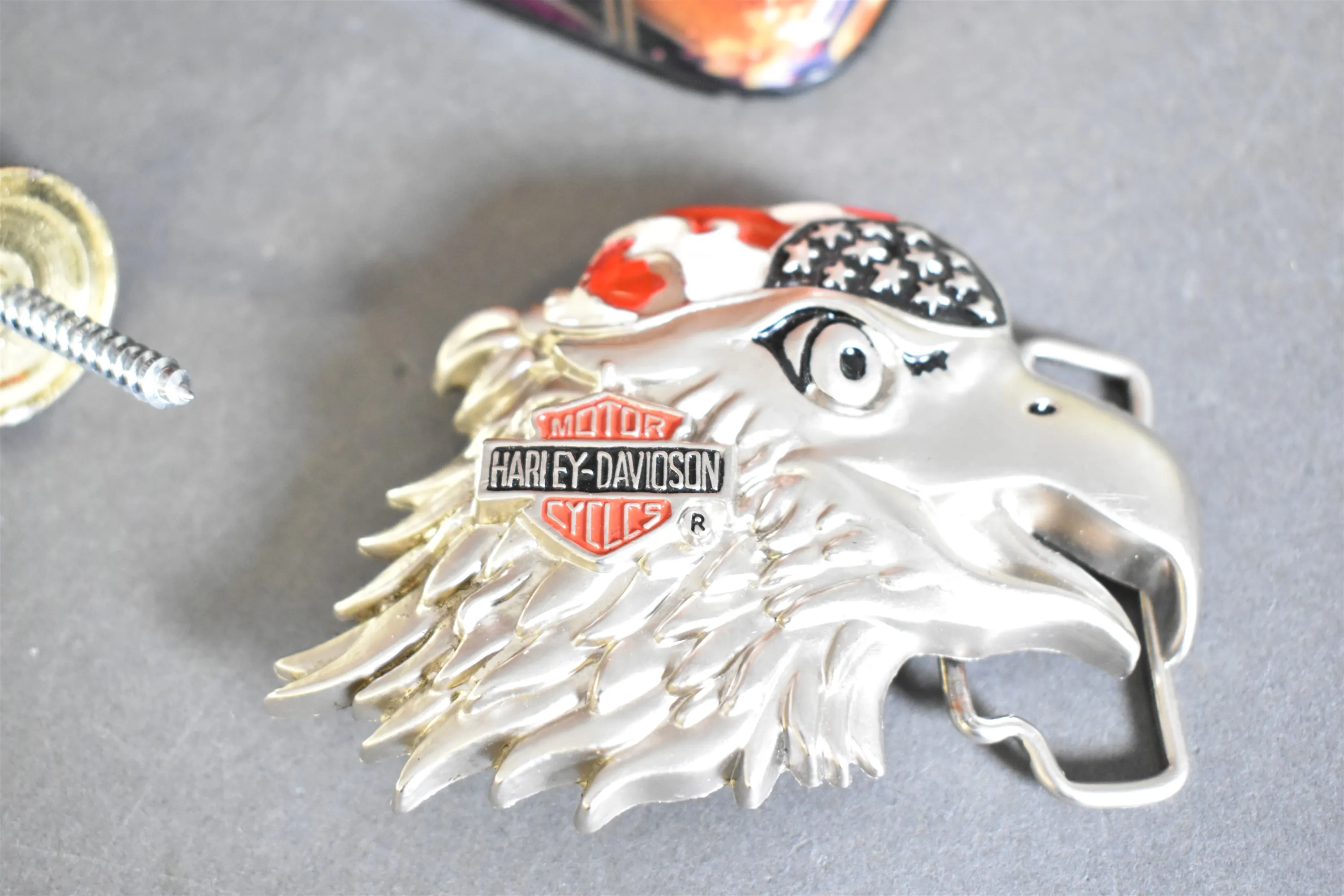 13703. Parti bla plåtburkar, tennbägare och Harley Davidson bältesspänne, högsta höjd 18 cm