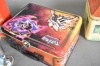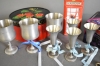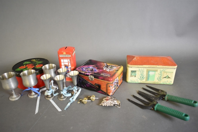 13703. Parti bla plåtburkar, tennbägare och Harley Davidson bältesspänne, högsta höjd 18 cm