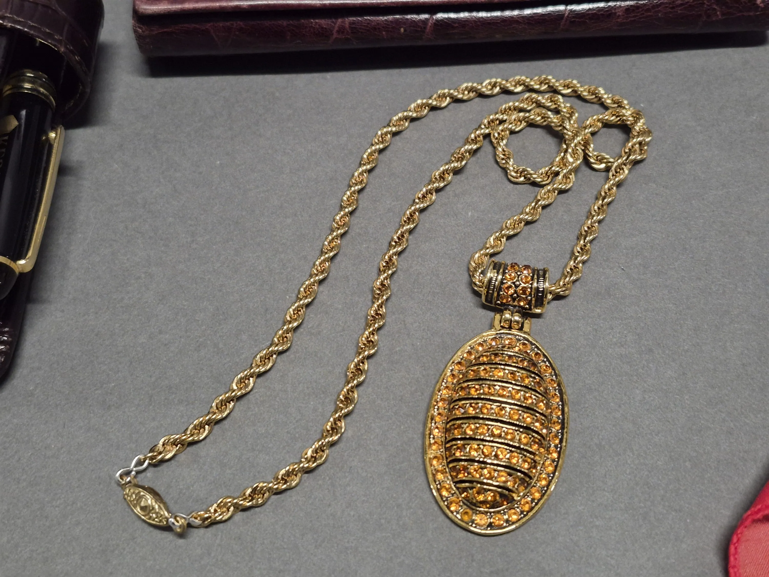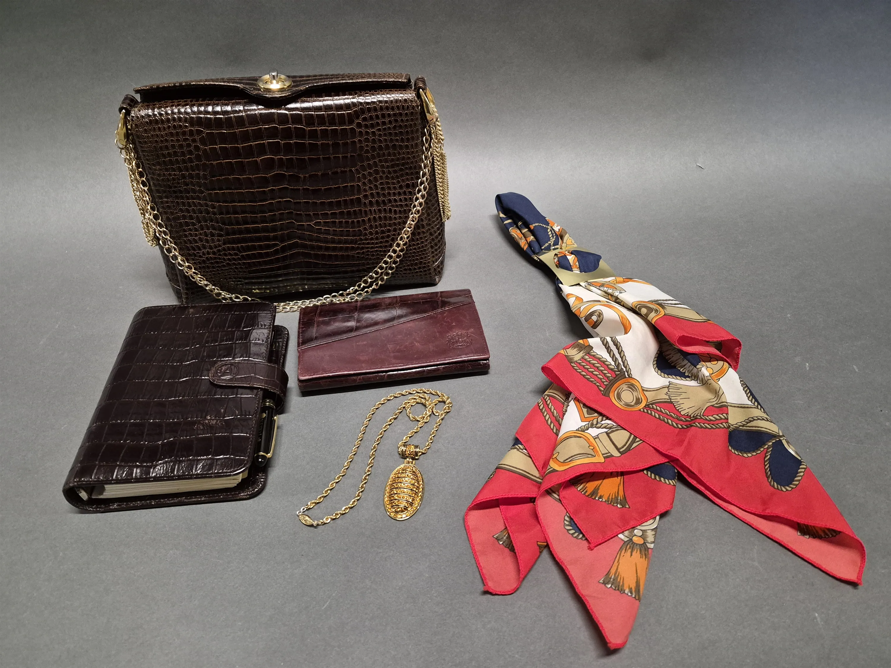 19439. Parti bla retro handväska, filofaxkalender med penna, och halsband, längd på väska 28 cm