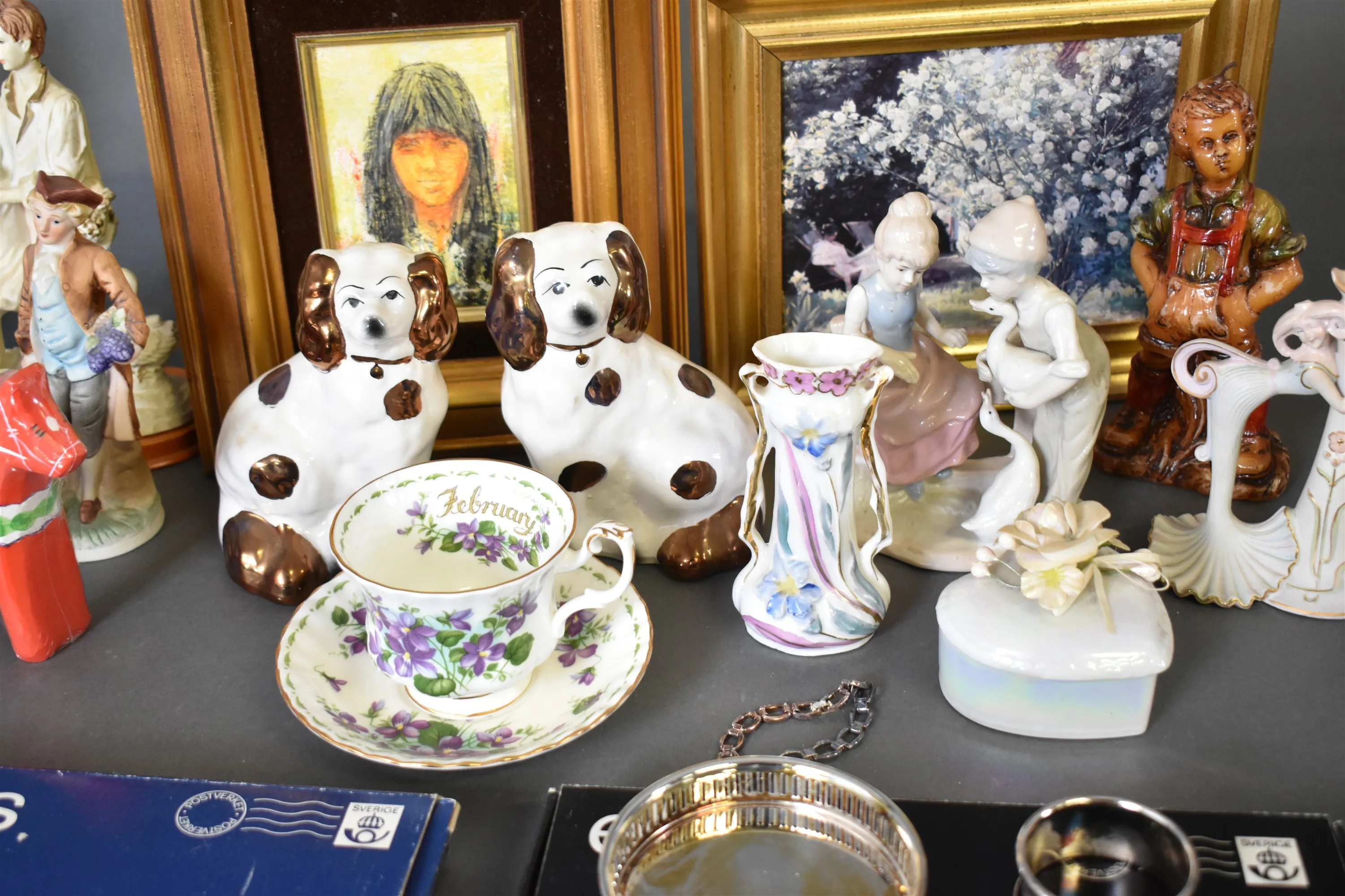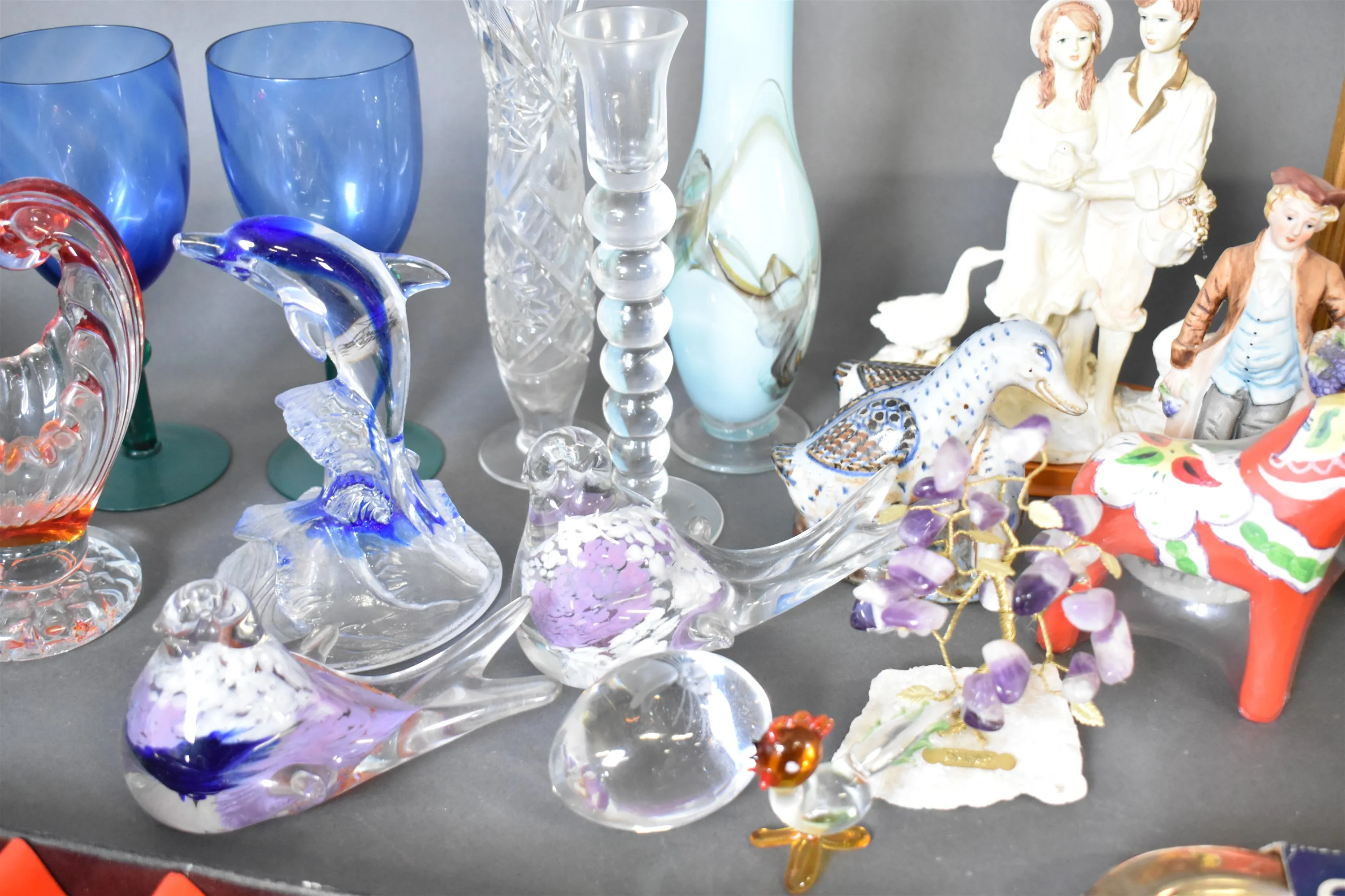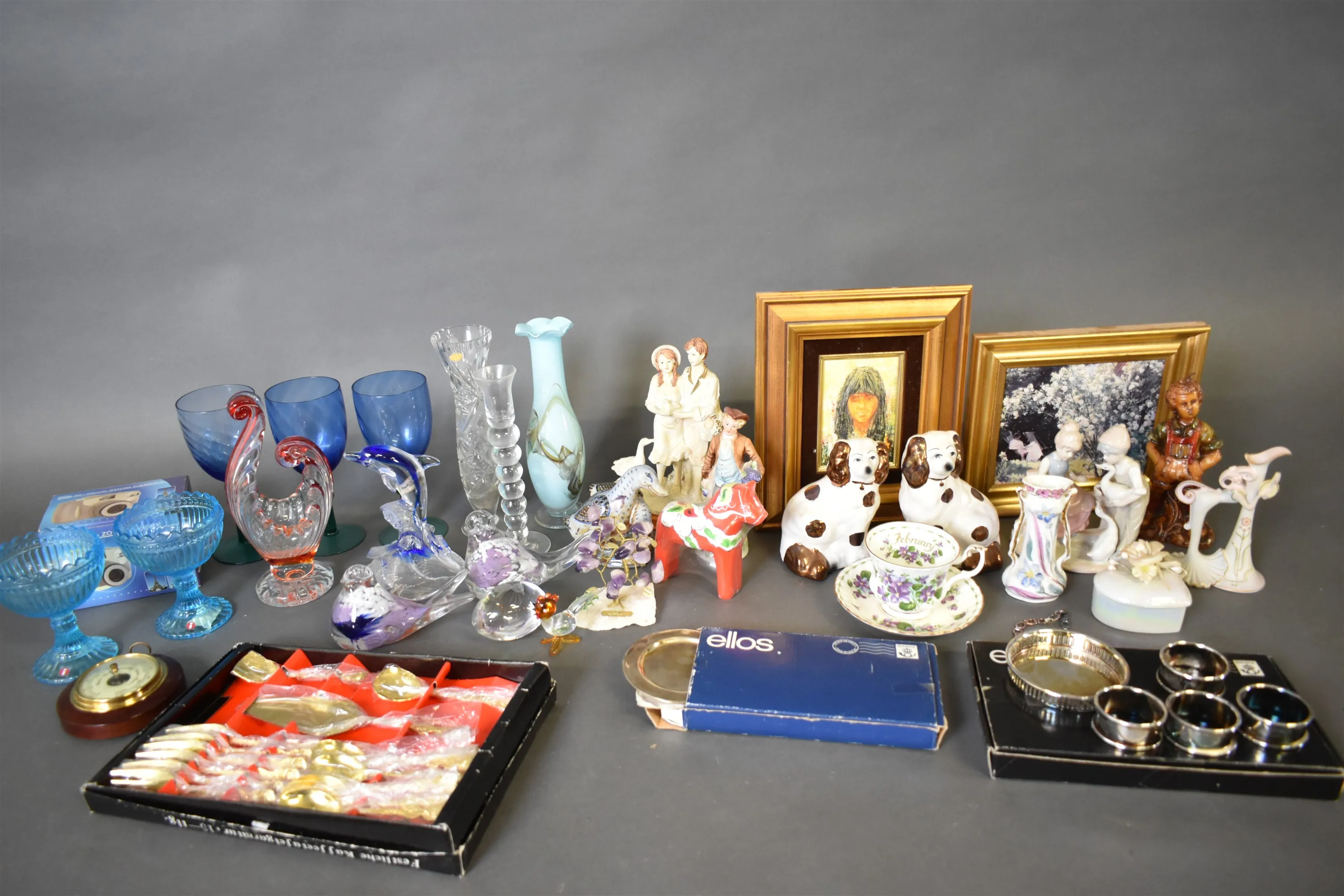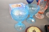 8296. Parti bla skålar på fot Iittala 2 st, glas och engelska hundar, högsta höjd 27 cm