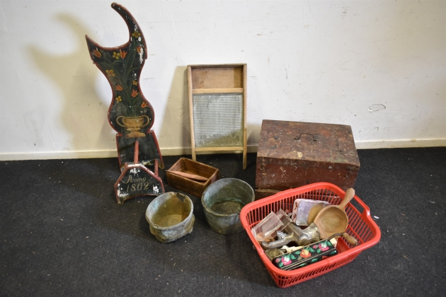 16375. Parti bla skäktestol,trälåda och tvättbräda, högsta höjd 98 cm