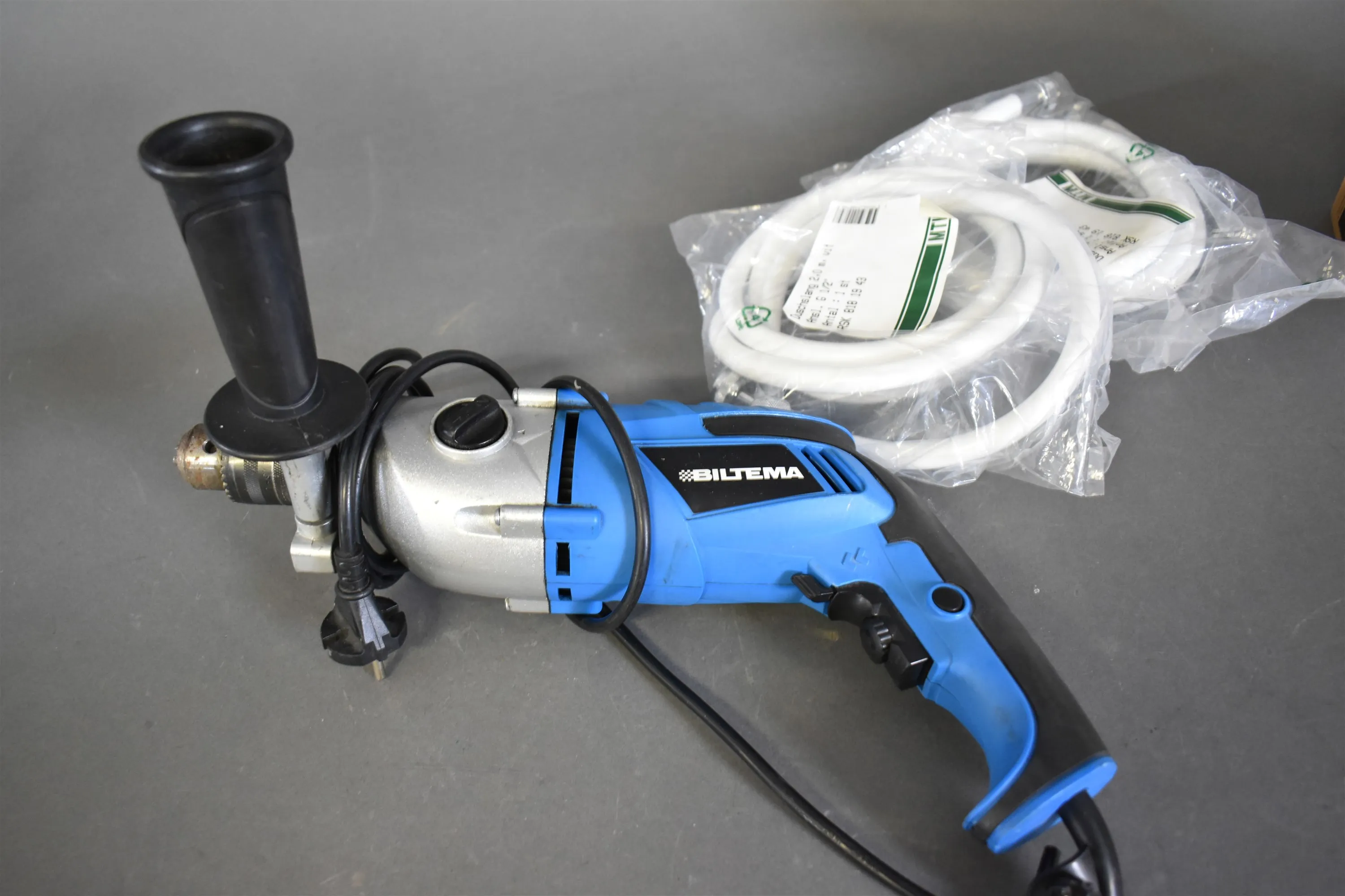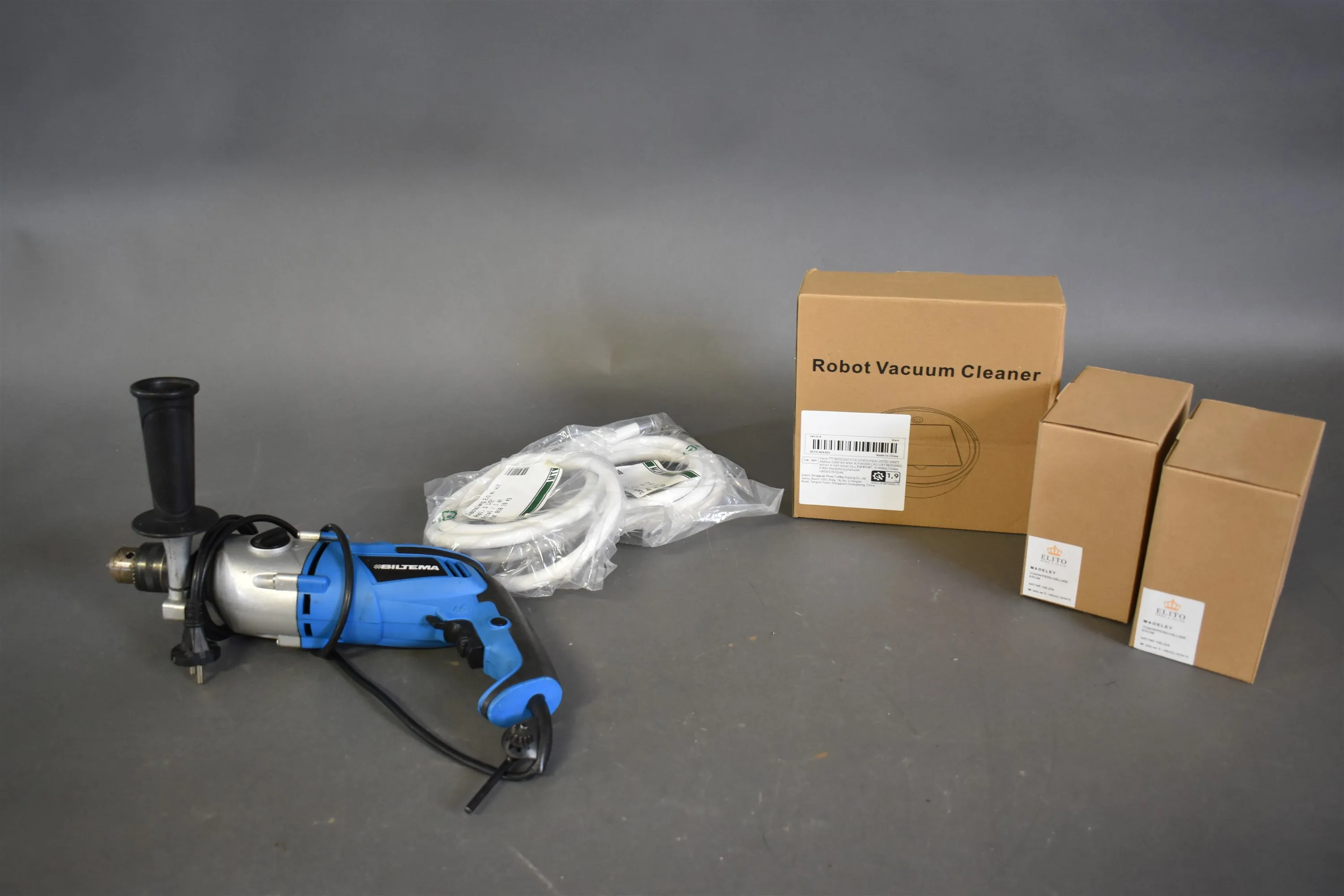 16754. Parti bla slagborrmaskin och mini robotdammsugare, längsta mått 41 cm