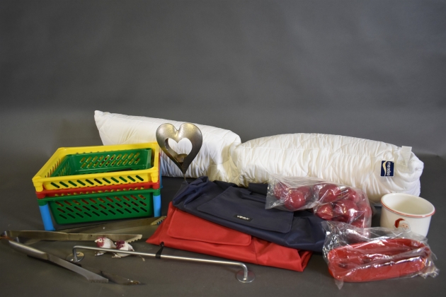 16242. Parti bla sovbolster, extraväskor till "dramaten" och dekorationsäpplen, mått på bolster 145 cm