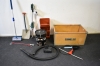 11535. Parti bla trälåda, ogräsbrännare och asksug, längd på låda 83 cm