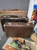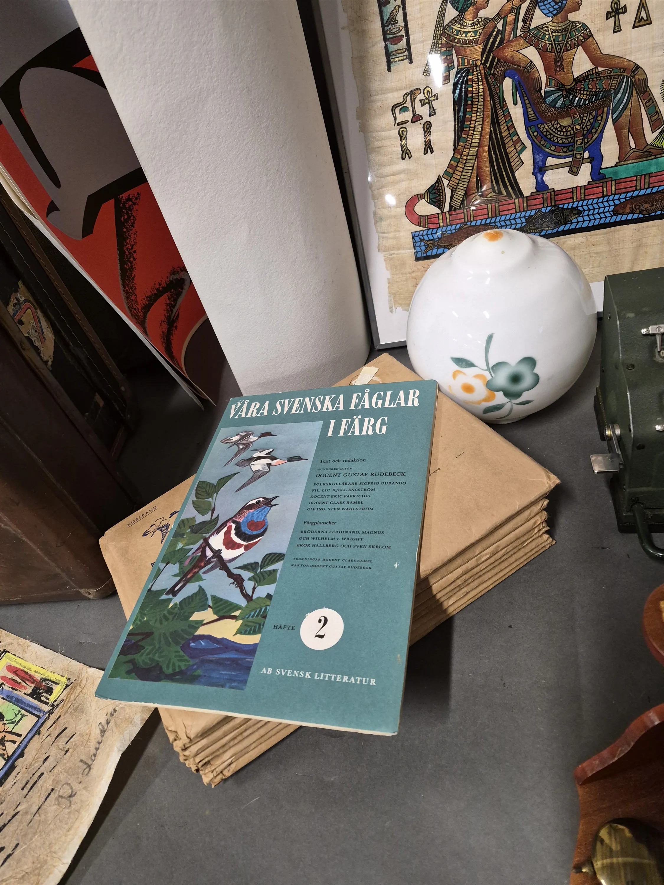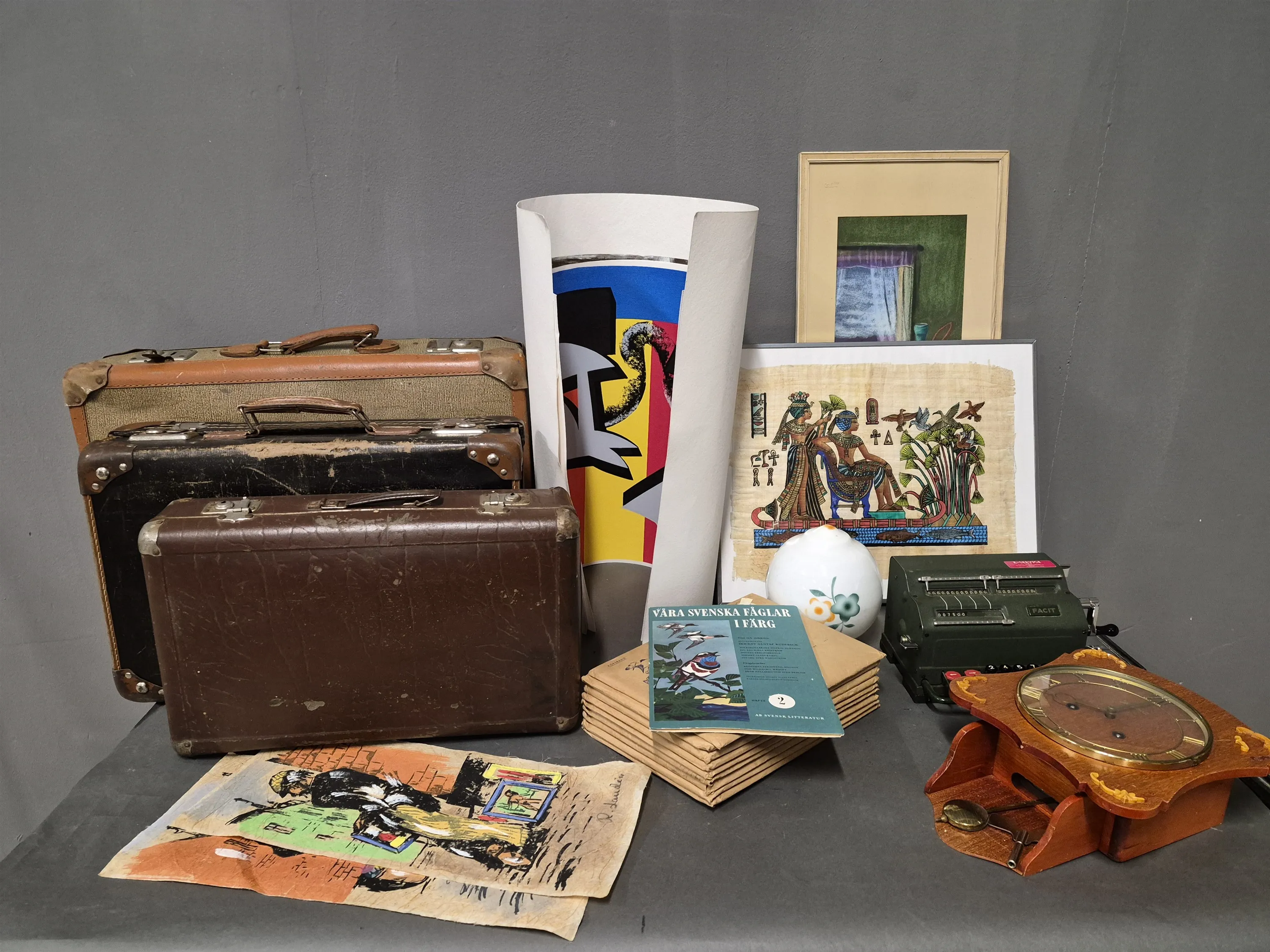 18342. Parti bla väskor, räknemaskin och "Våra svenska fåglar i färg", högsta höjd 68 cm