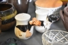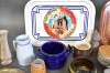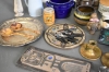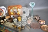 9293. Parti bla vas konstglas, keramiktavla Elbogen och metallbrickor, högsta höjd 35 cm
