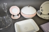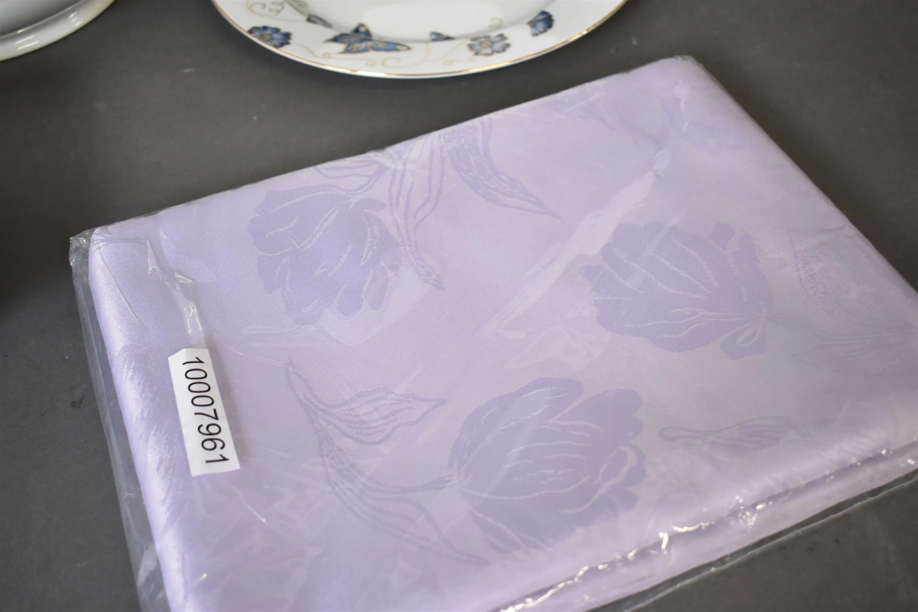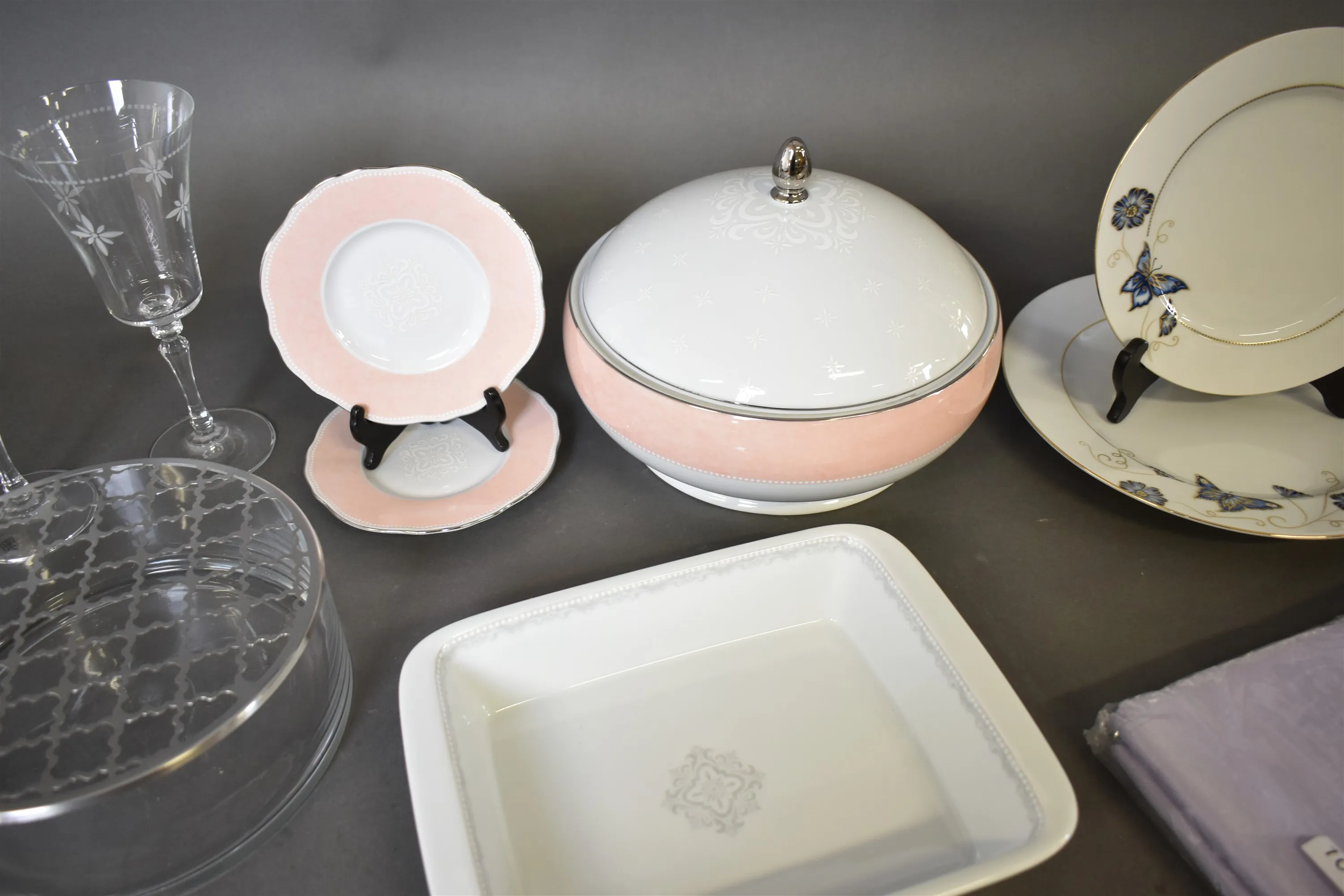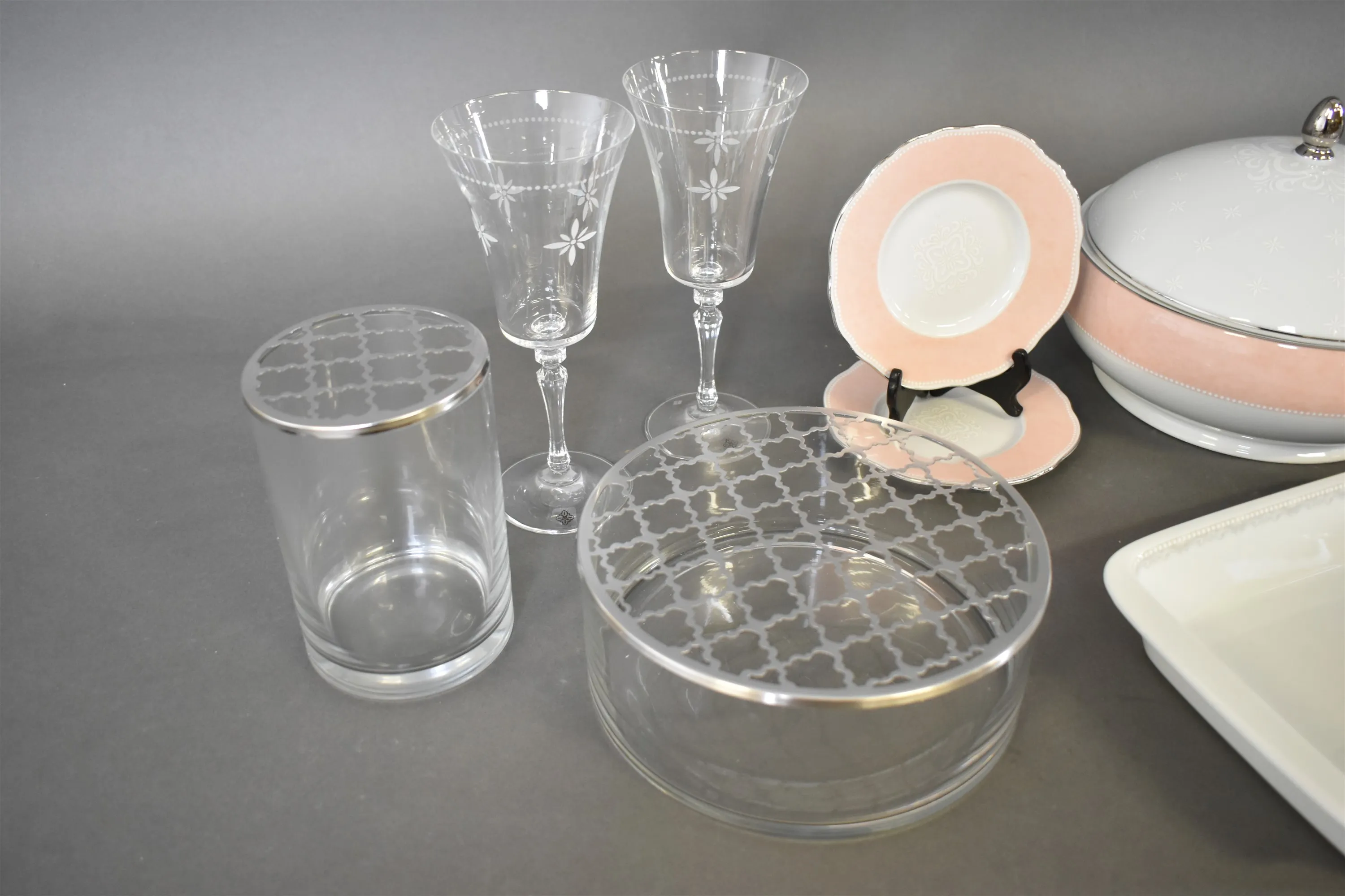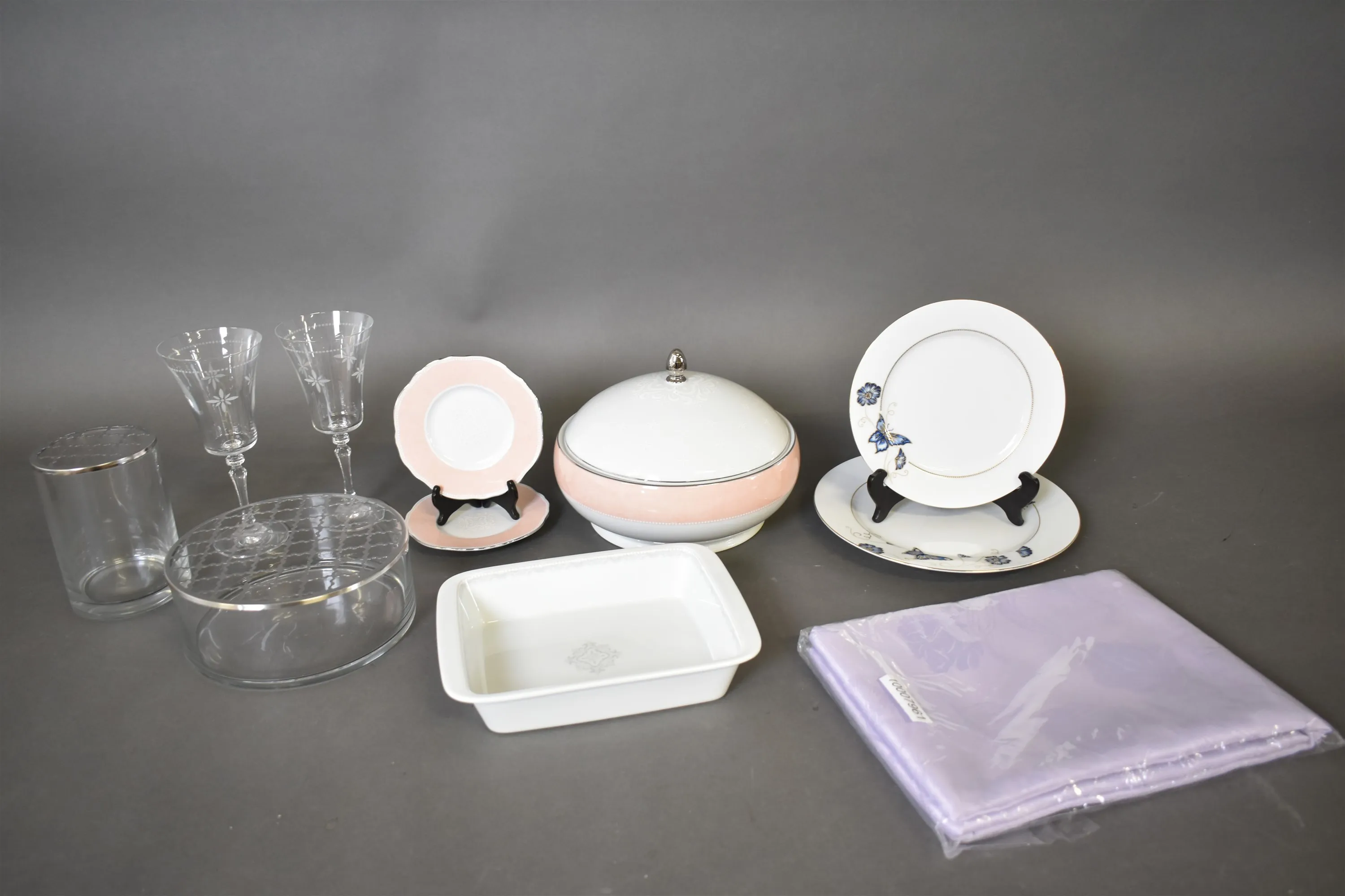 13376. Parti bla vinglas och servisdelar Fyrklövern "Moments", vaser med blomsterinsats och bordsduk, högsta höjd 22 cm