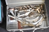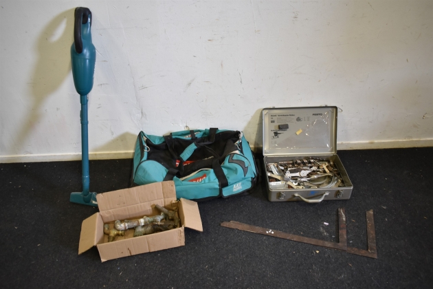 16372. Parti bla väska Makita, plåtväska med diverse verktyg och borr, högsta höjd 95 cm. Dammsugare saknar batteri, ej testad