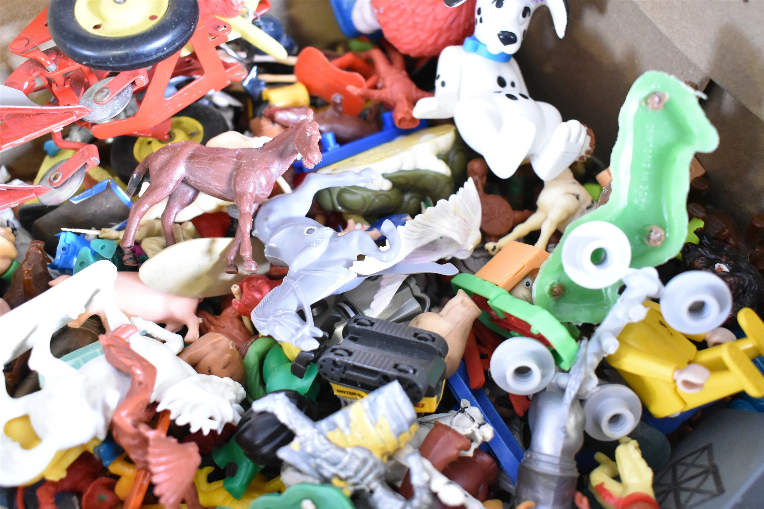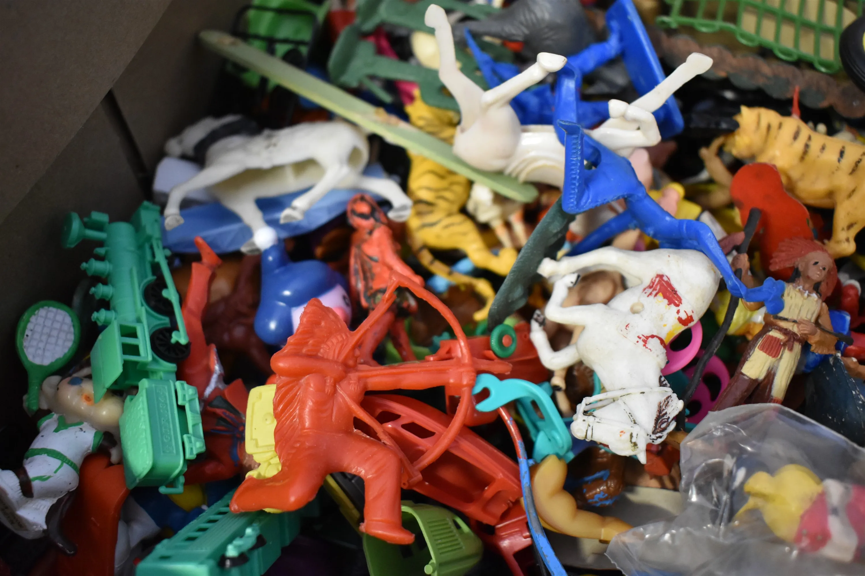 6613. Parti blandade leksaker bla cowboys & indianer i plast, längd på låda 46