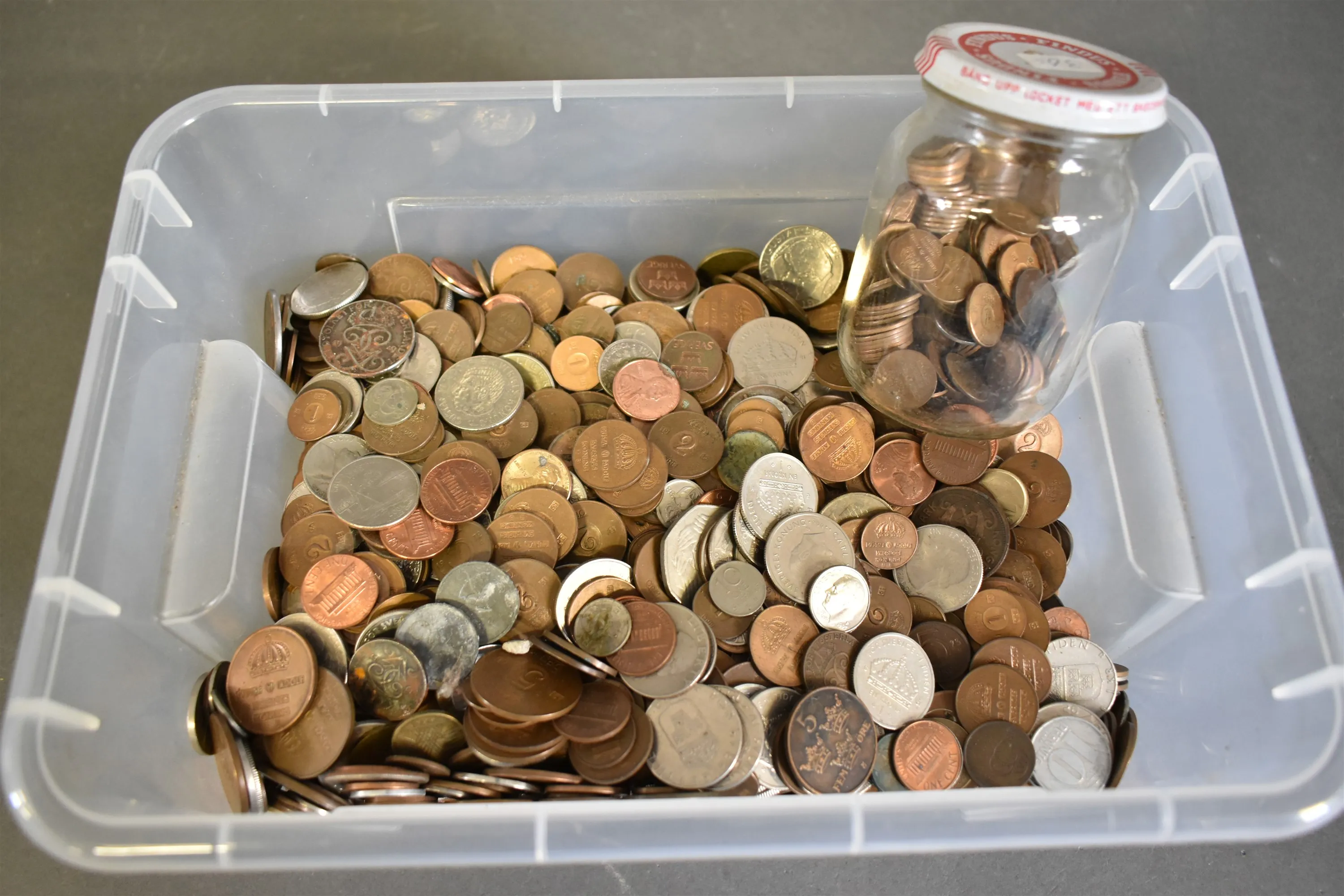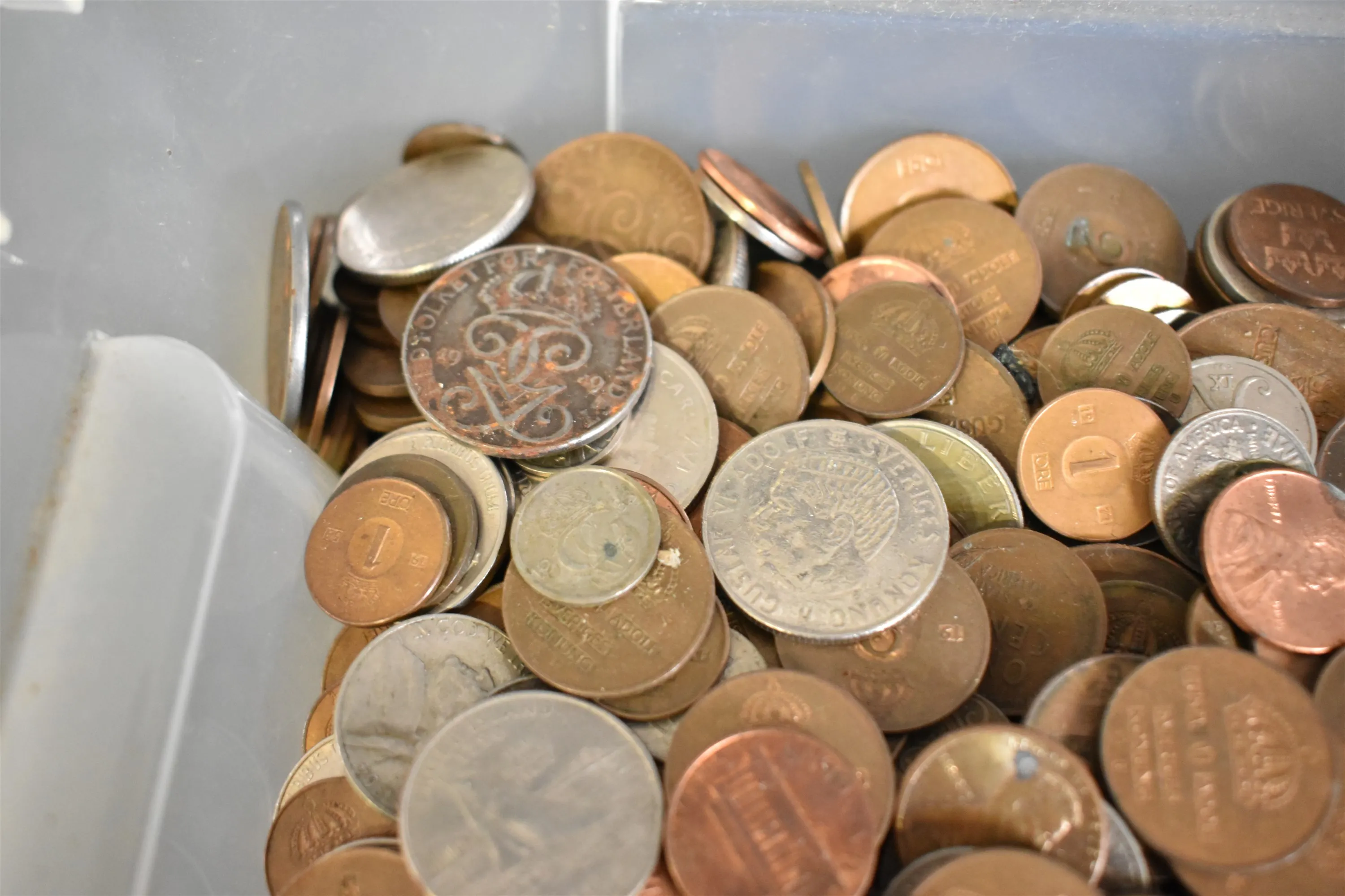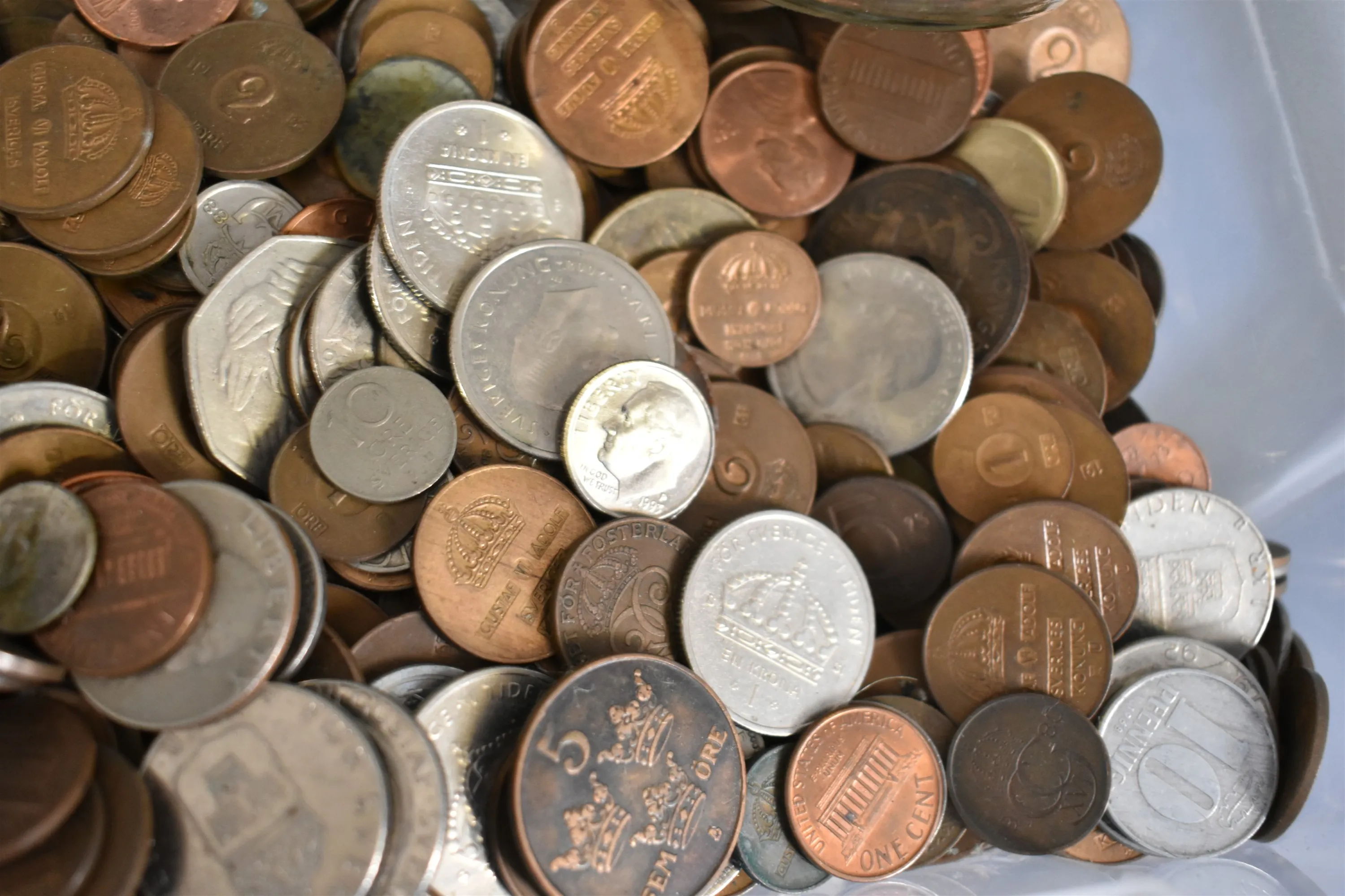 16581. Parti blandade mynt, längd på låda 28 cm, vikt ca 11 kg