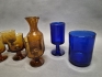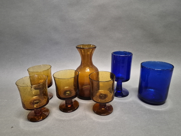 18089. Parti blåtonat och bärnstensfärgat glas, Höglund, nagg på ett glas, högsta höjd 21 cm