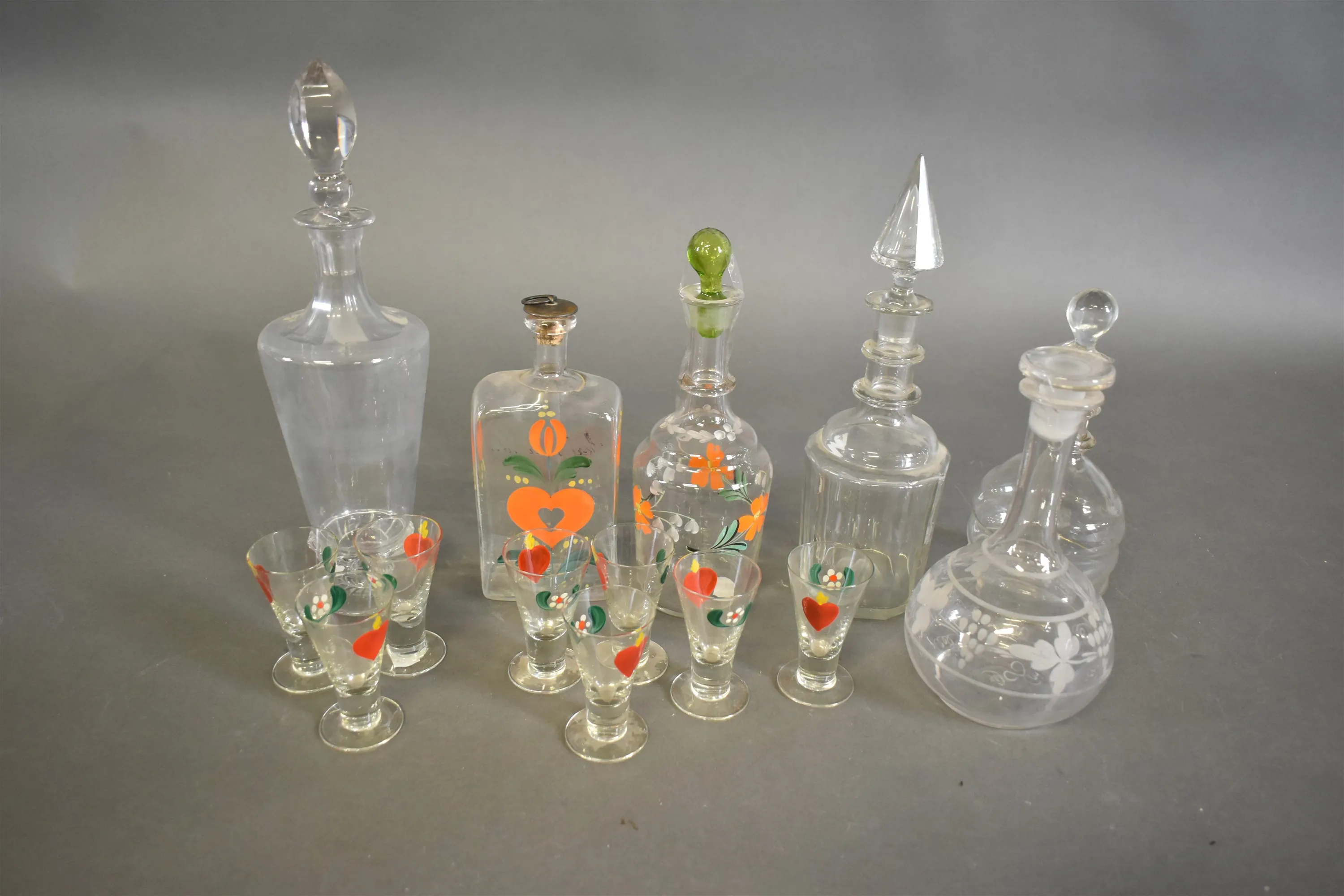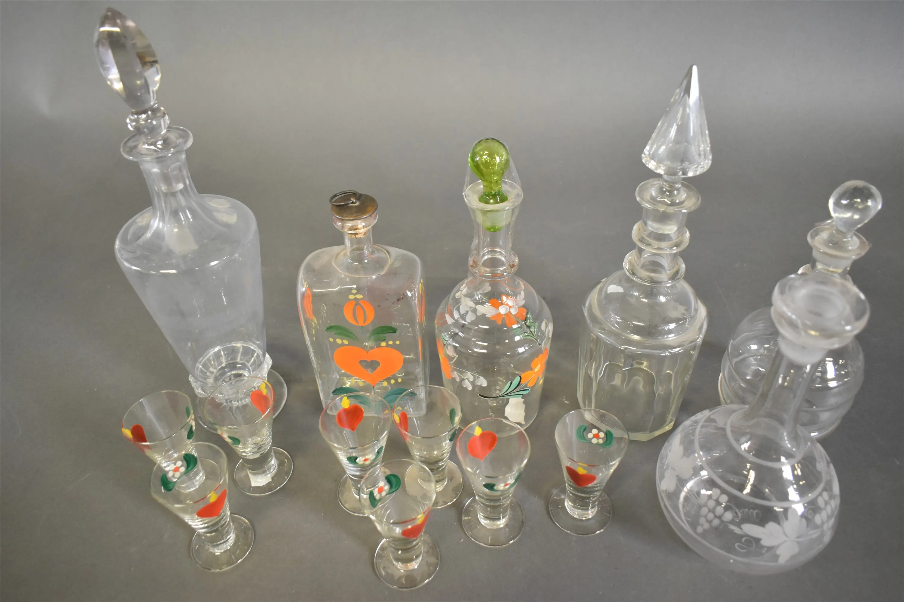 16064. Parti brännvinsflaskor glas, högsta 38 cm
