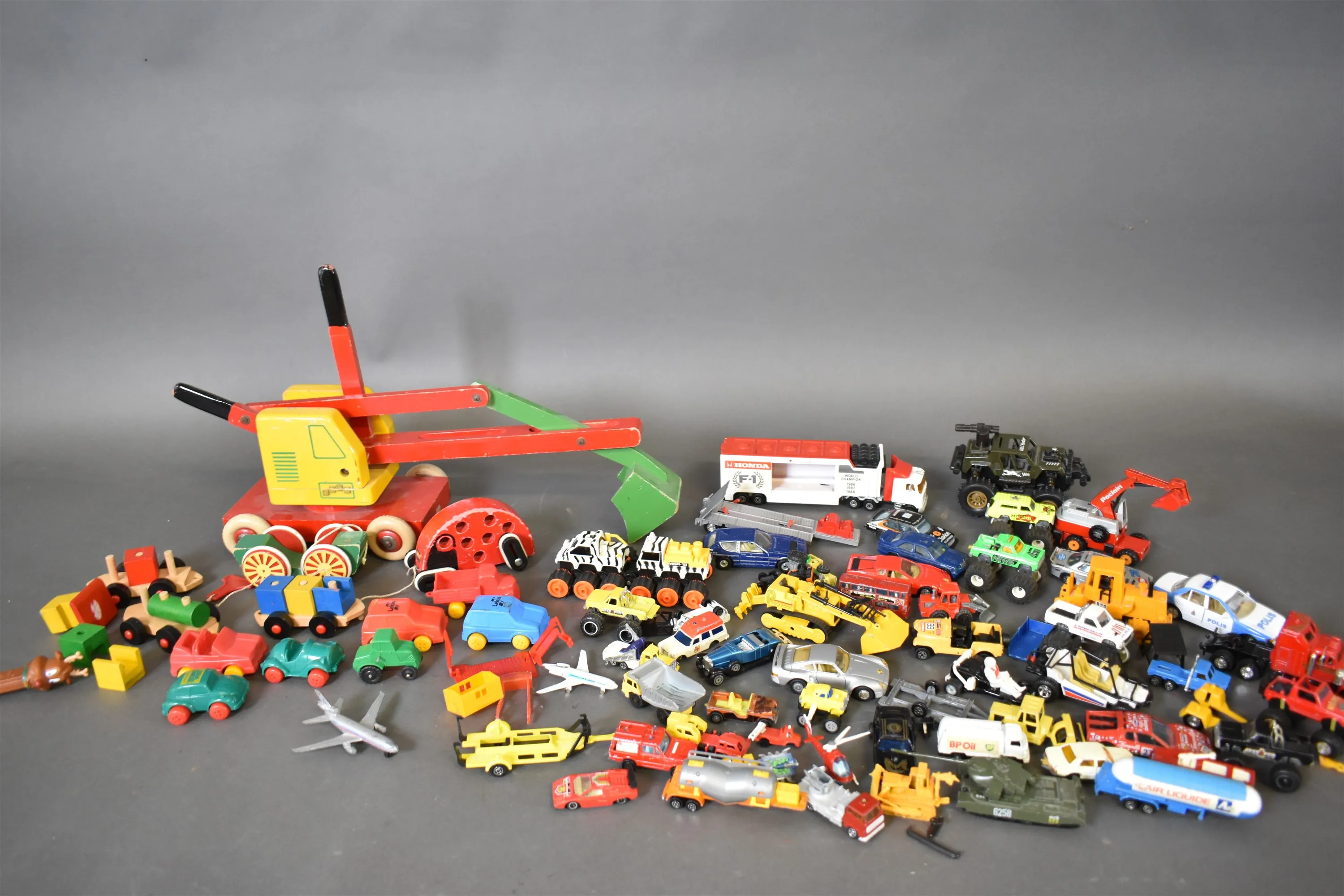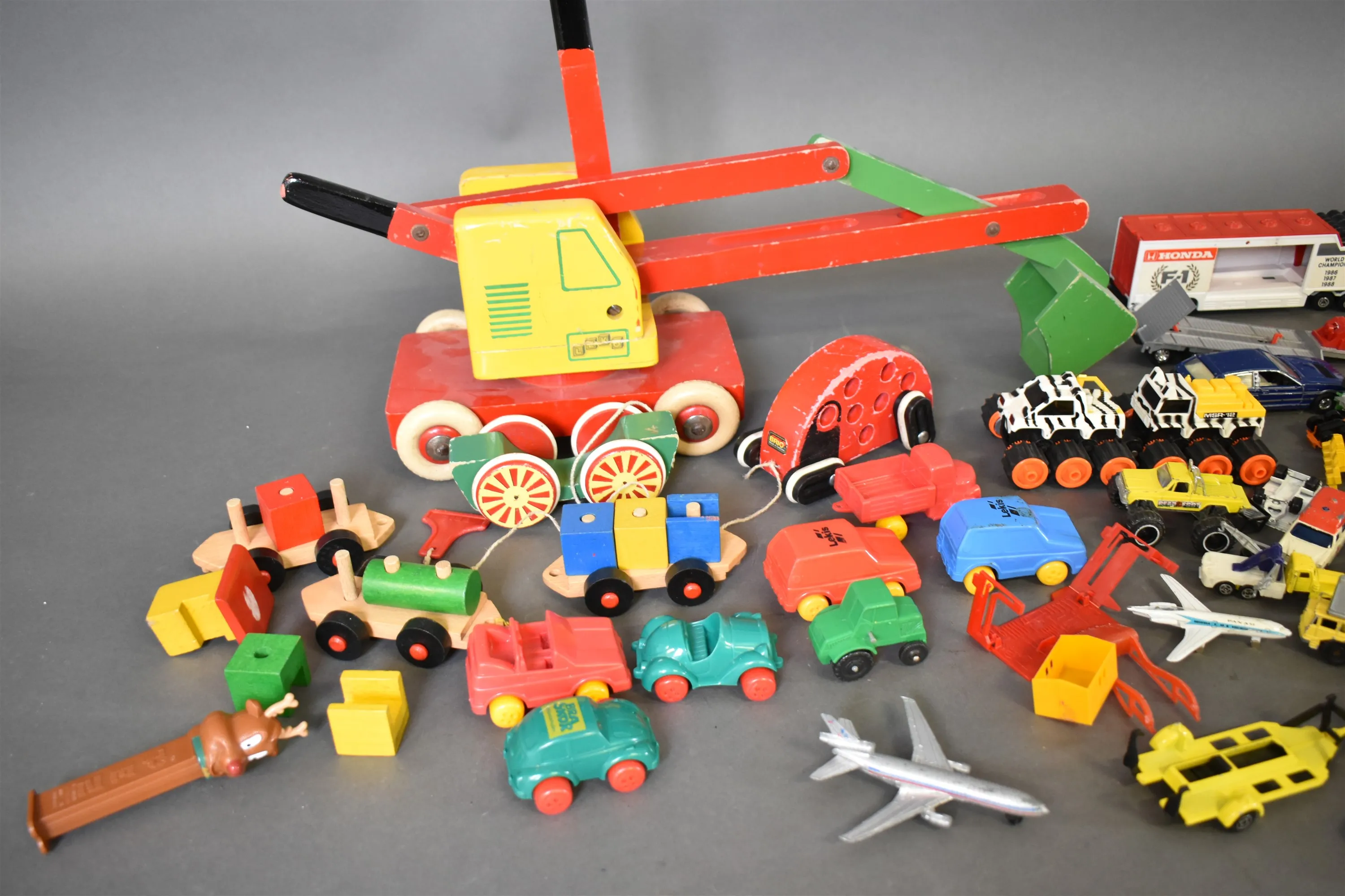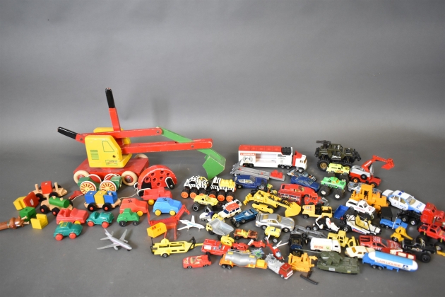 13478. Parti BRIO träleksaker och leksaksbilar bla plast och Majorette, längsta mått 57 cm