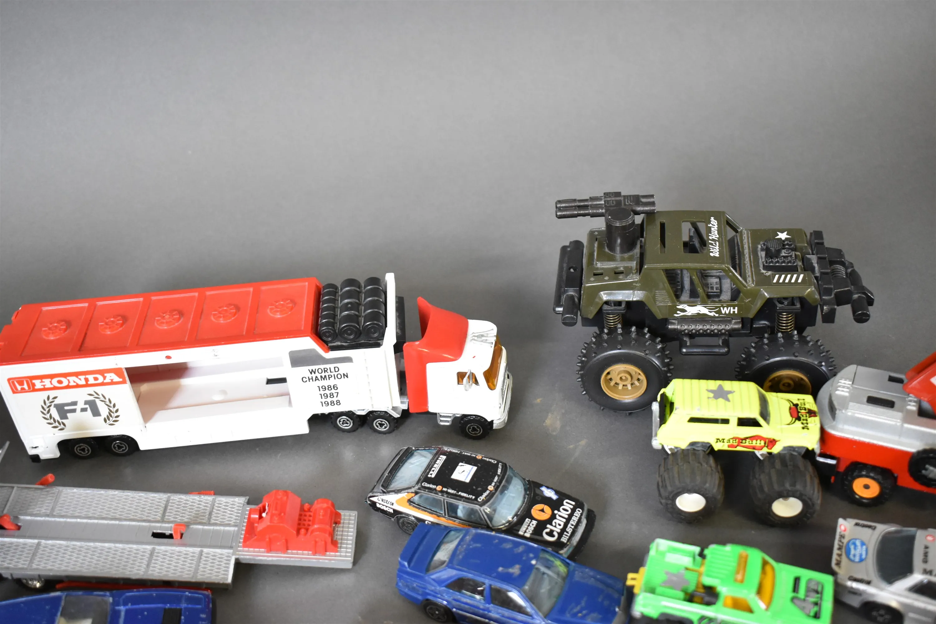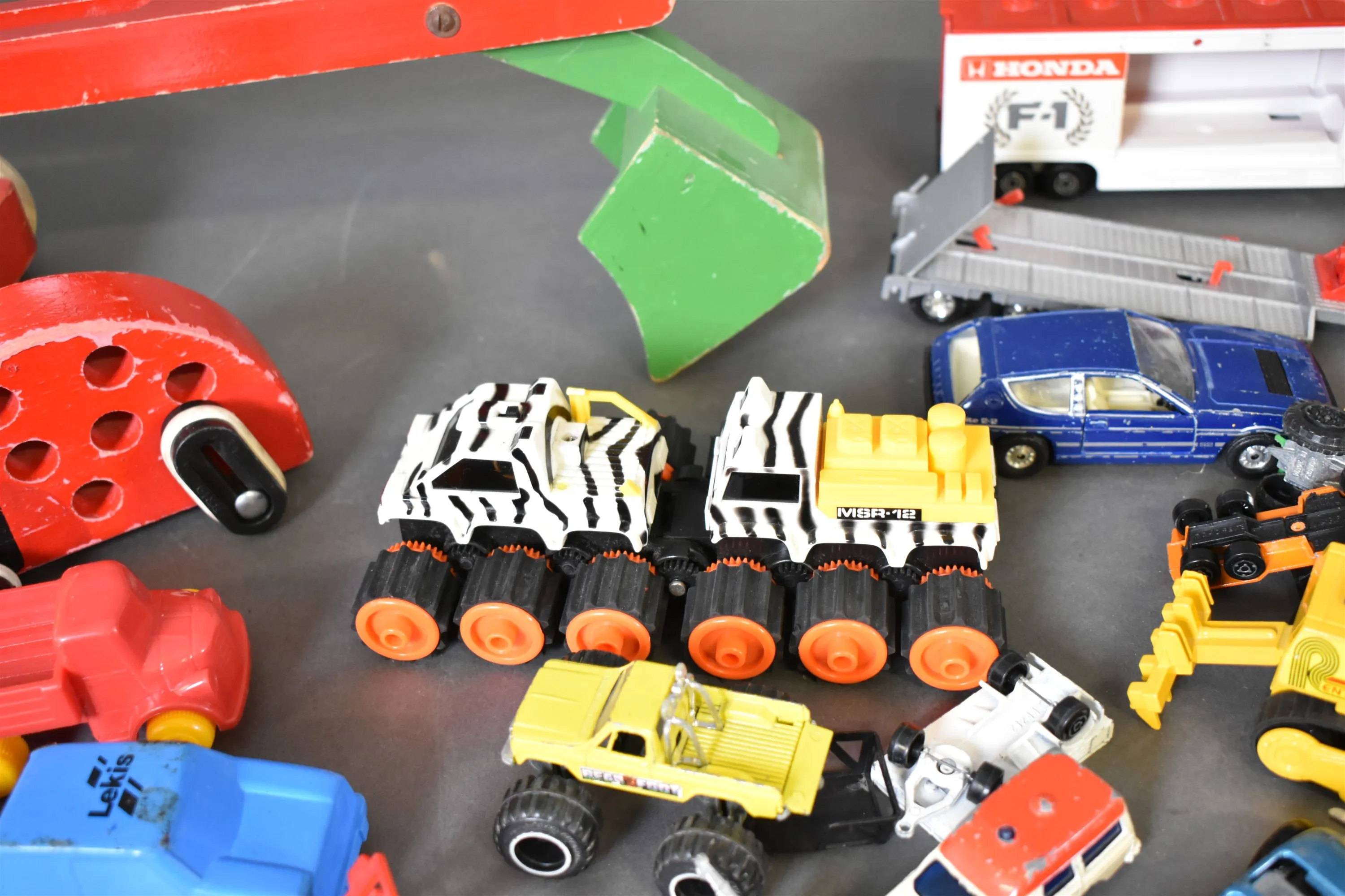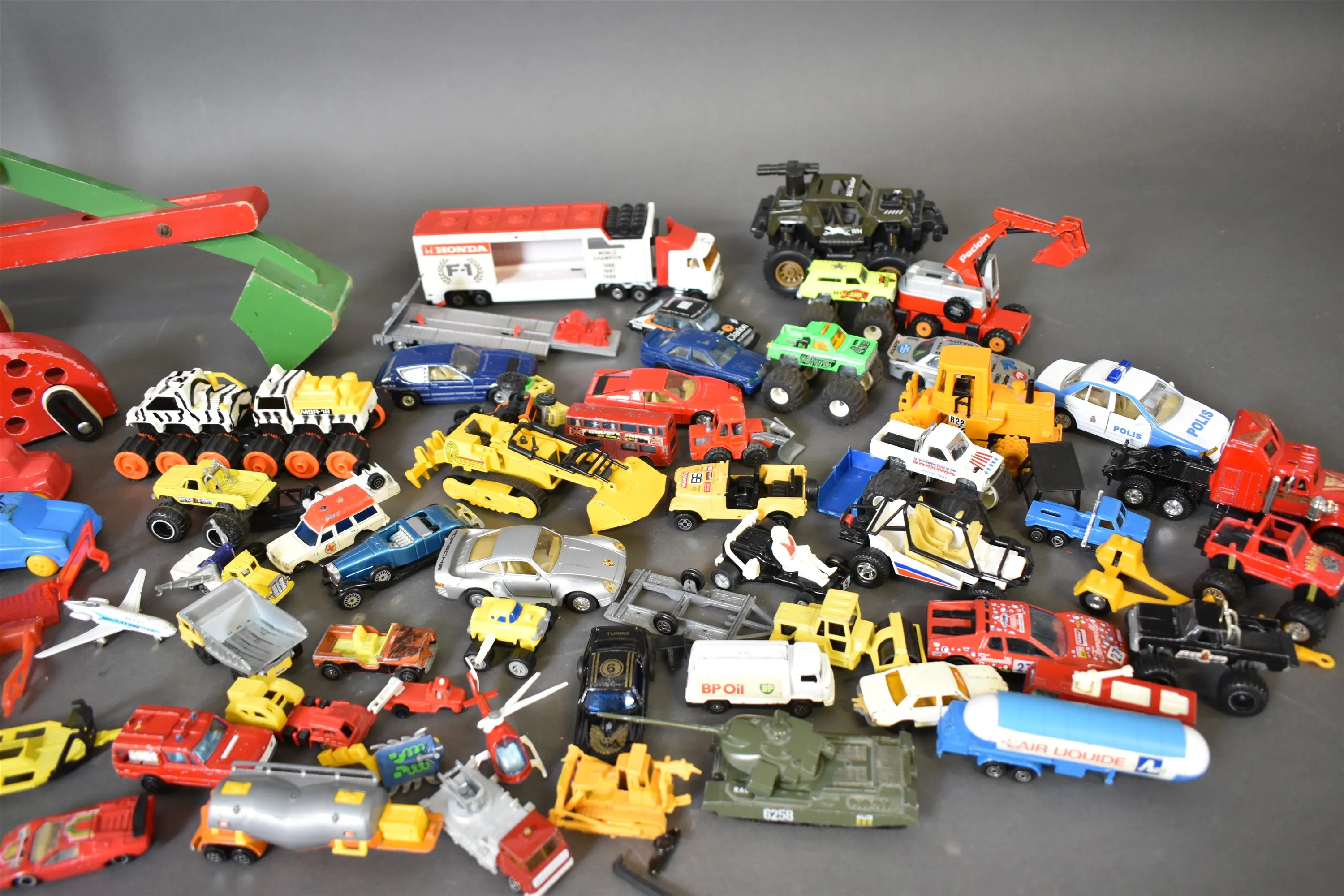 13478. Parti BRIO träleksaker och leksaksbilar bla plast och Majorette, längsta mått 57 cm