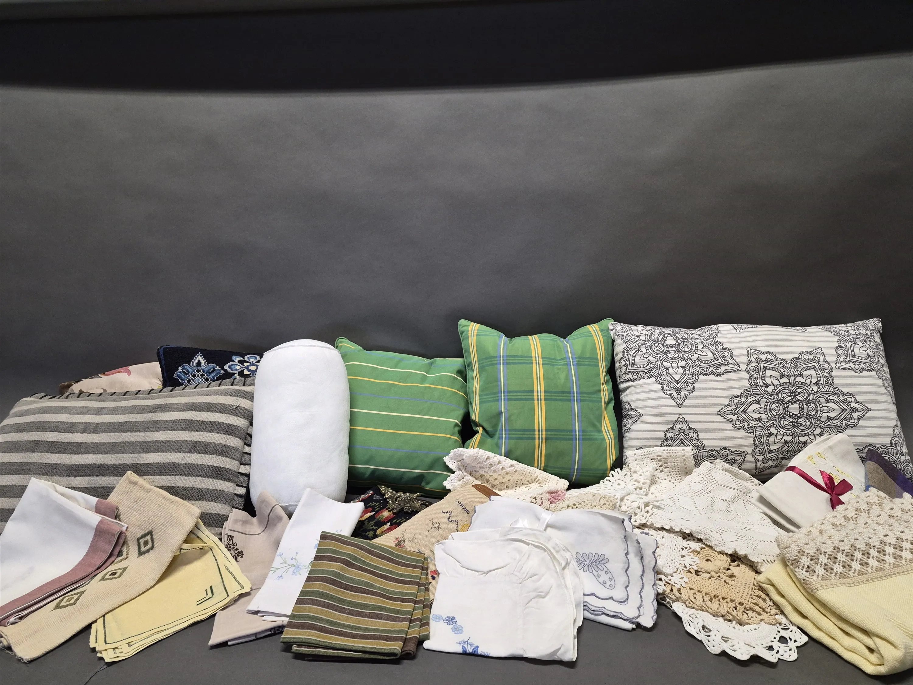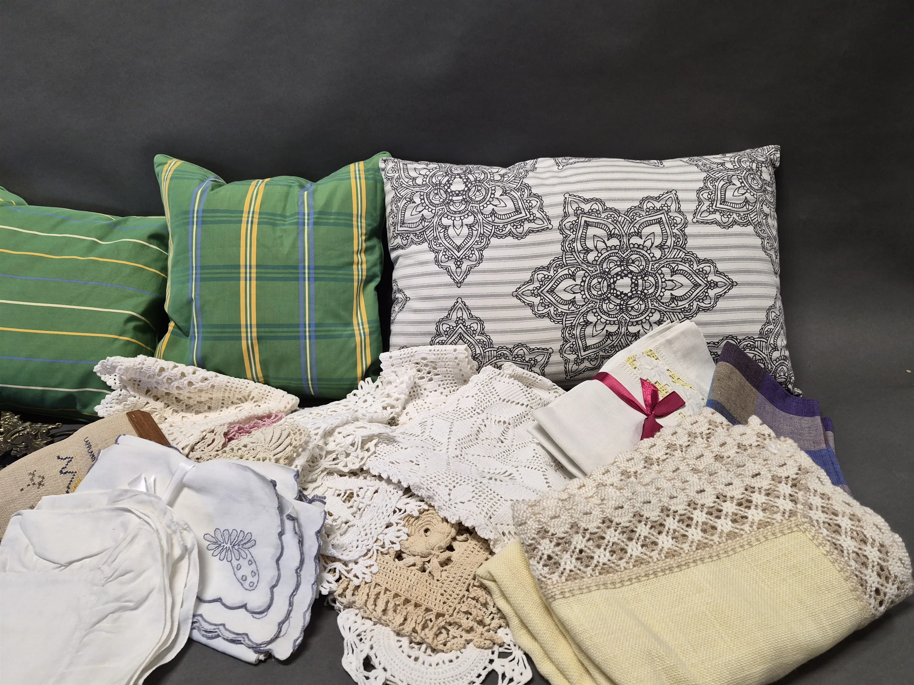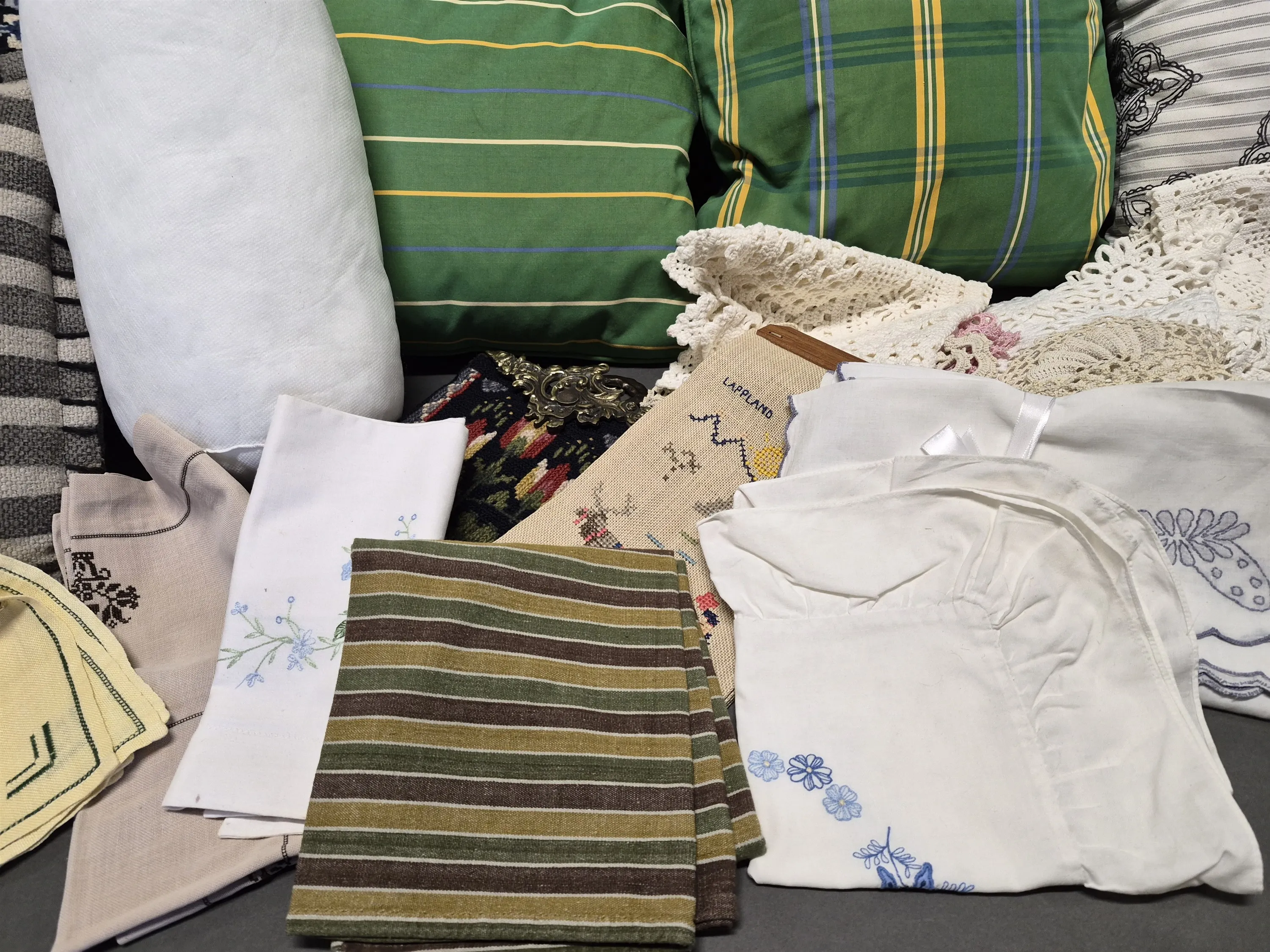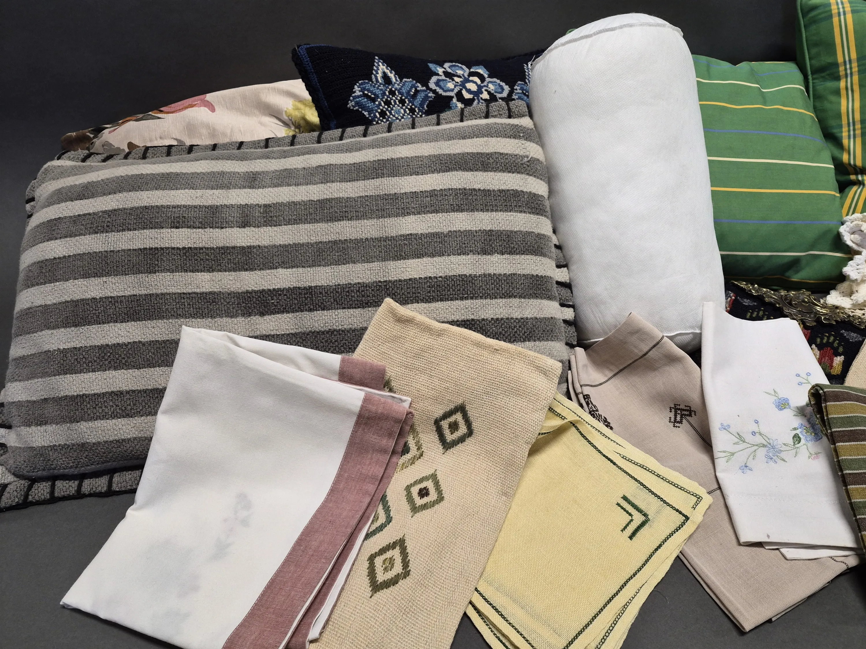 17929. Parti dekorationskuddar och handarbeten bla virkat