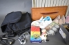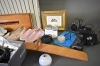 6959. Parti diverse bla träbricka, elektronik och massagedyna, högsta höjd på bild 46 cm