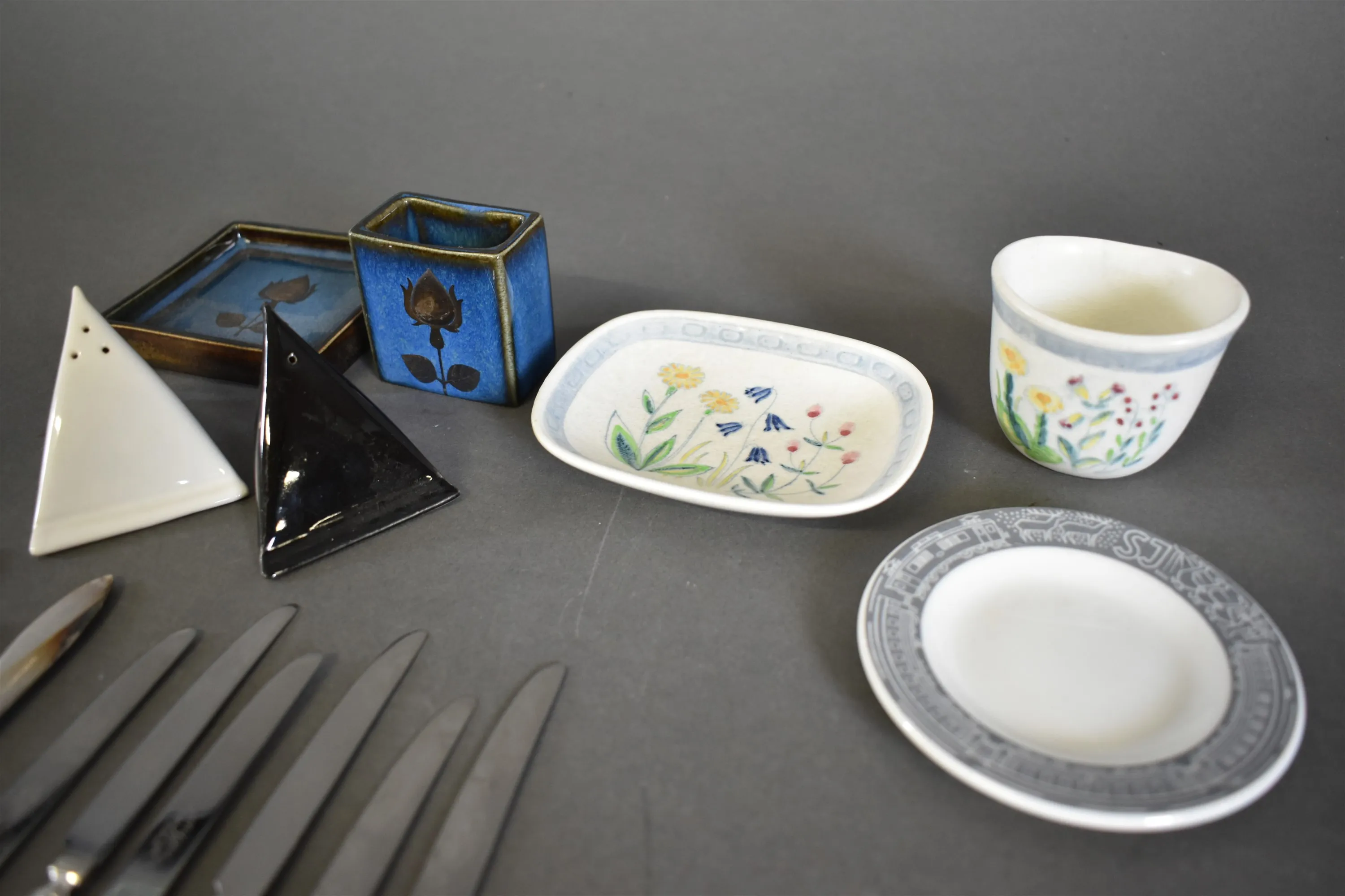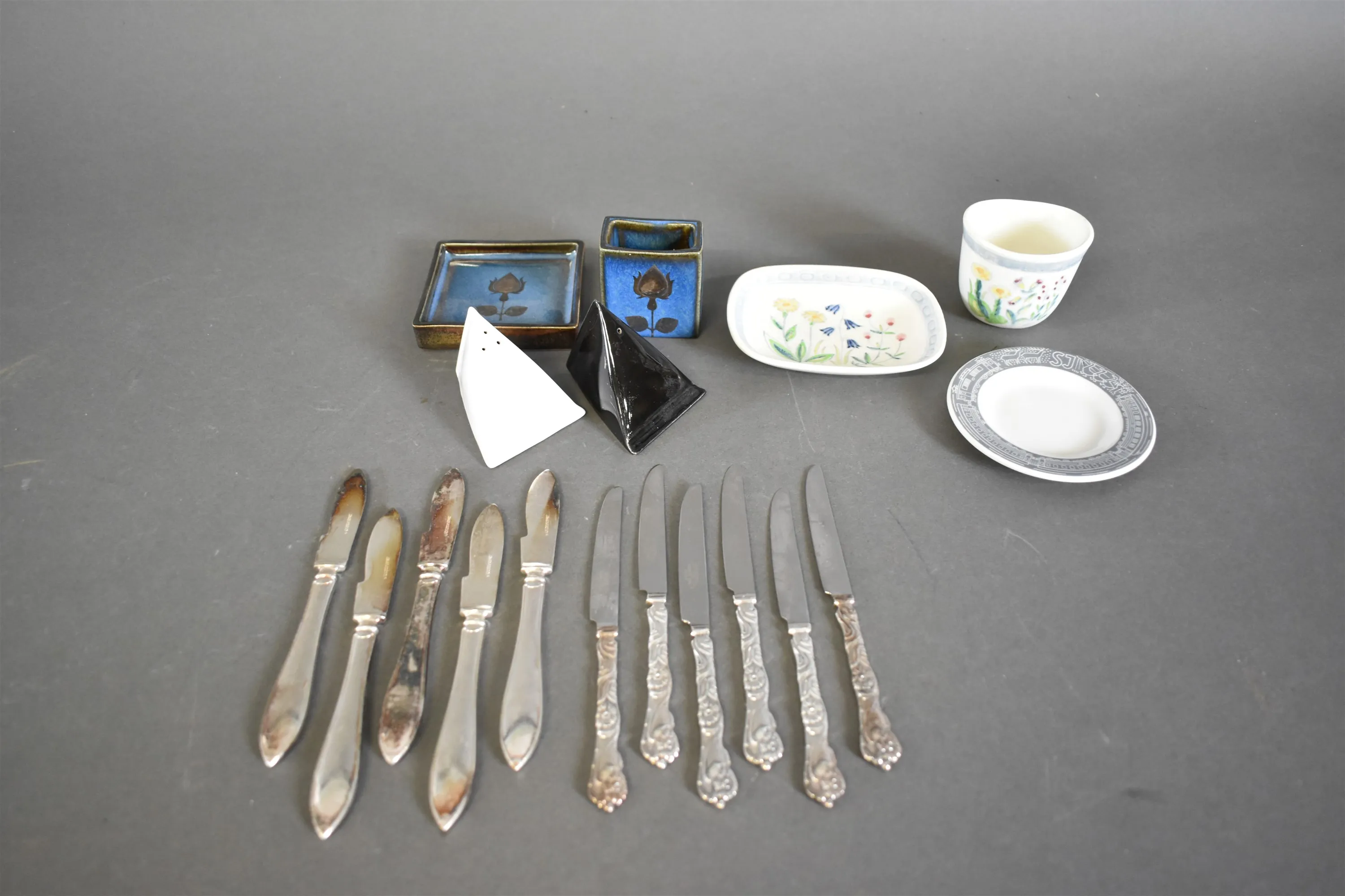 15657. Parti diverse porslinsfat bl.a Rörstrand och nysilver knivar, längsta mått på knivar 16 cm