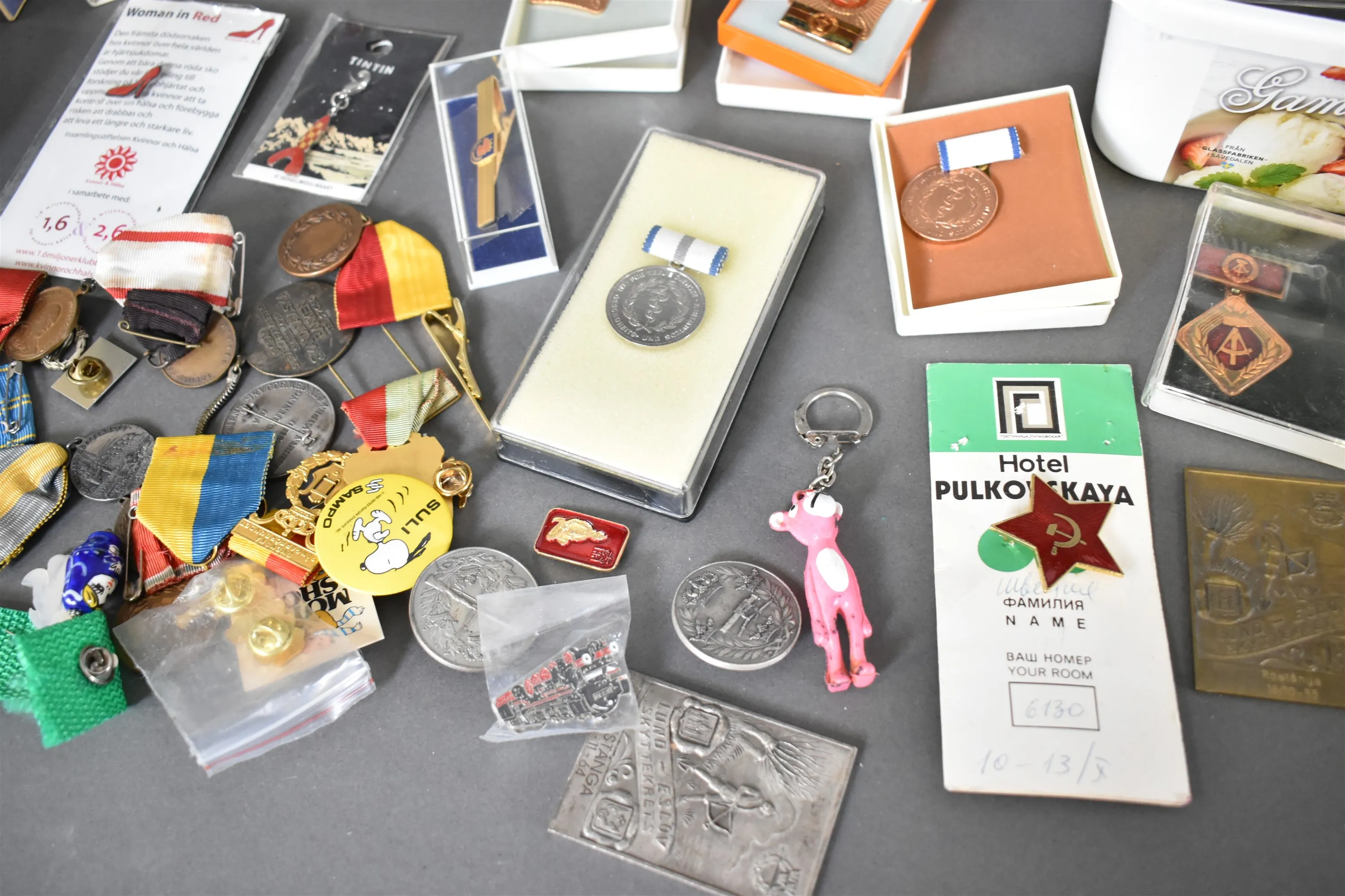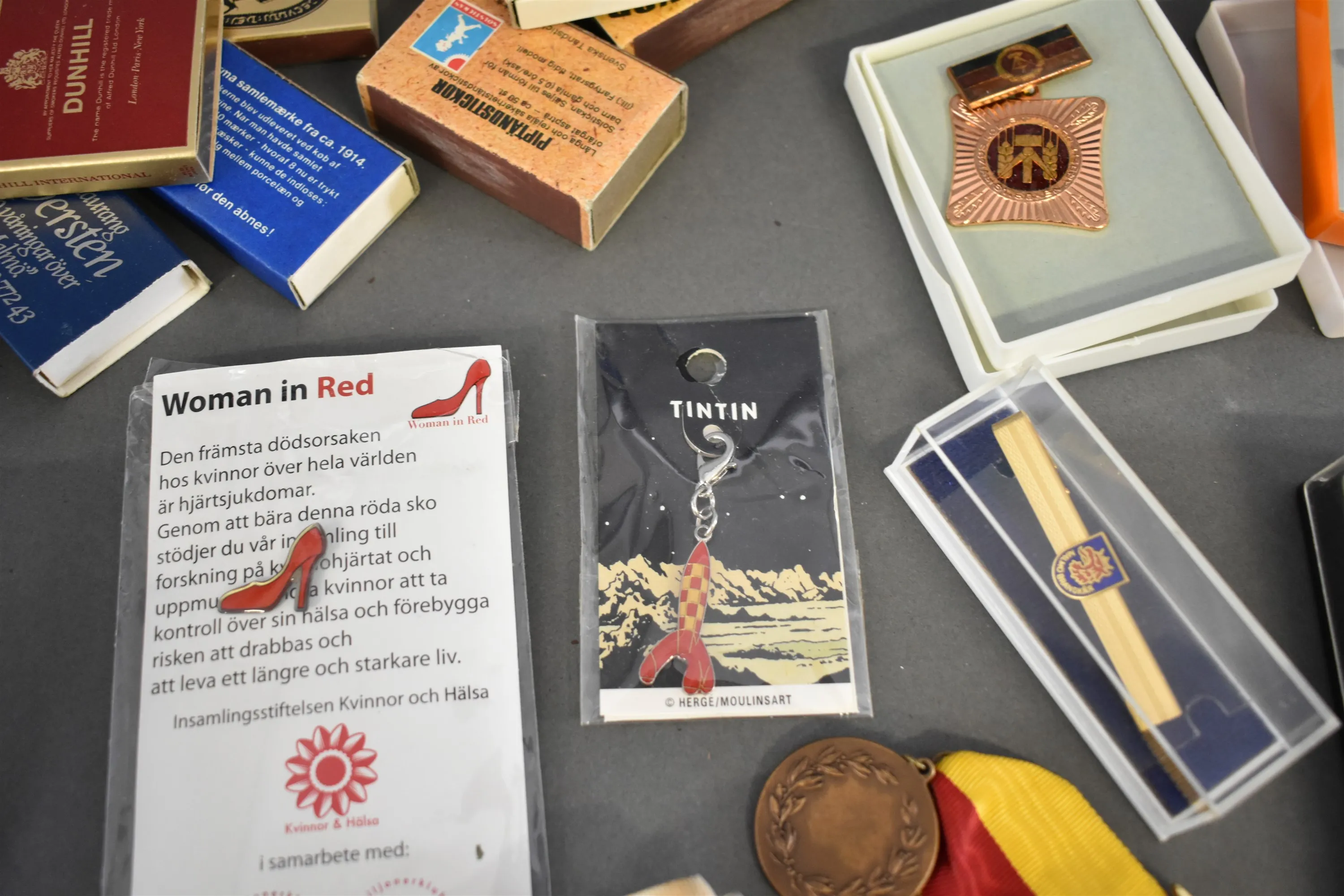 14882. Parti diverse samlarsaker bla pins, mynt och tändsticksaskar