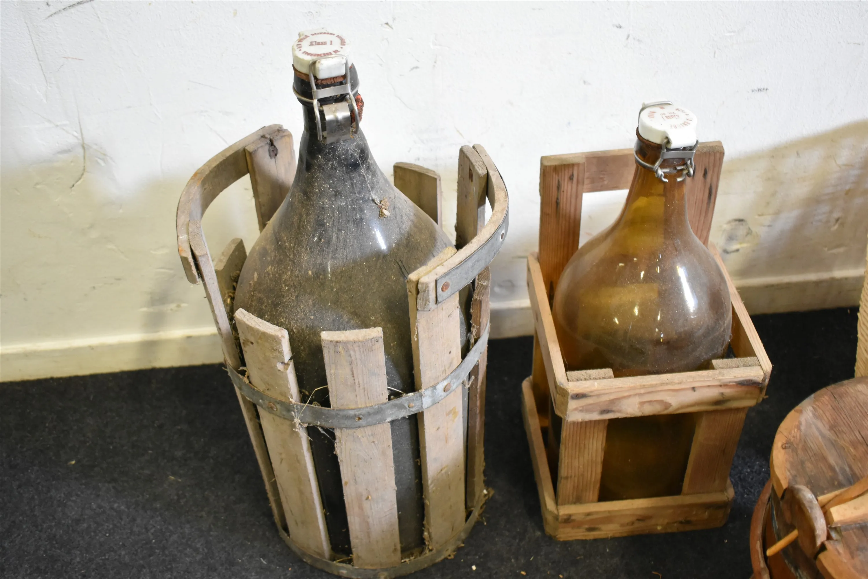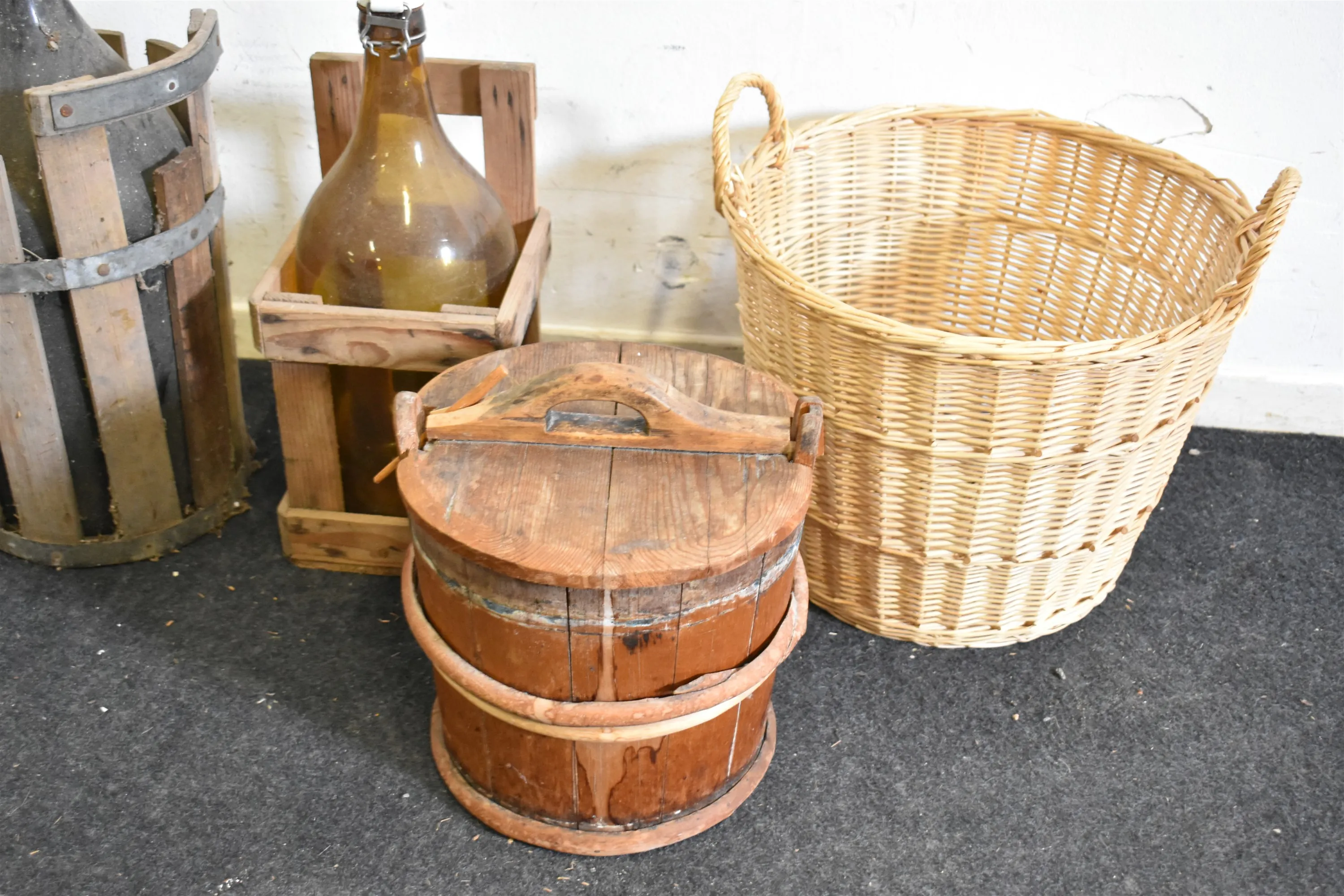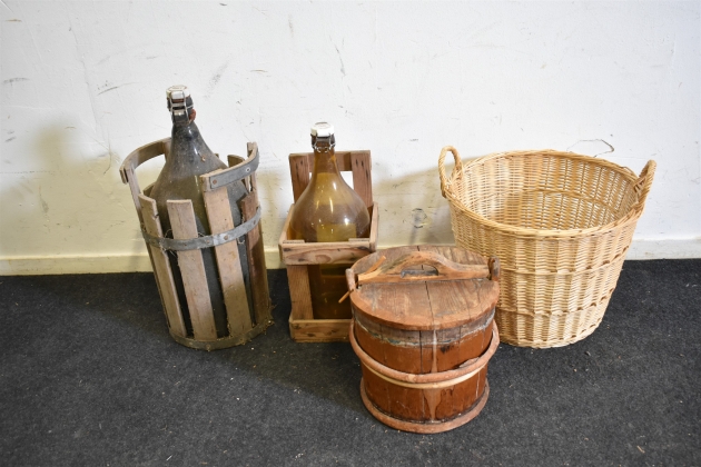 16827. Parti drickaflaskor i ställ 2 st, korg och laggat kärl med lock, högsta höjd 57 cm