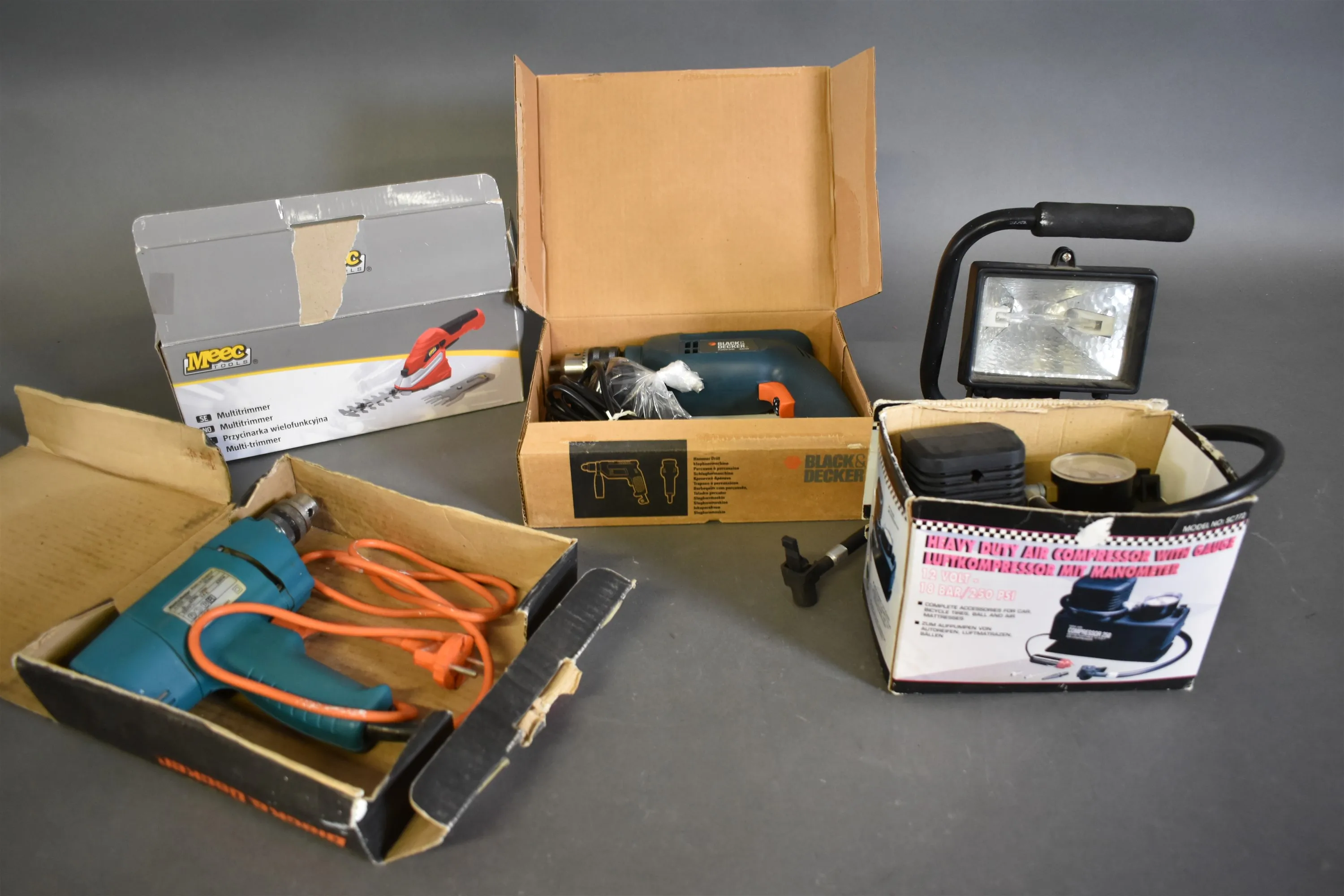 16498. Parti elverktyg bla minikompressor (slang defekt) och slagborrmaskin