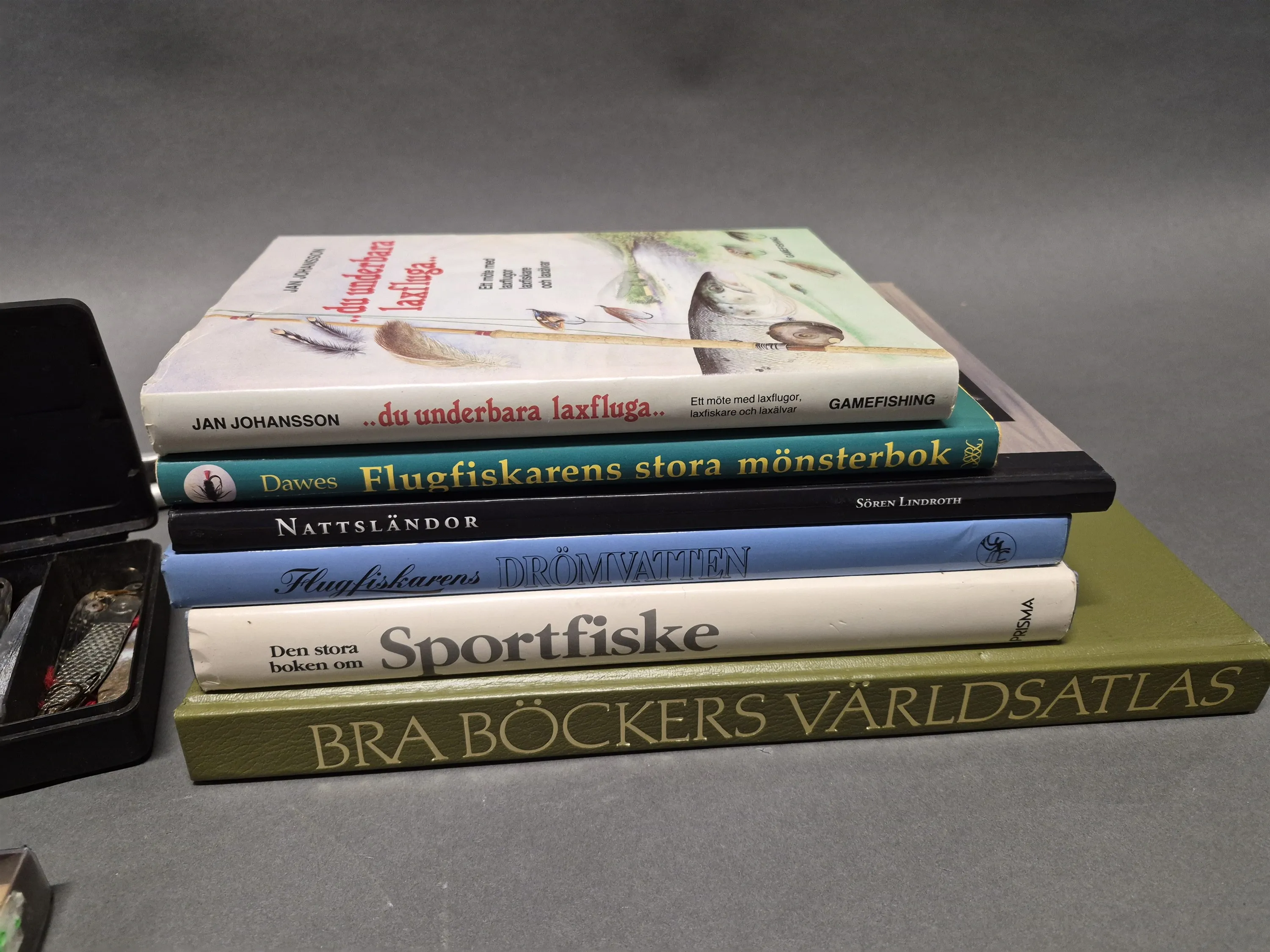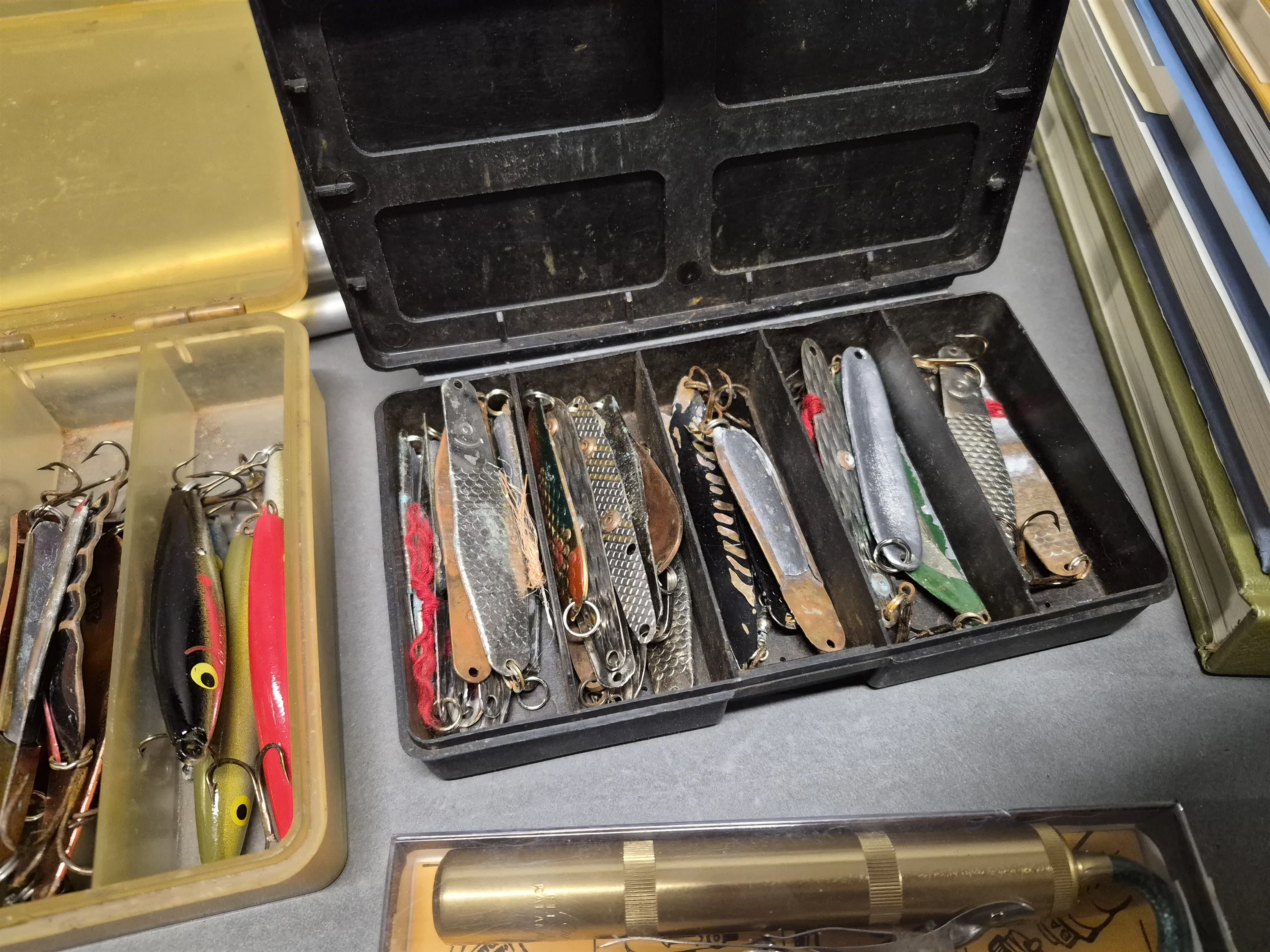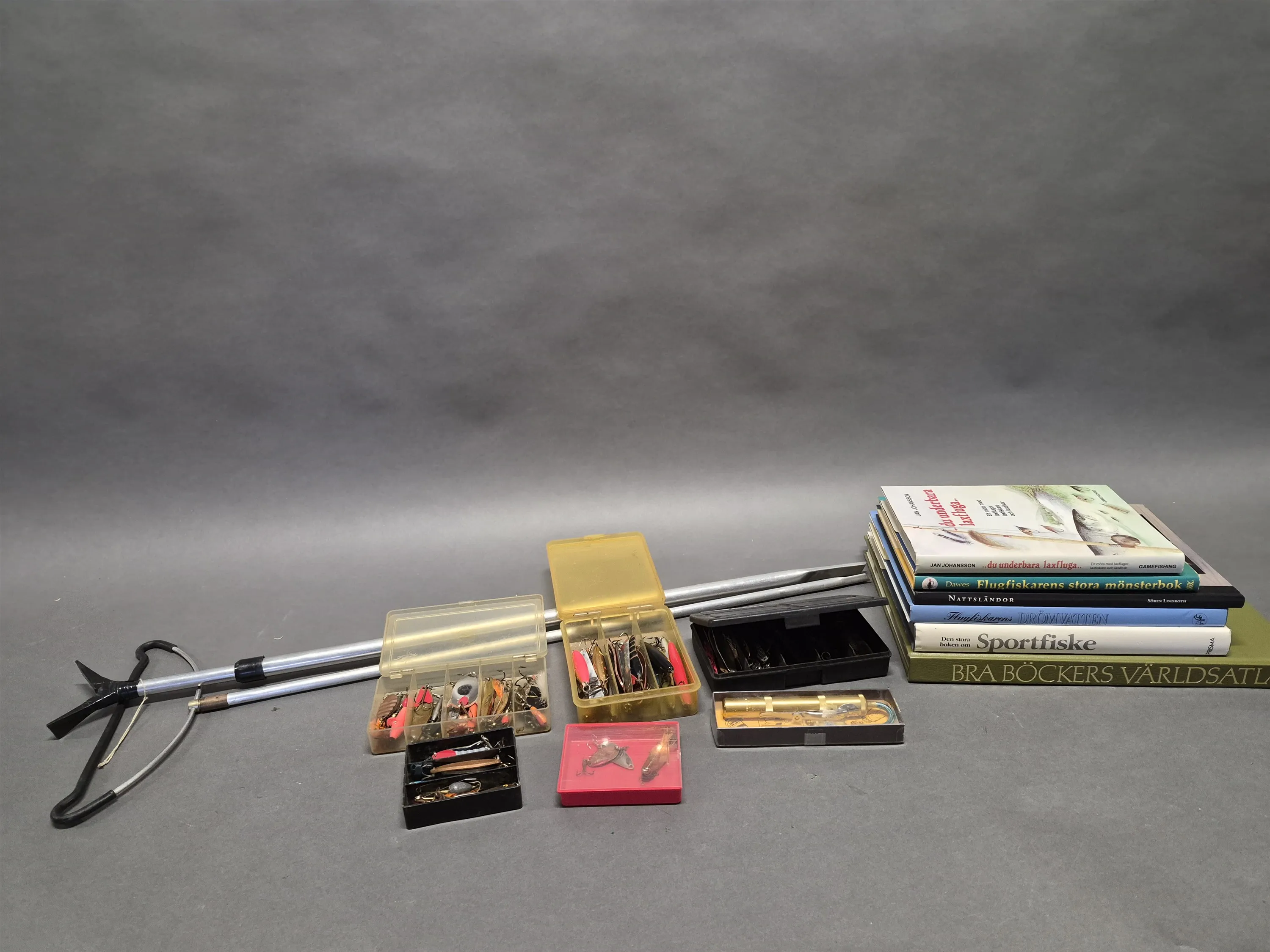 17867. Parti fiskeutrustning bl.a fluglampa, fiskedrag och böcker, längsta mått 85 cm