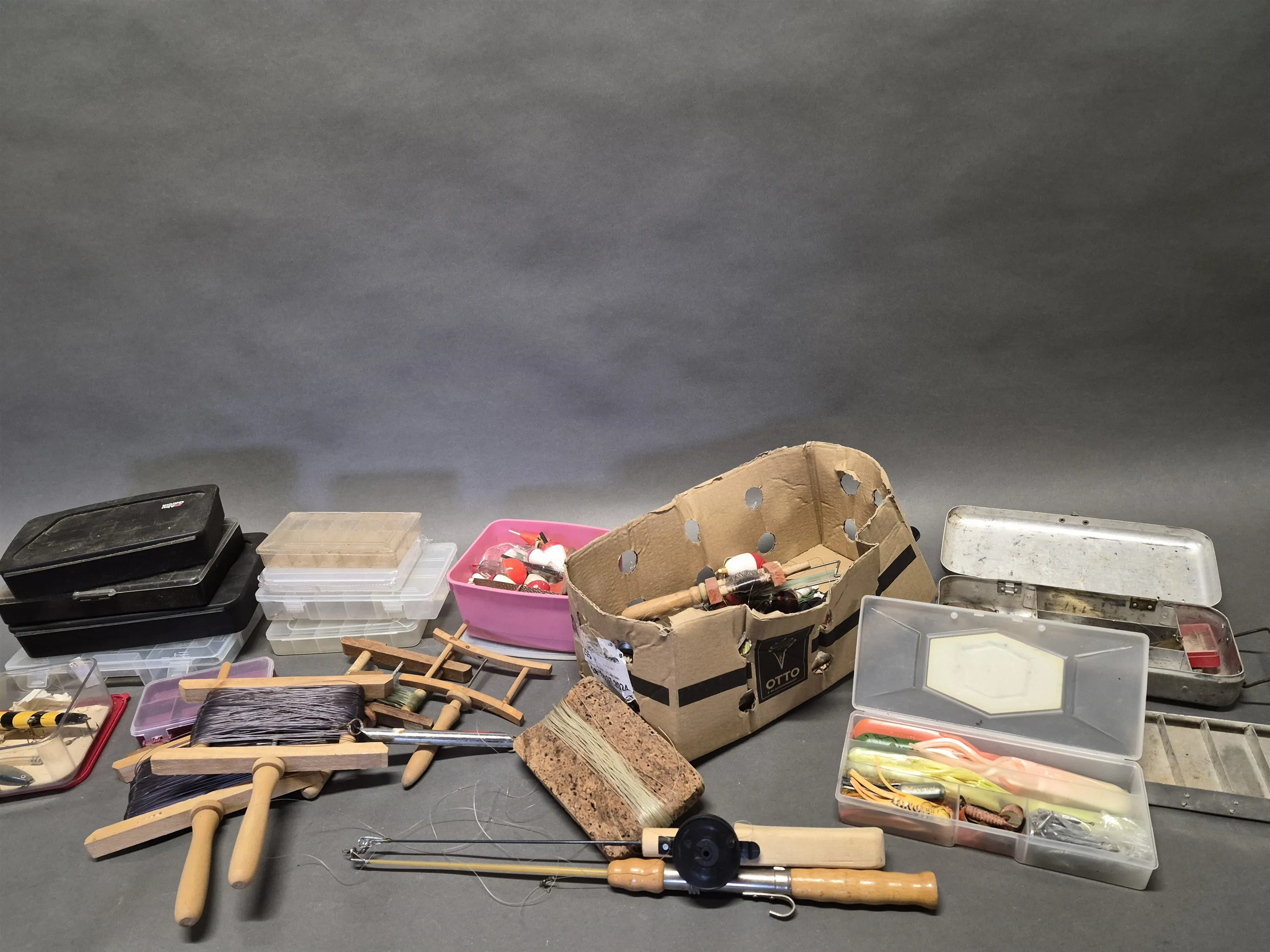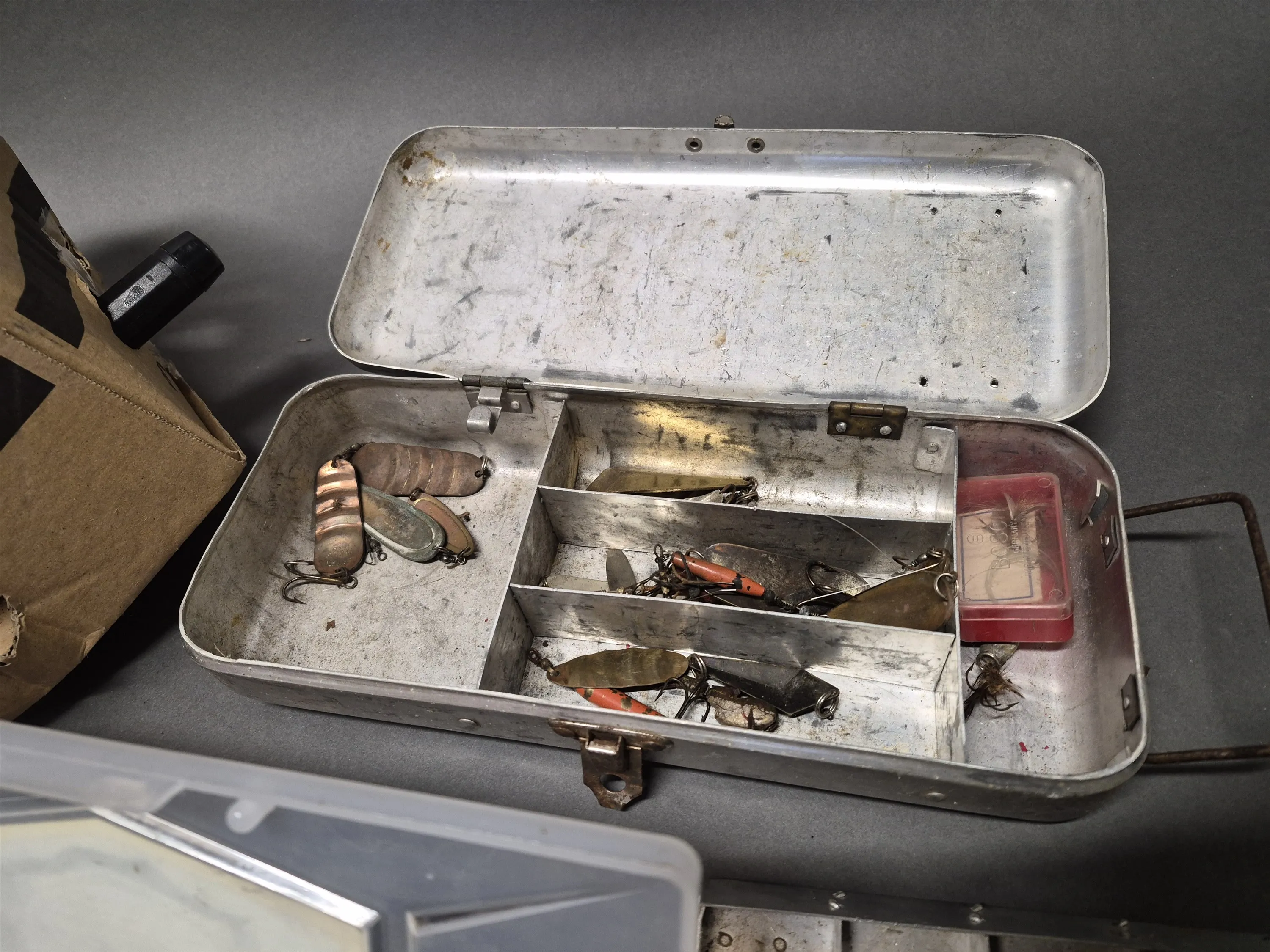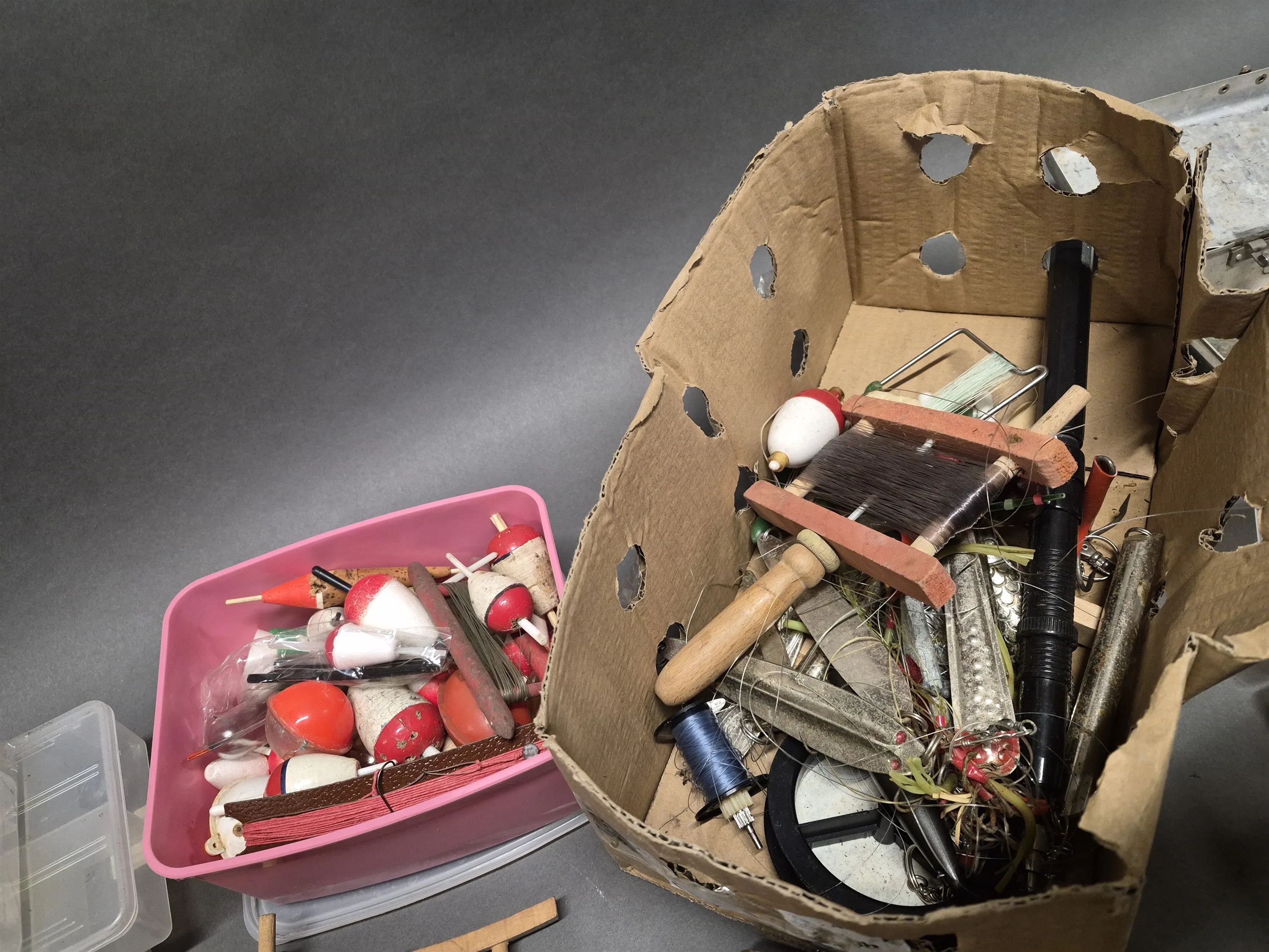 18049. Parti fiskeutrustning bla drag, flöten och sortimentslådor, längsta mått 54 cm