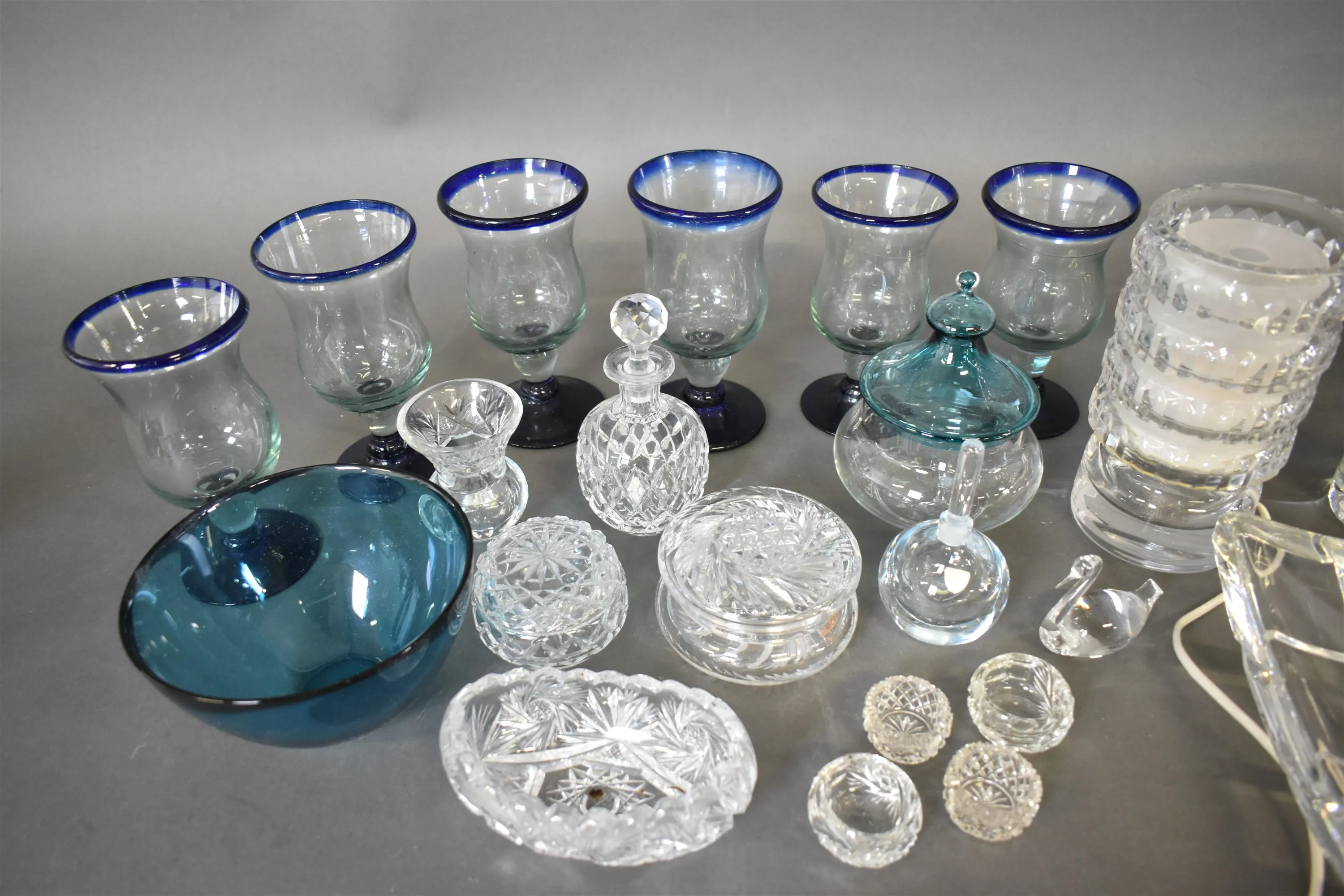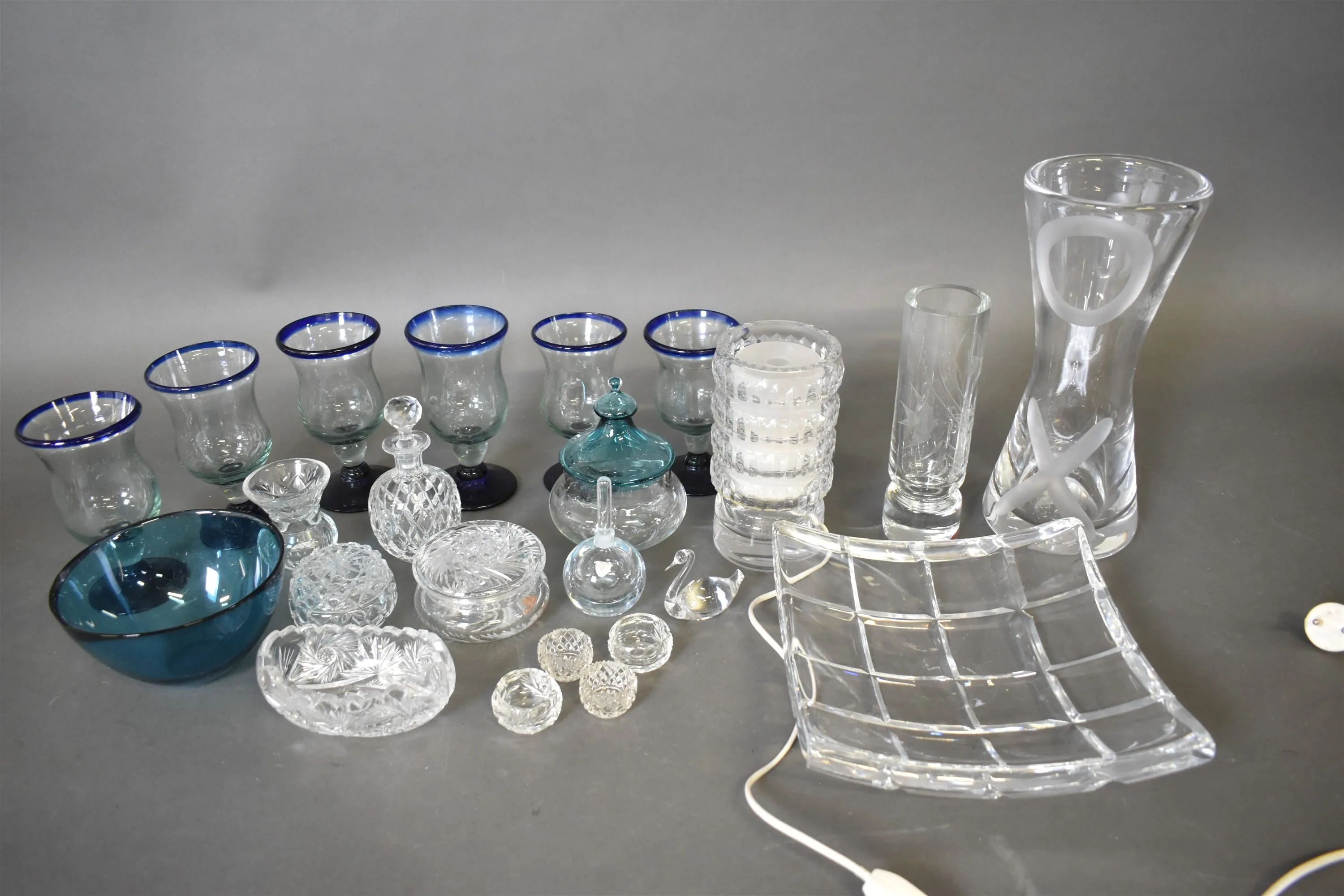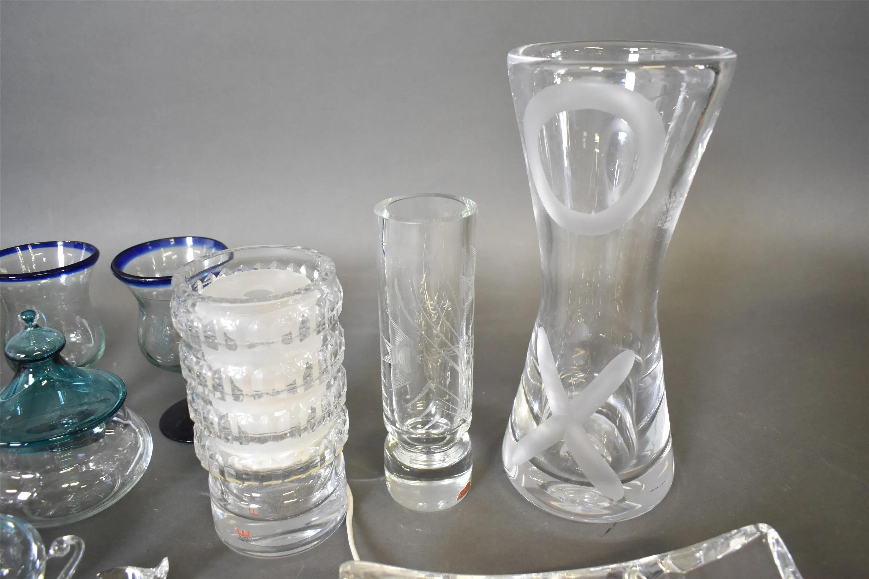 13420. Parti glas bl. vas & bordslampa Kosta Boda & fat Orrefors högsta 32 cm