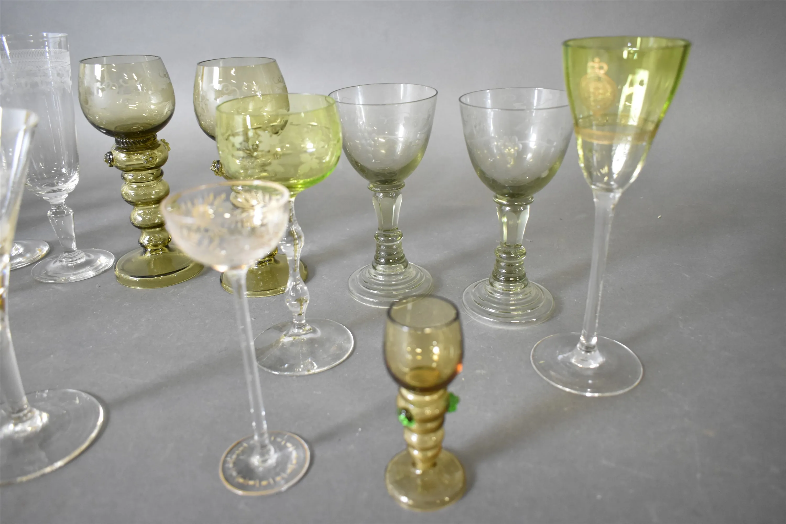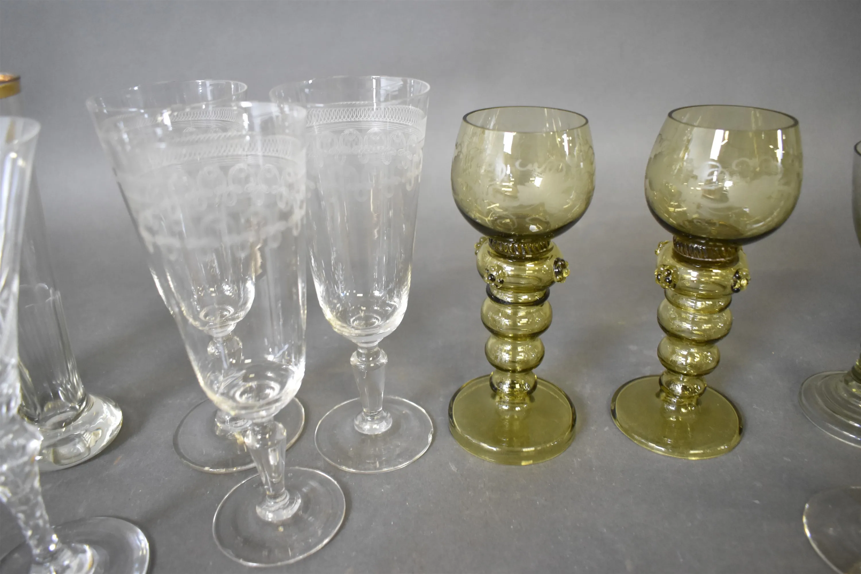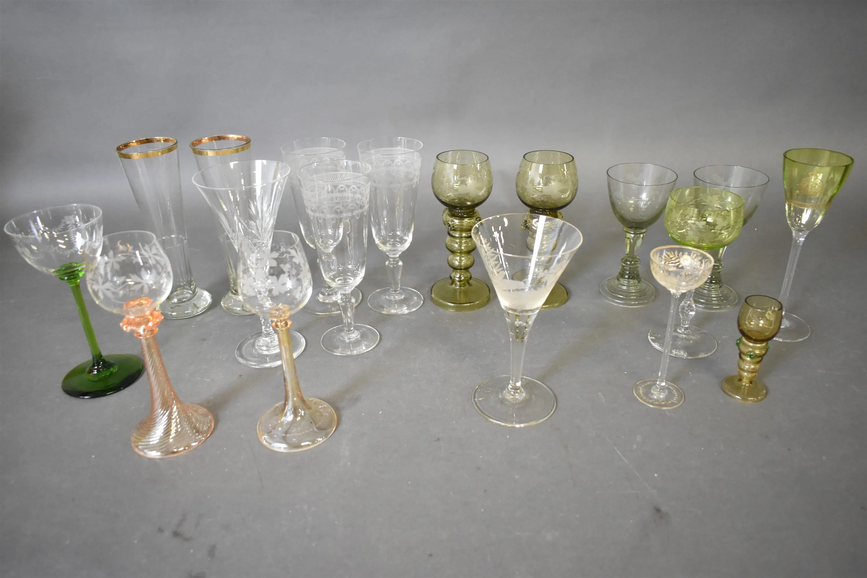 16211. Parti glas, bl.a remmare & vinglas med gulddekor, högsta 20 cm