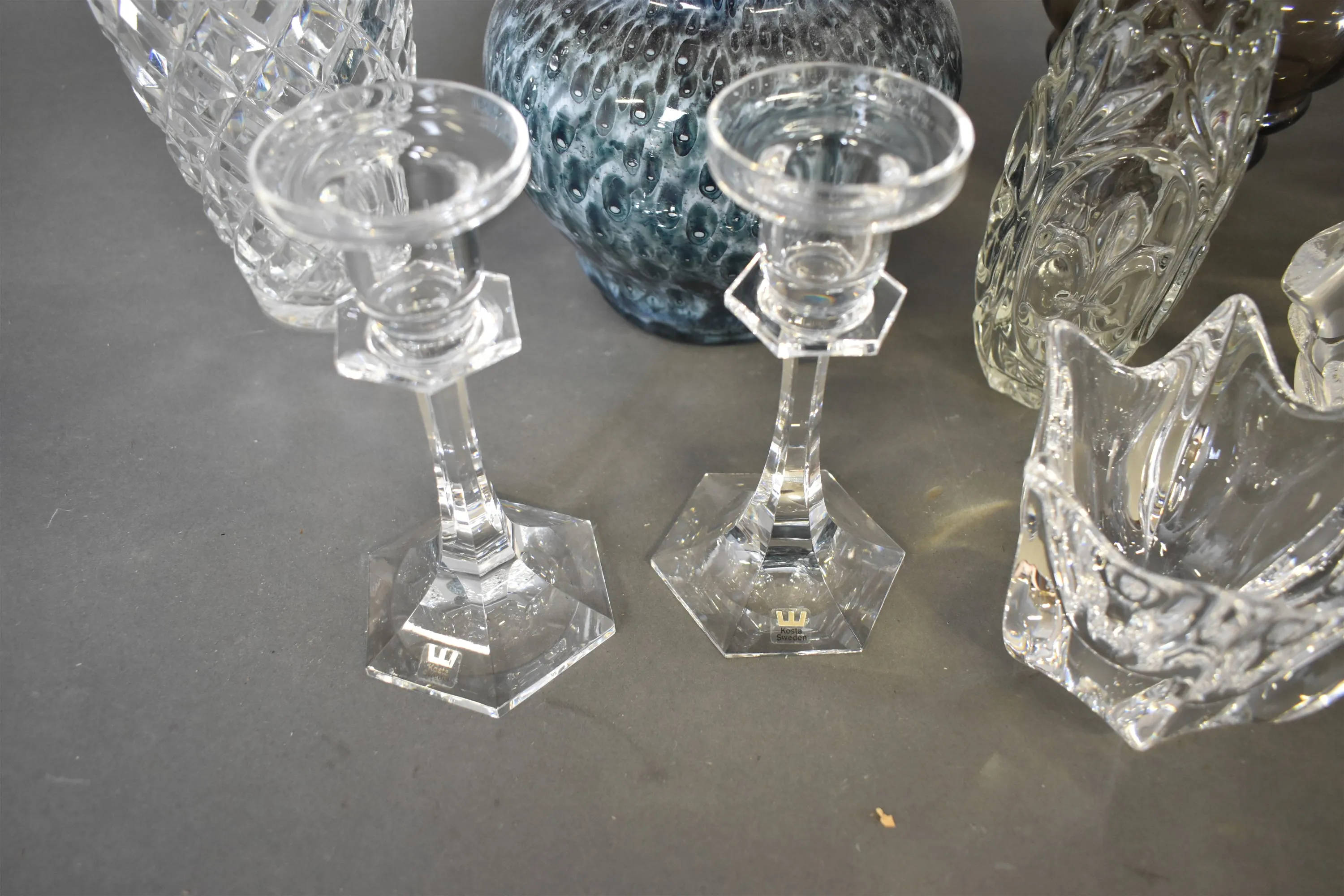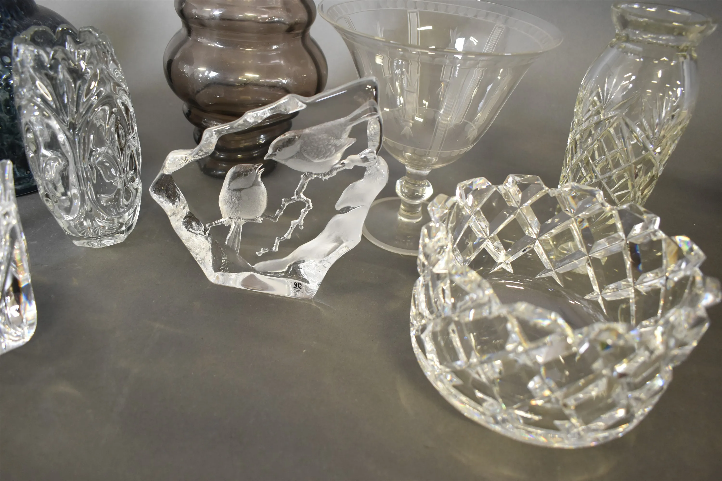 13364. Parti glas bl.a skål, Sofiero, glasdekoration Mats Jonasson & ljusstakar Kosta högsta 27 cm