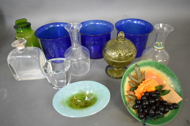 15541. Parti glas, bl.a skålar, blått glas, karaffer Orrefors högsta 23 cm