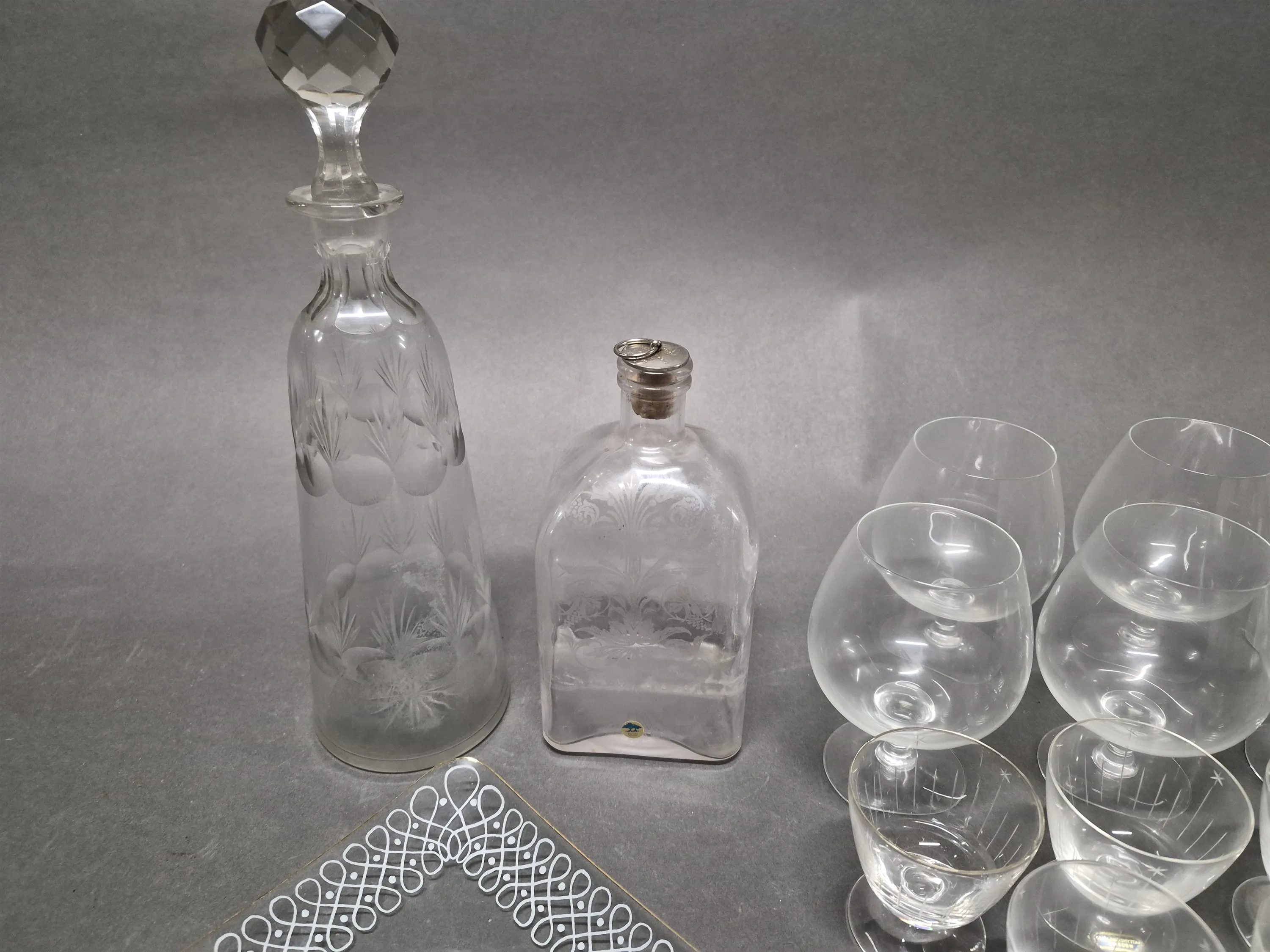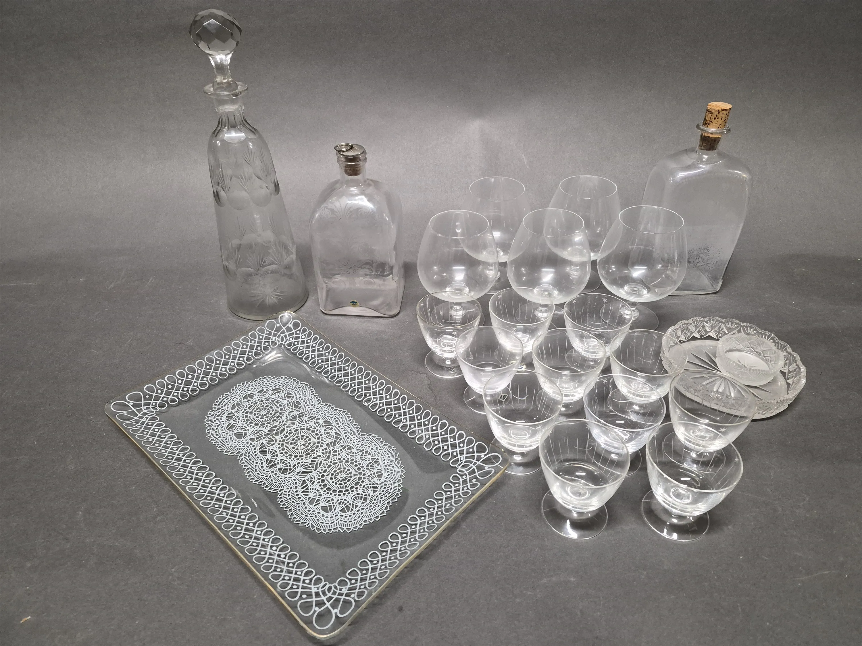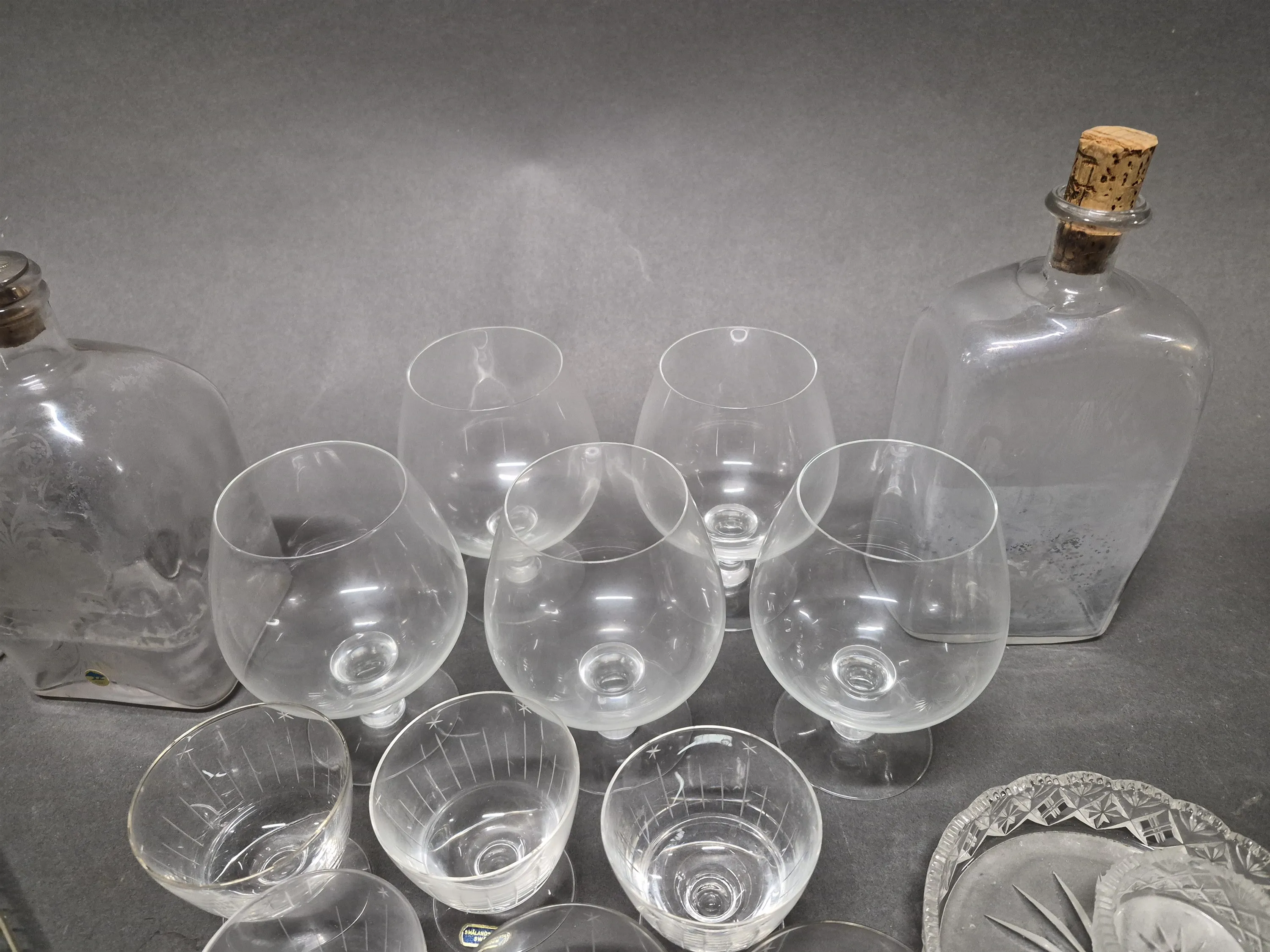 19527. Parti glas, bla cognacskupor & brännvinsflaskor, högsta 32 cm