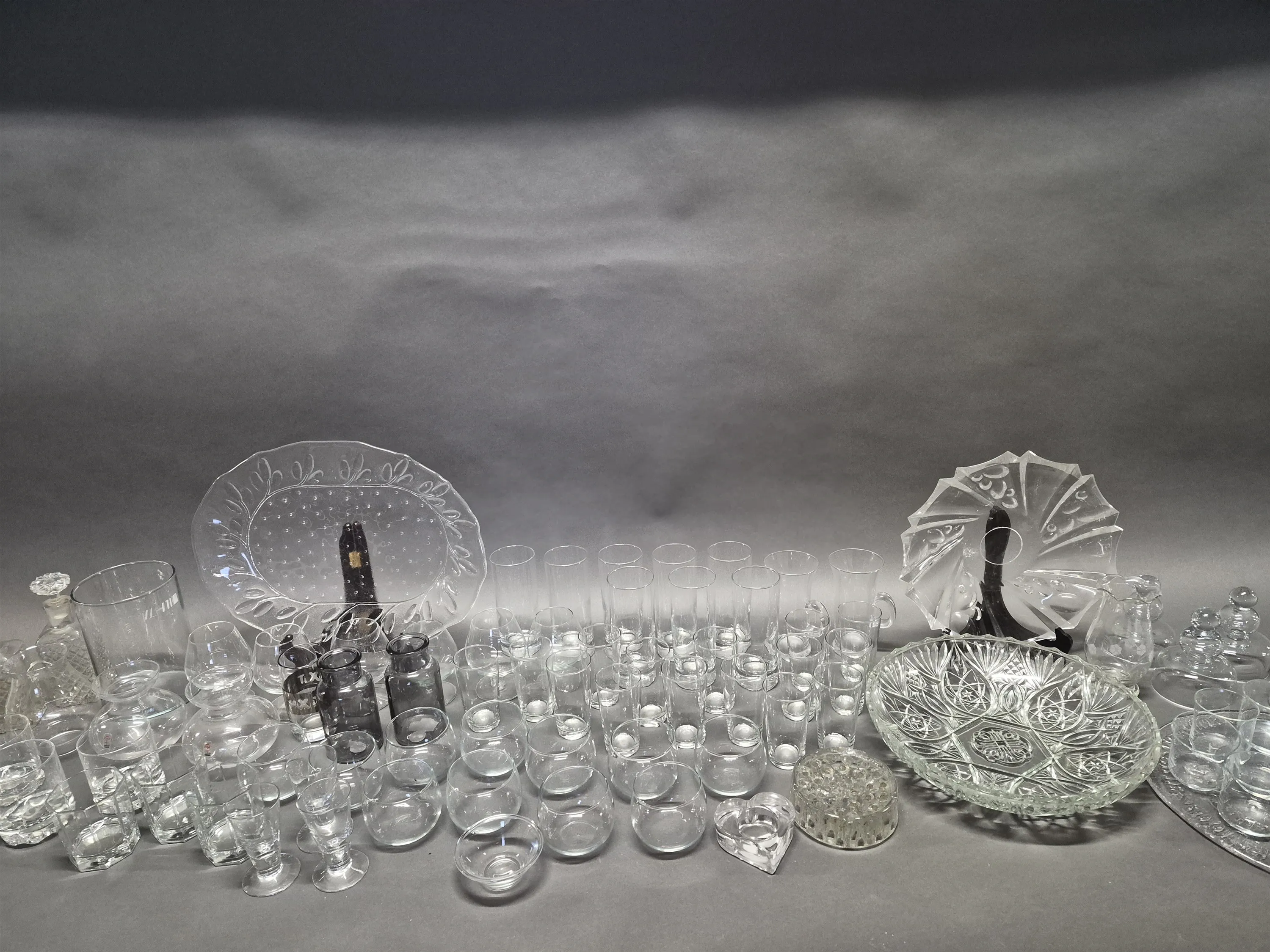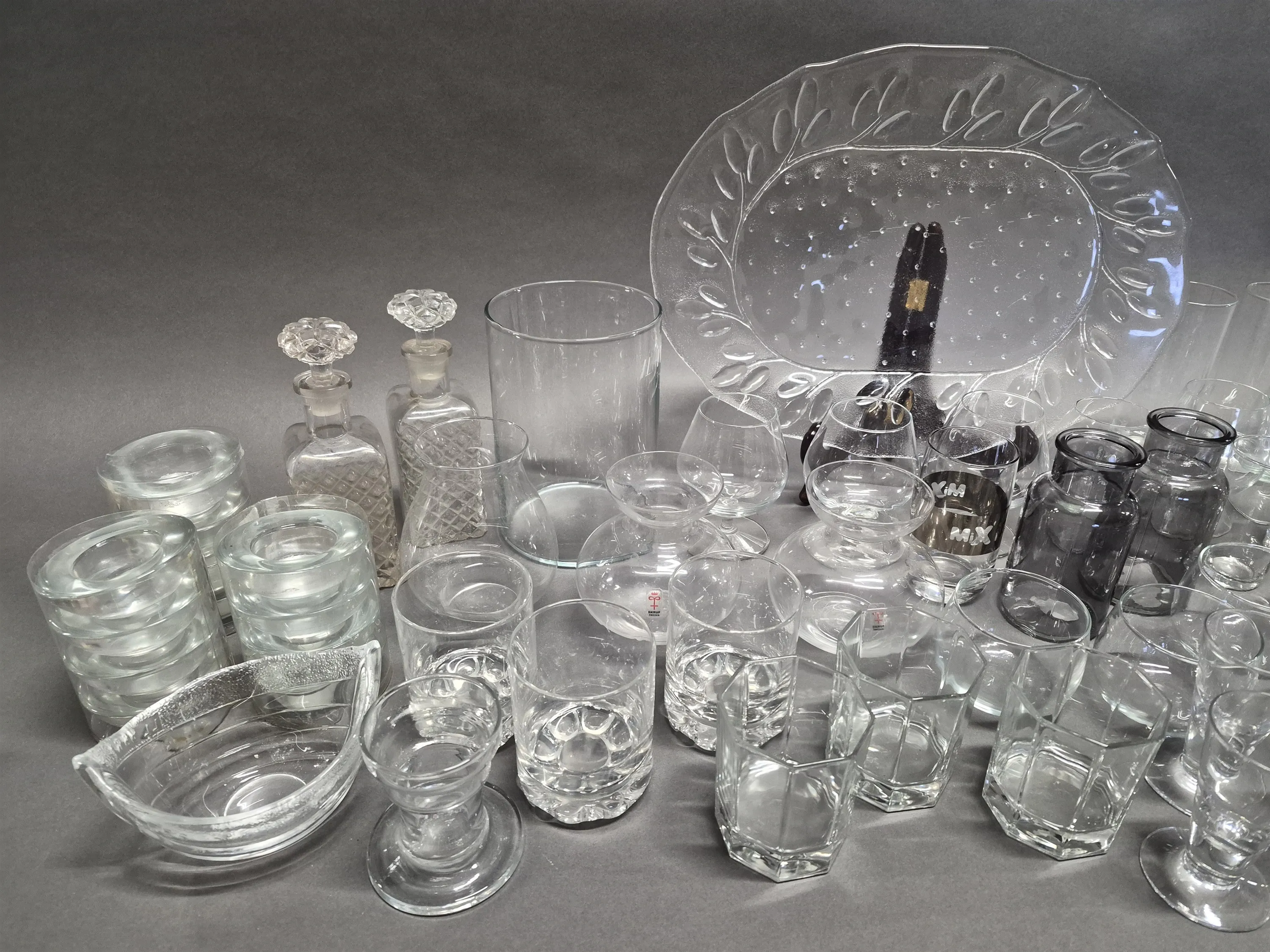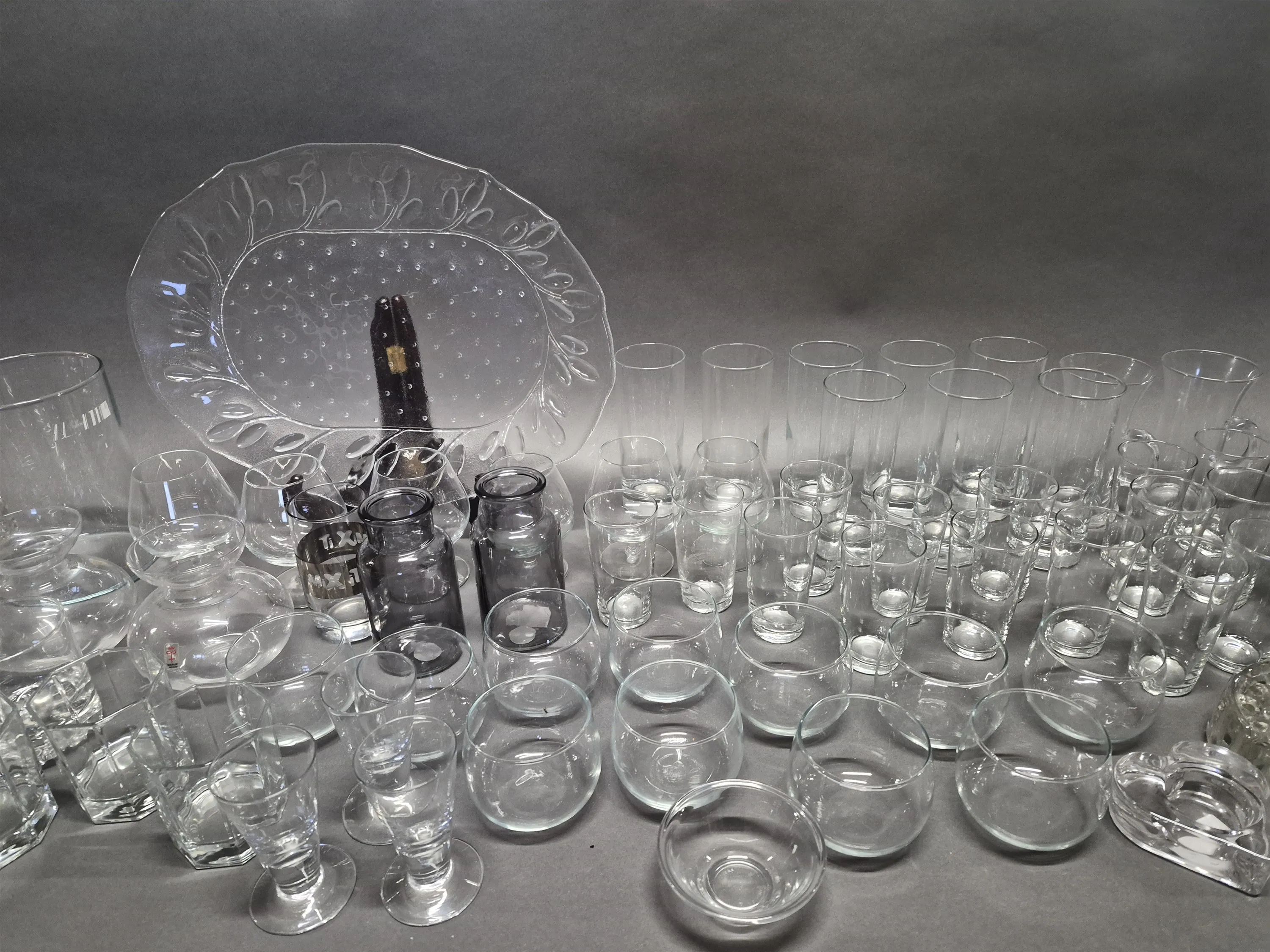18936. Parti glas bla highball glas, fatt och ljushållare, längsta mått 41 cm, 2 lådor
