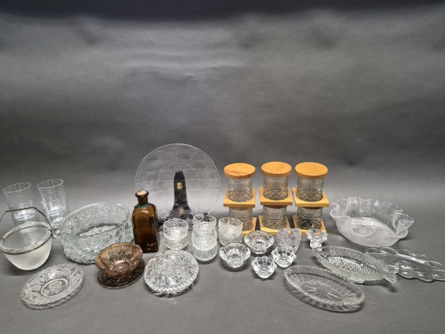 18862. Parti glas bla ljushållare och skålar, största diameter 29 cm
