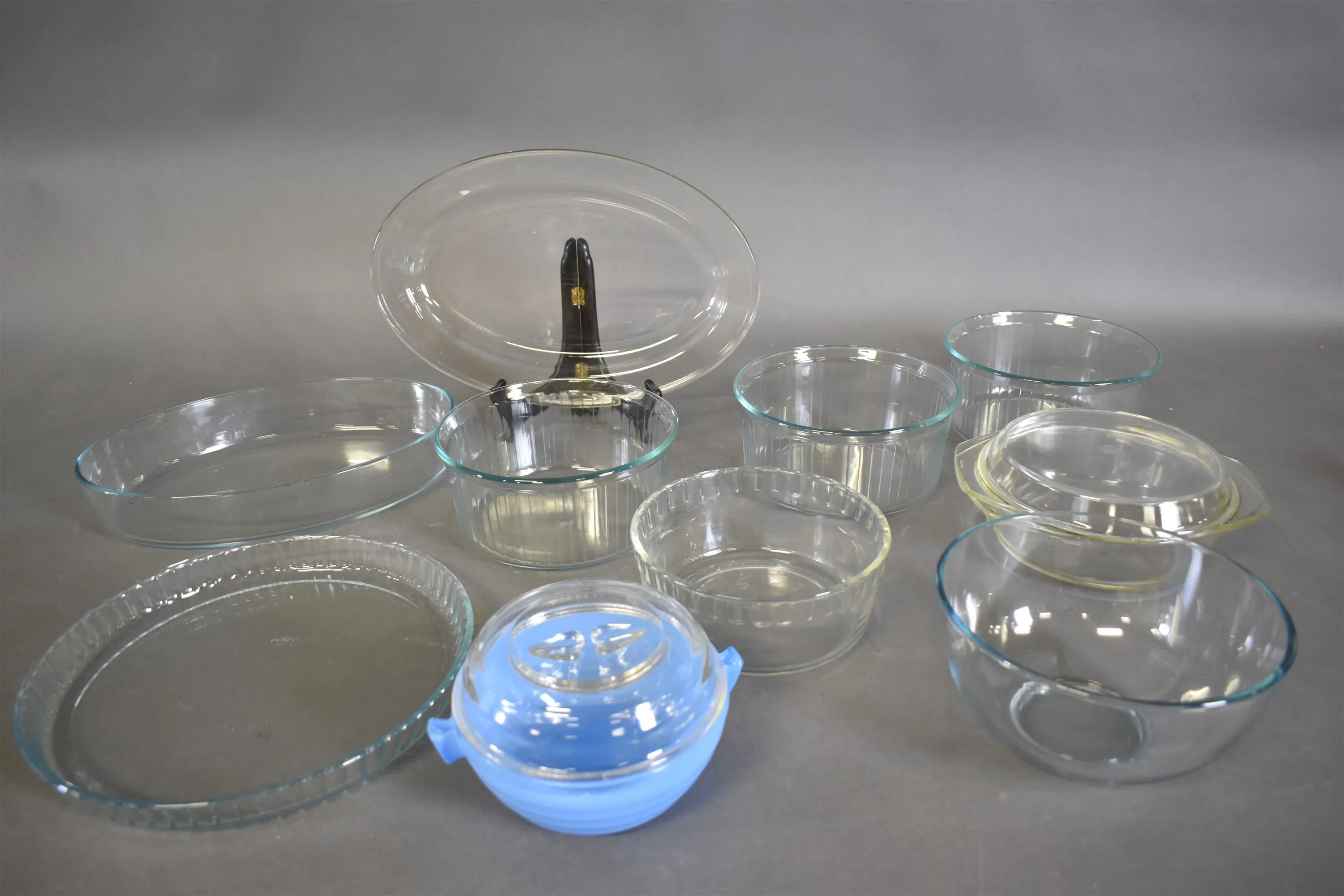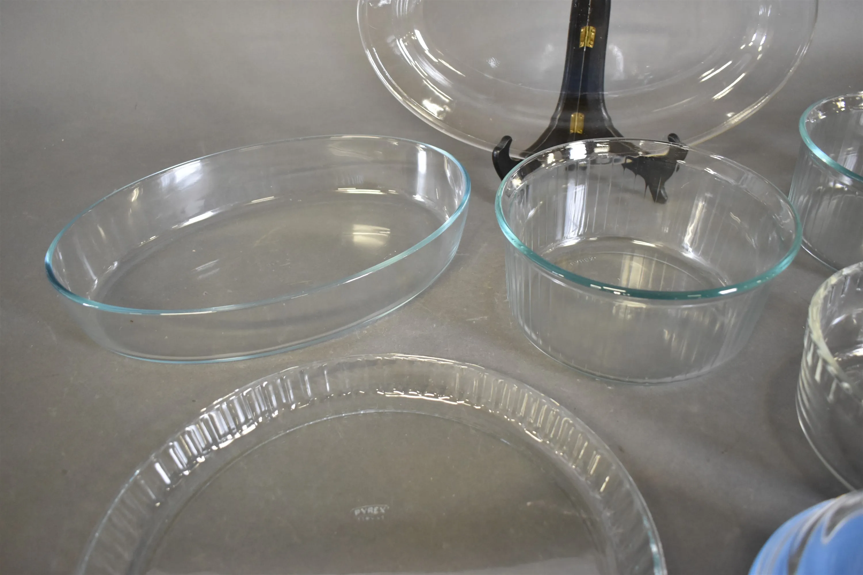 16682. Parti glas, Pyrex bla skålar och formar, längsta mått 40 cm