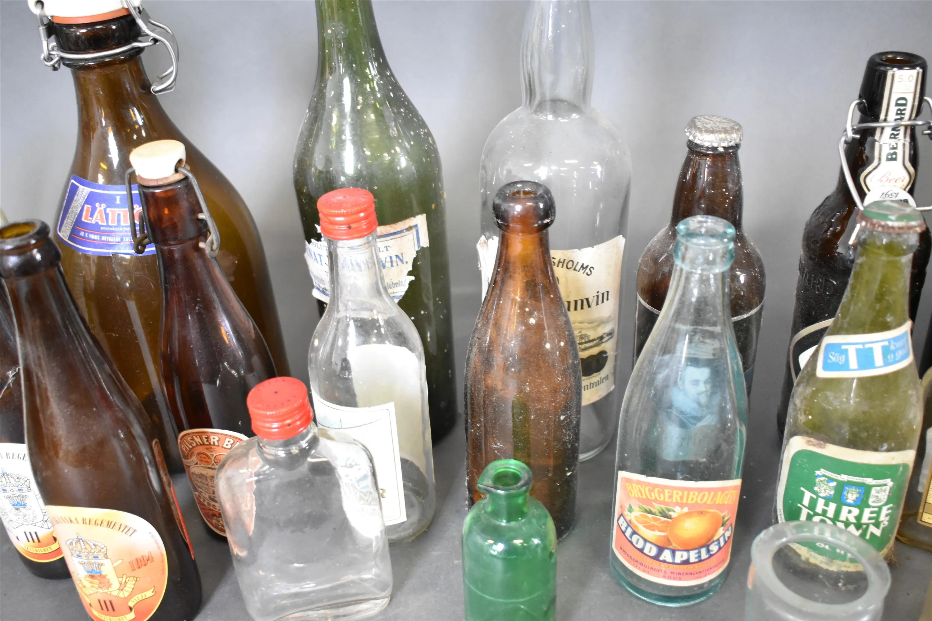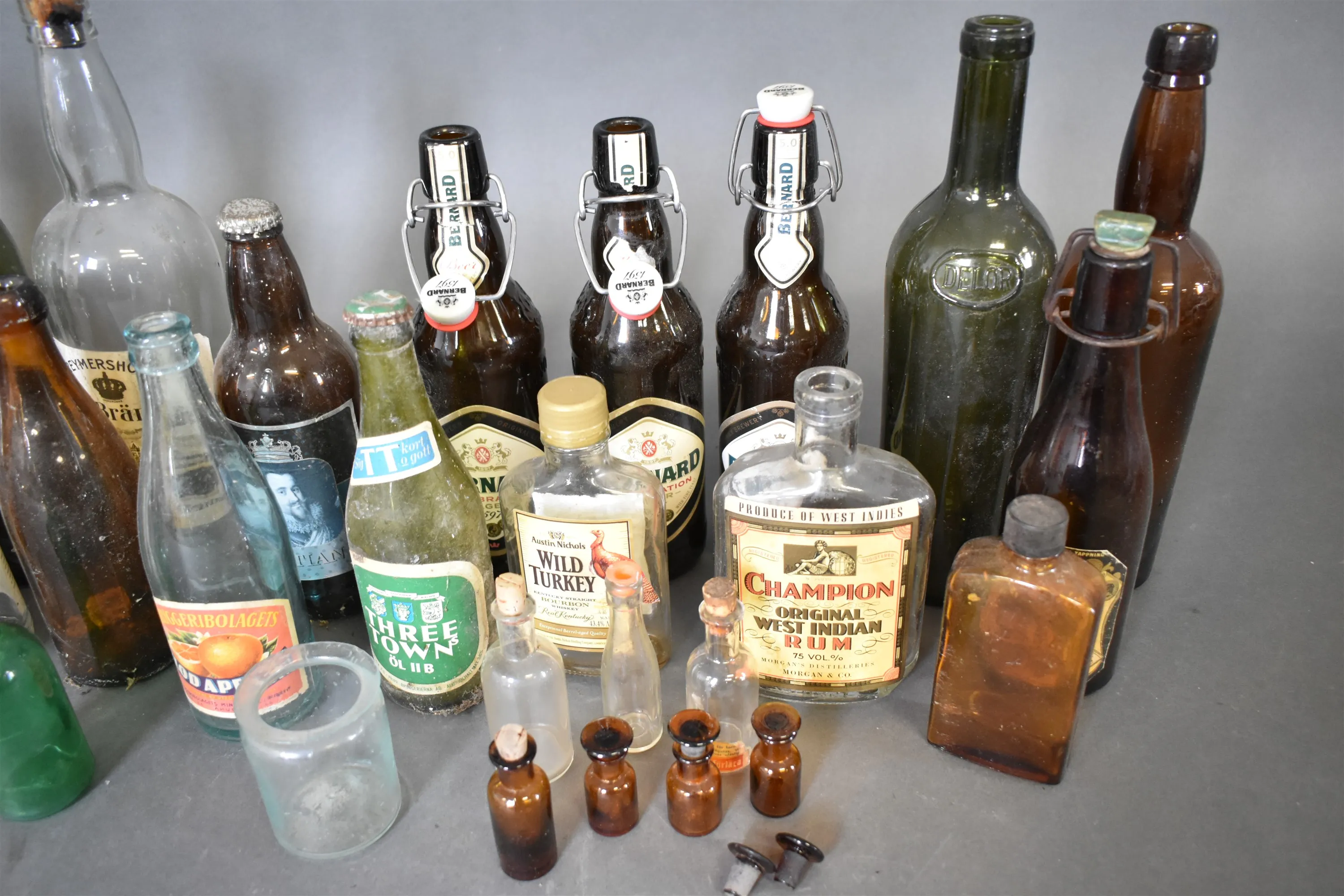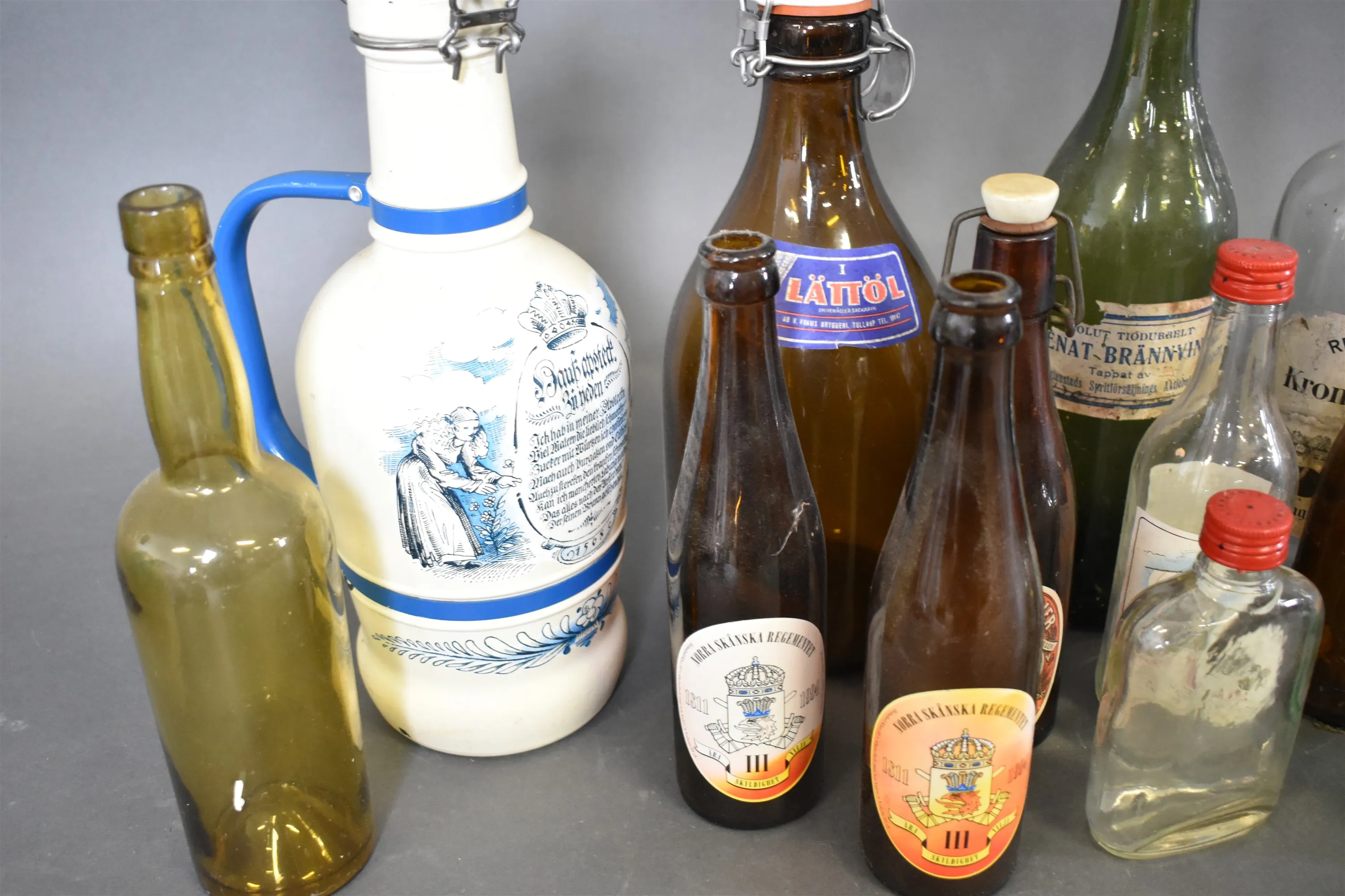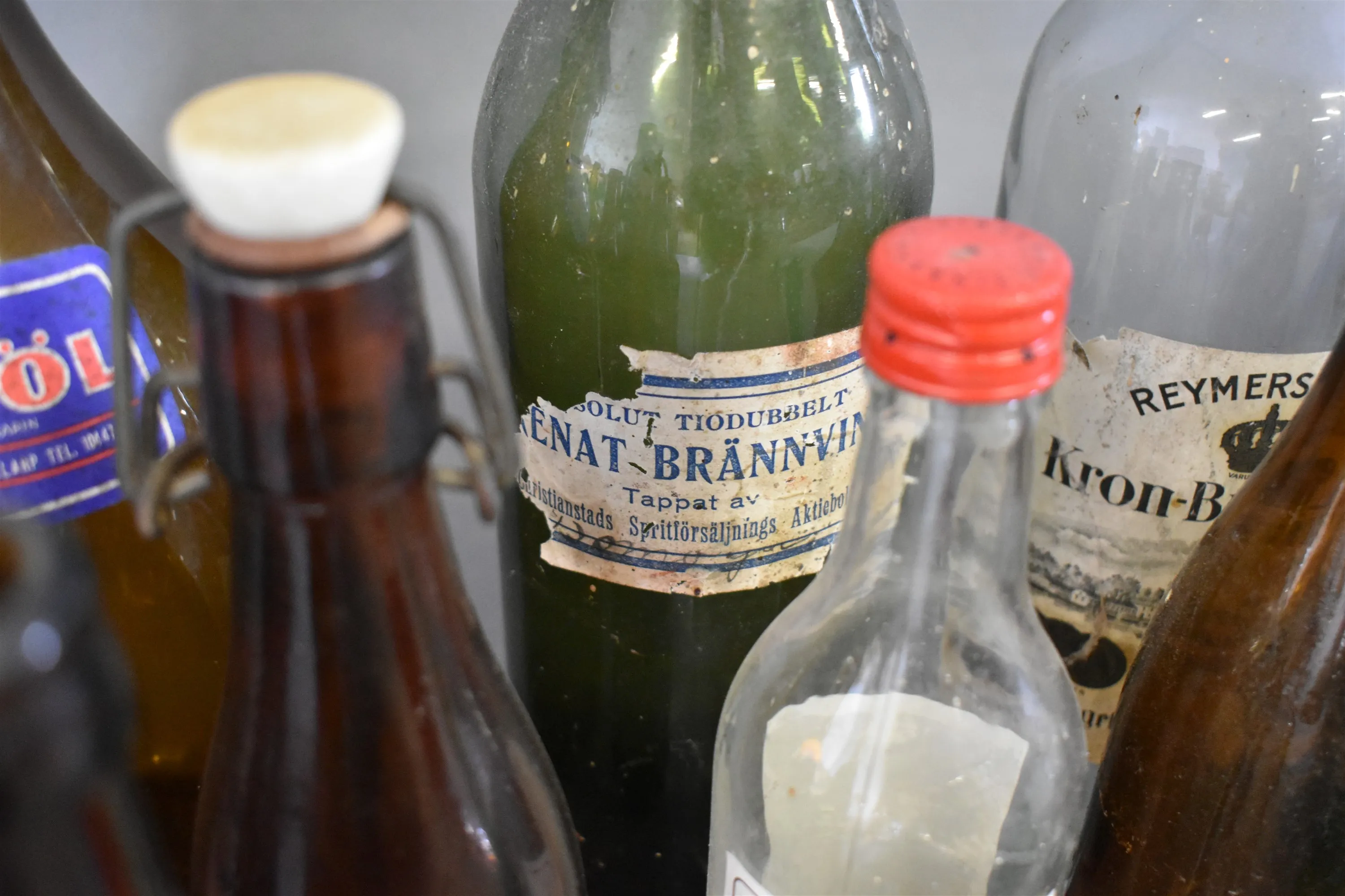10439. Parti glasflaskor mestadels med etiketter, högsta höjd 34 cm