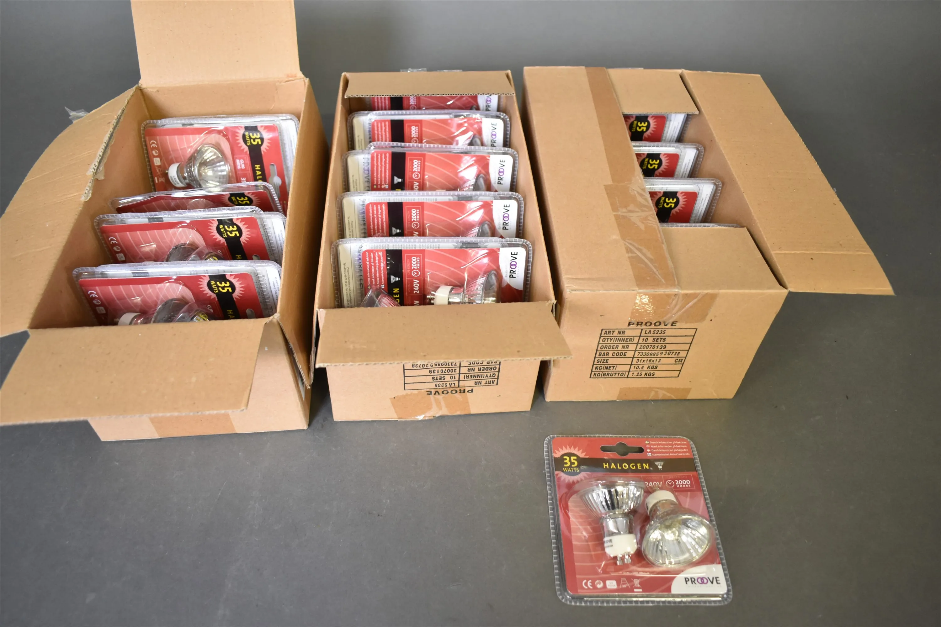 10257. Parti halogenlampor 35W 240V, 29 st förpackningar, 3 lådor