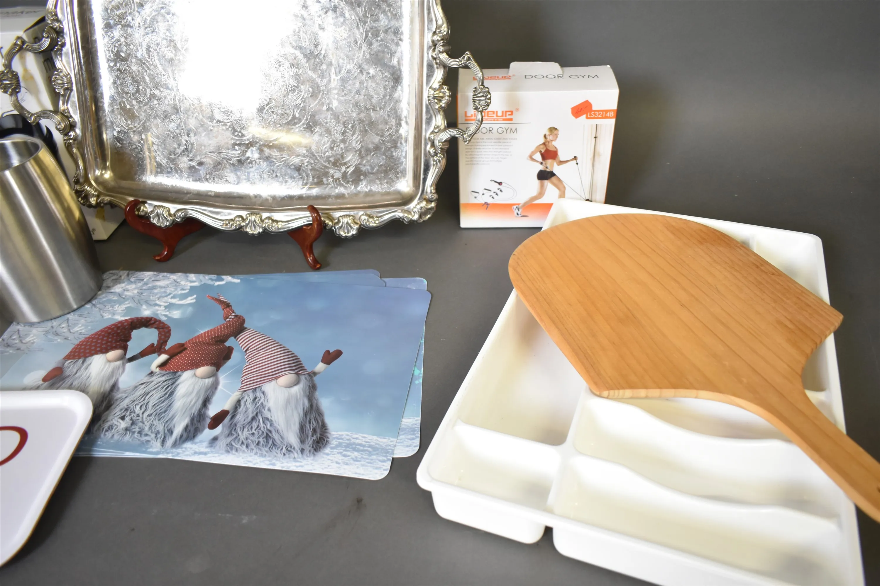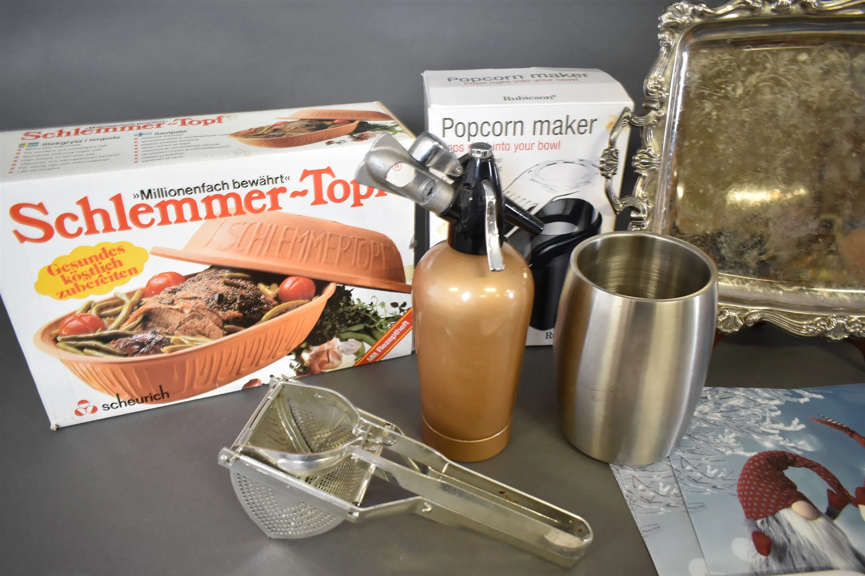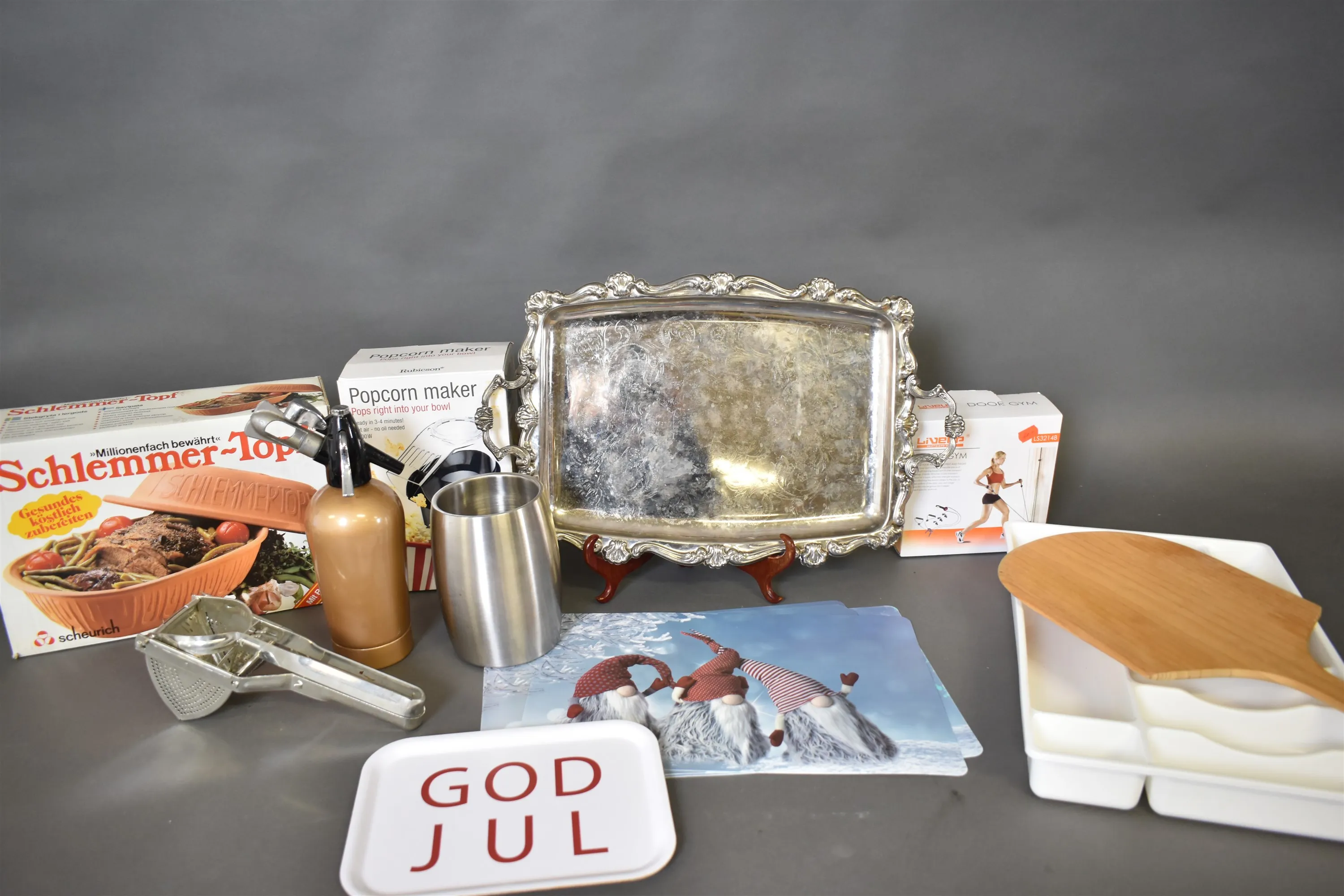 15380. Parti husgeråd bla serveringsbricka, sifon och lergryta, längsta mått 56 cm