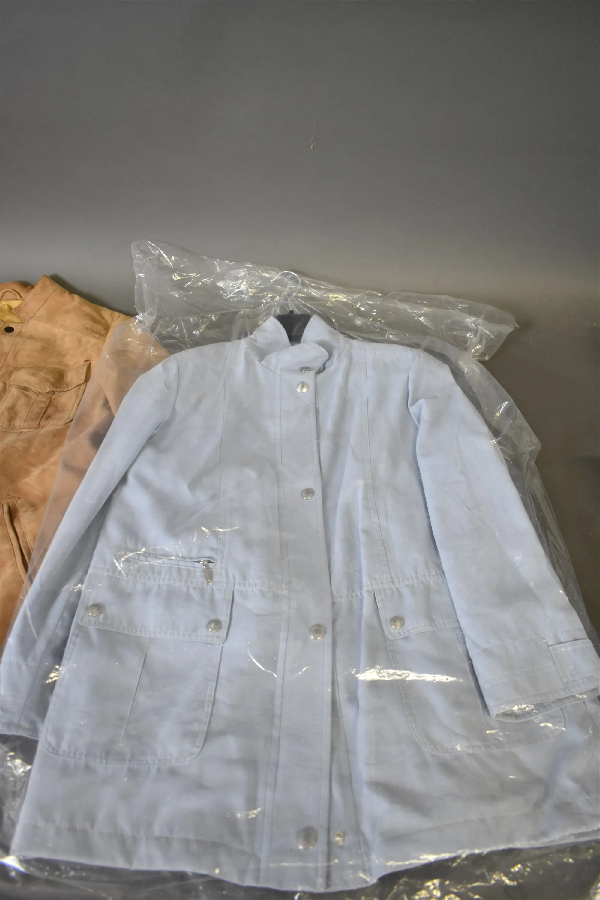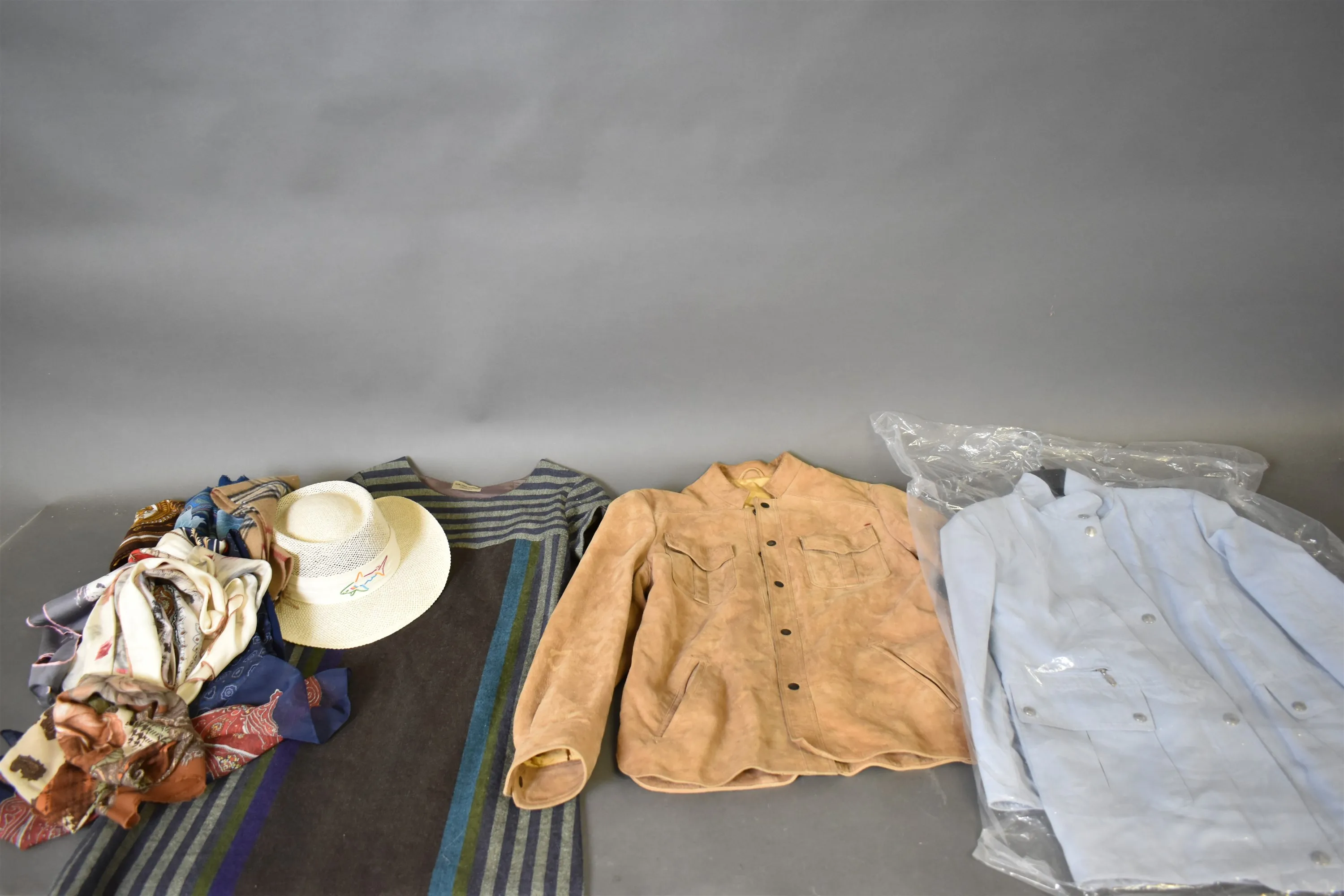 13980. Parti jackor, bl.a läder, klänning & hatt, skarfsar