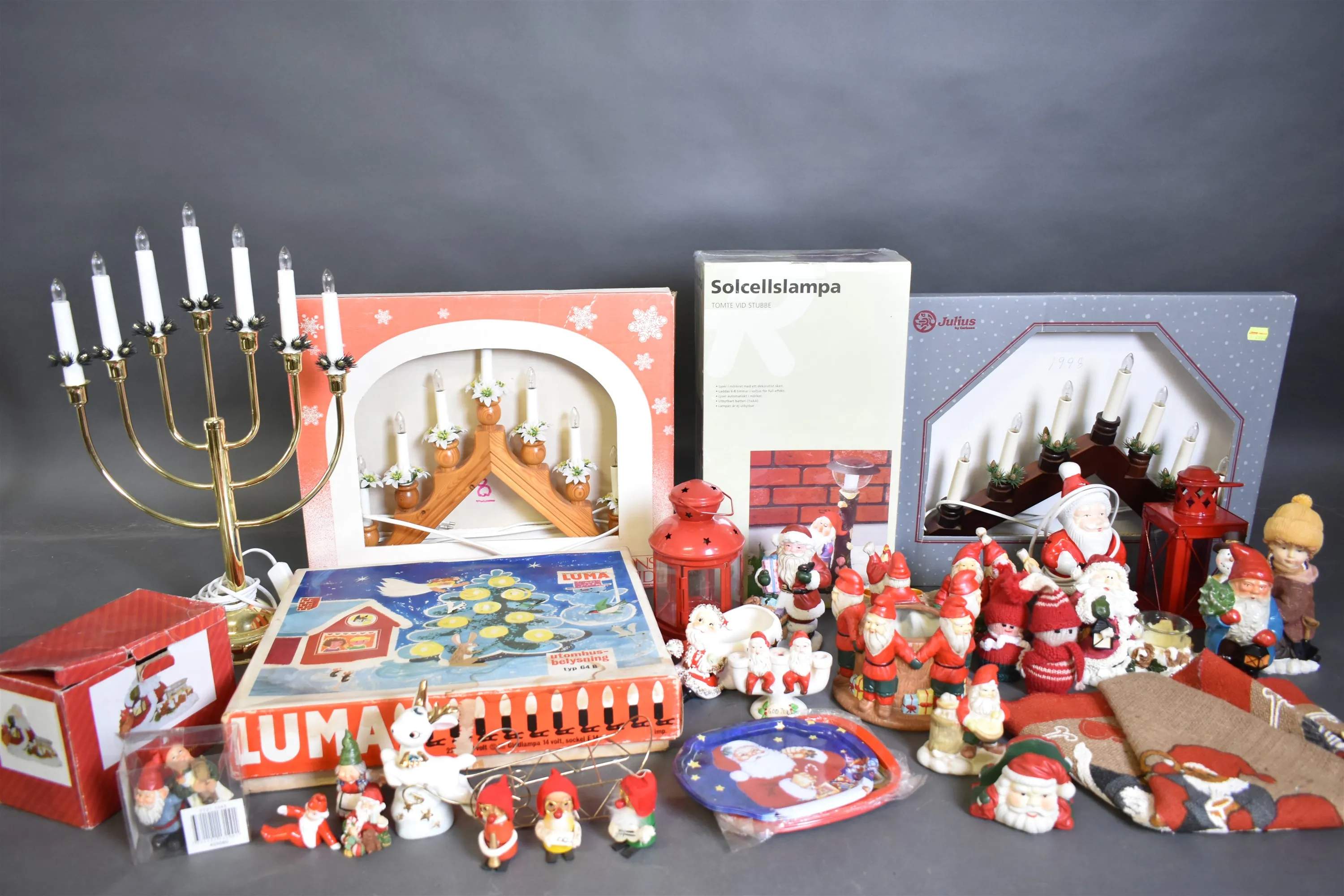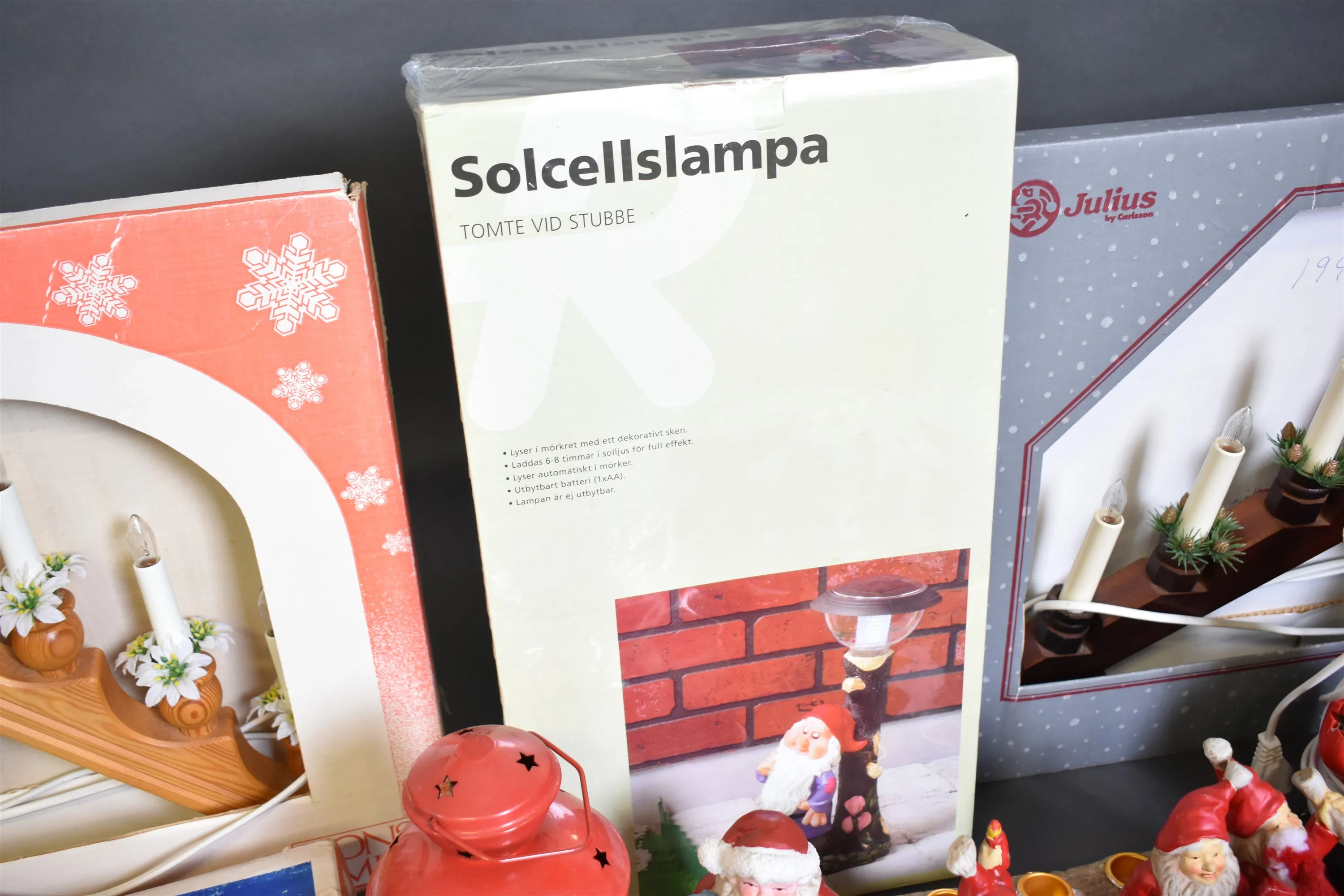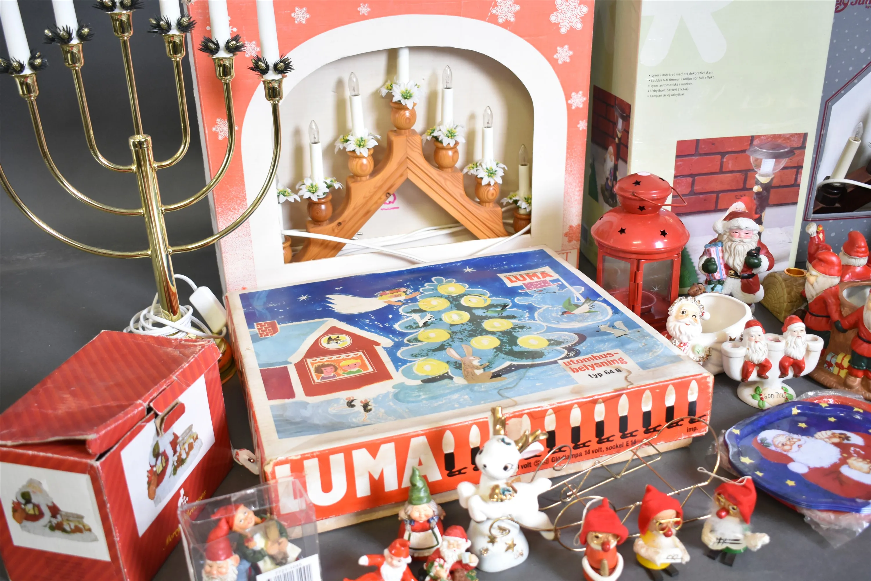 9867. Parti julsaker bla belysning, figurer och solsellsbelysning "tomte" inplastad, högsta höjd 55 cm, 2 lådor