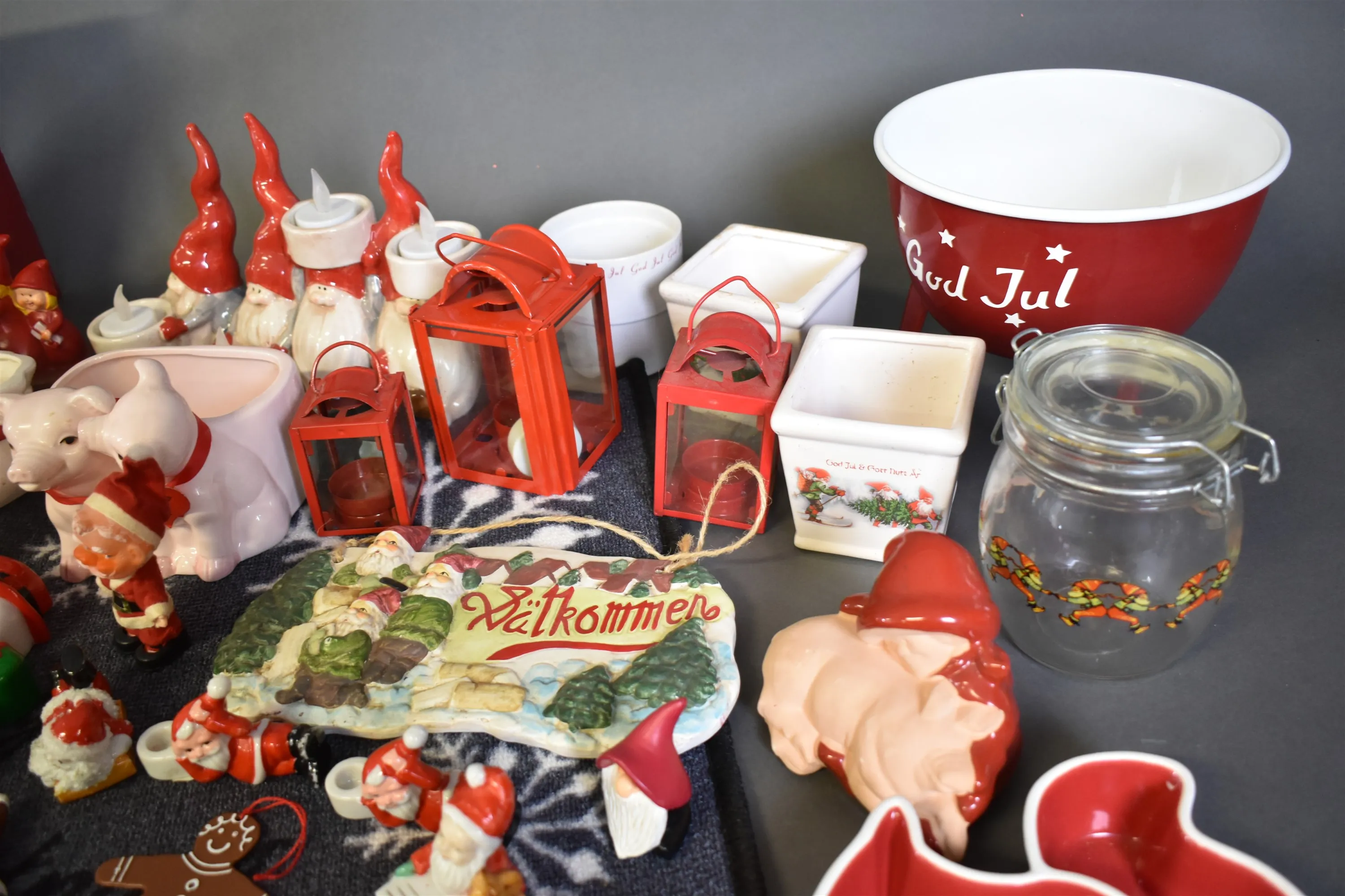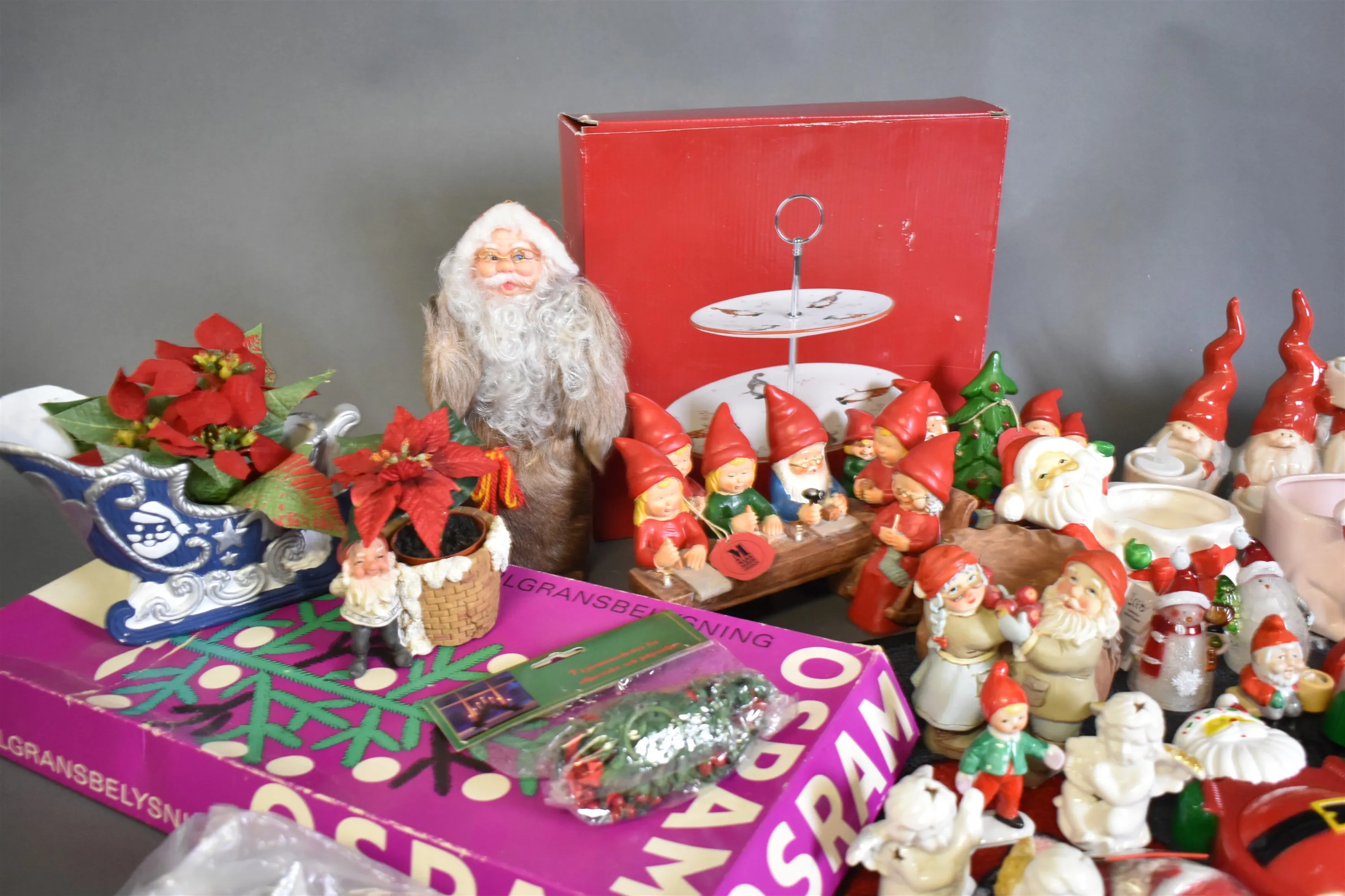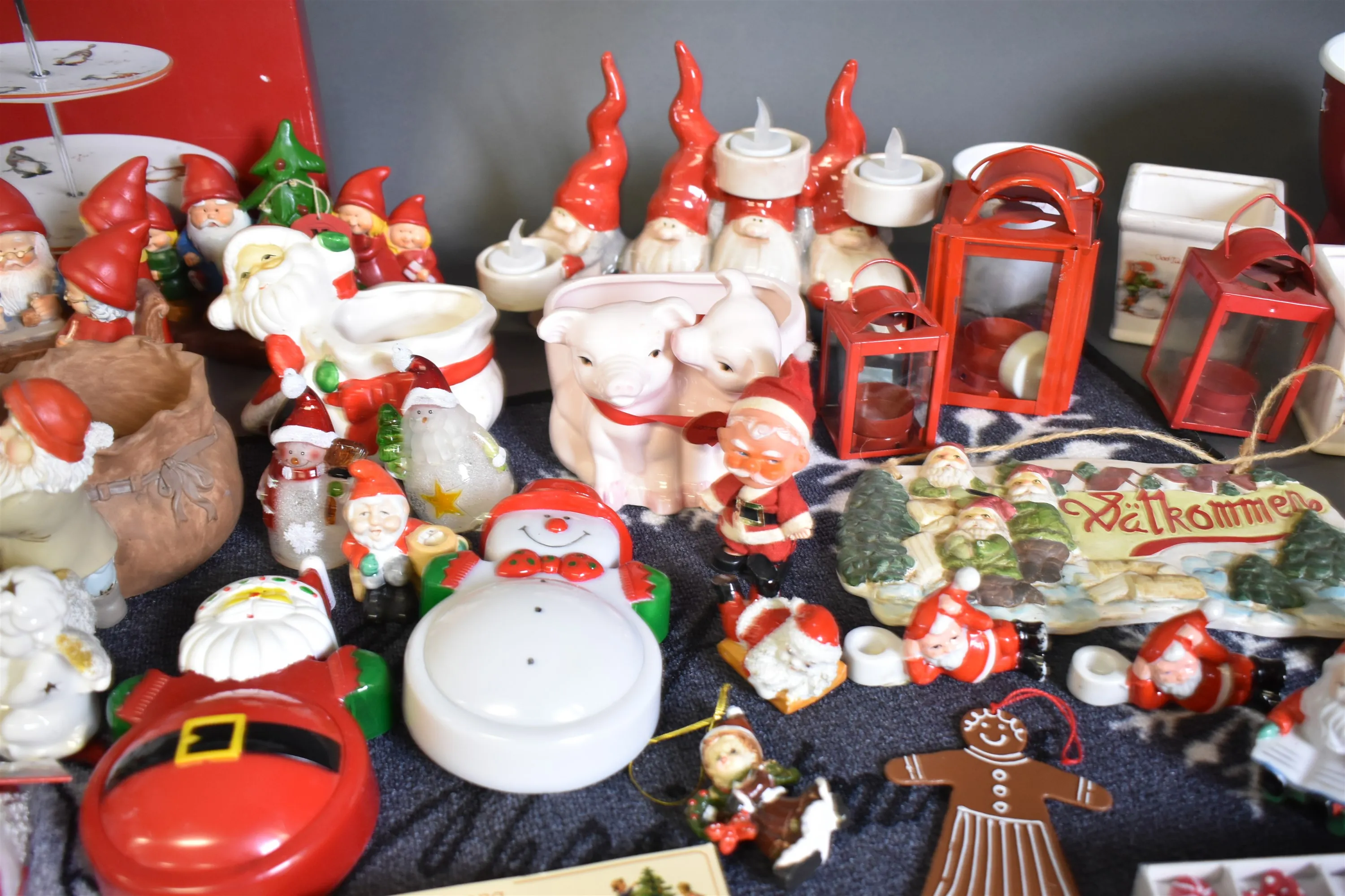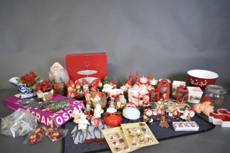 3944. Parti julsaker bla dörrmatta med julmotiv, etagefat och tomtefiguriner, högsta höjd på bild 32 cm
