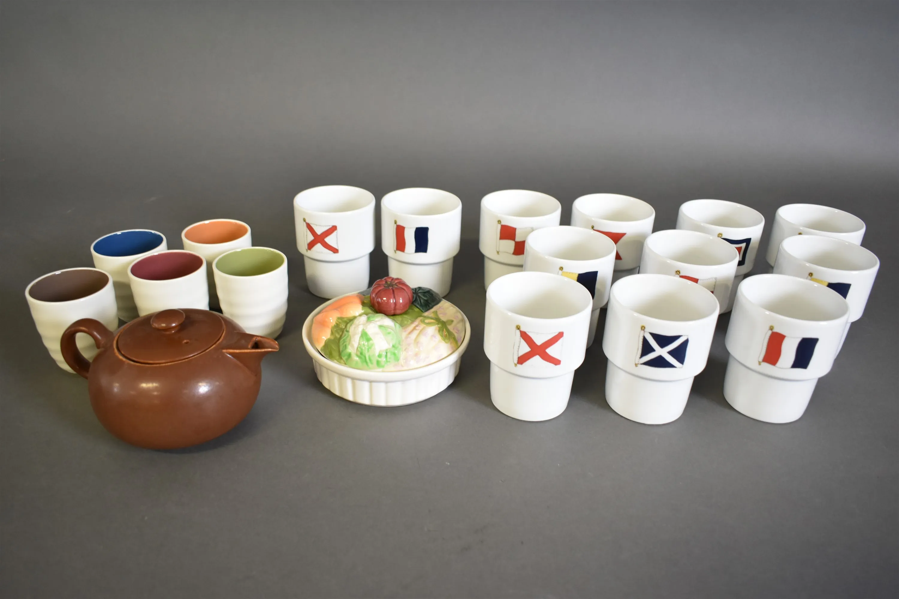 15231. Parti keramik bl.a koppar med flaggmotiv högsta 11 cm