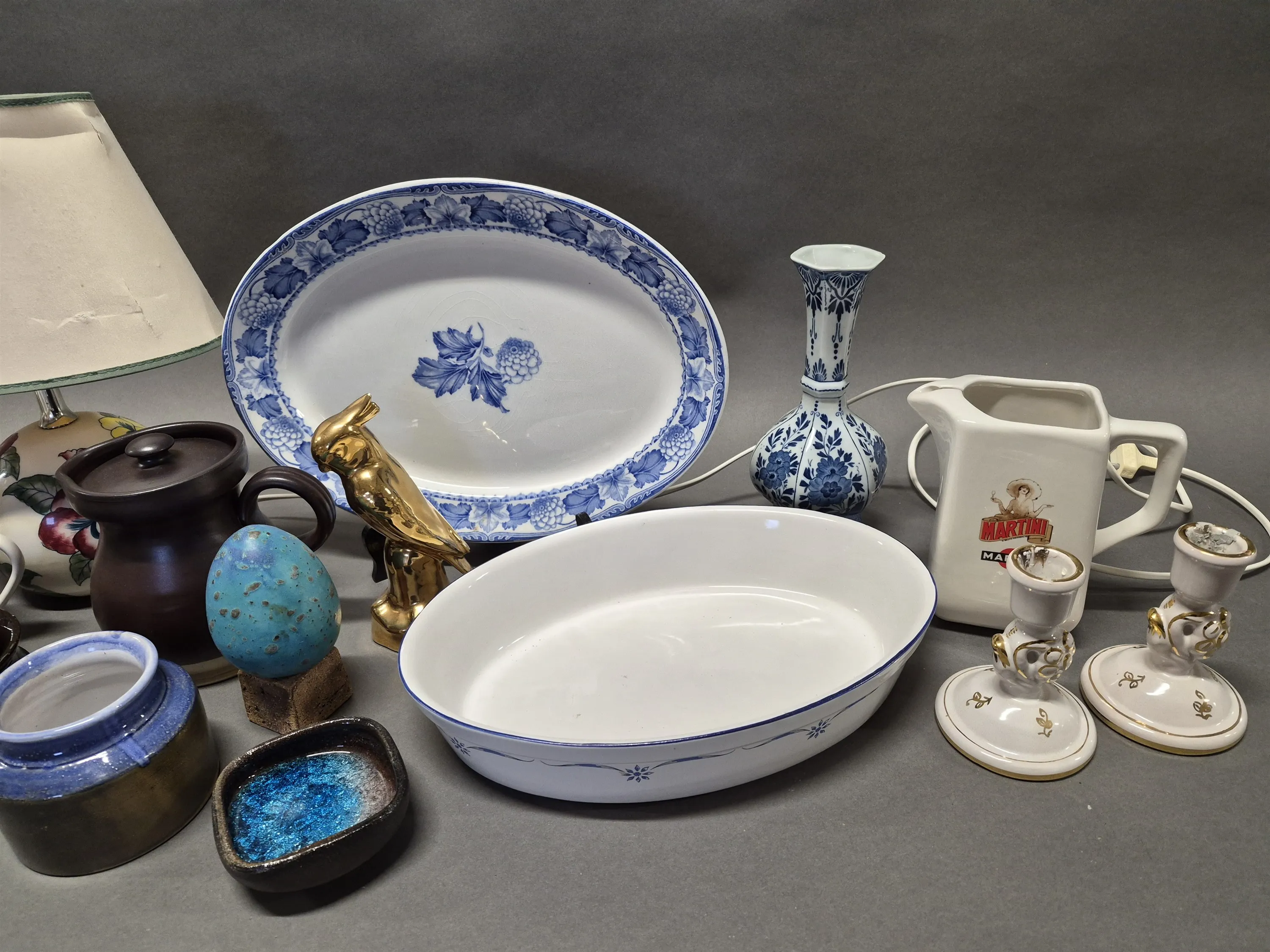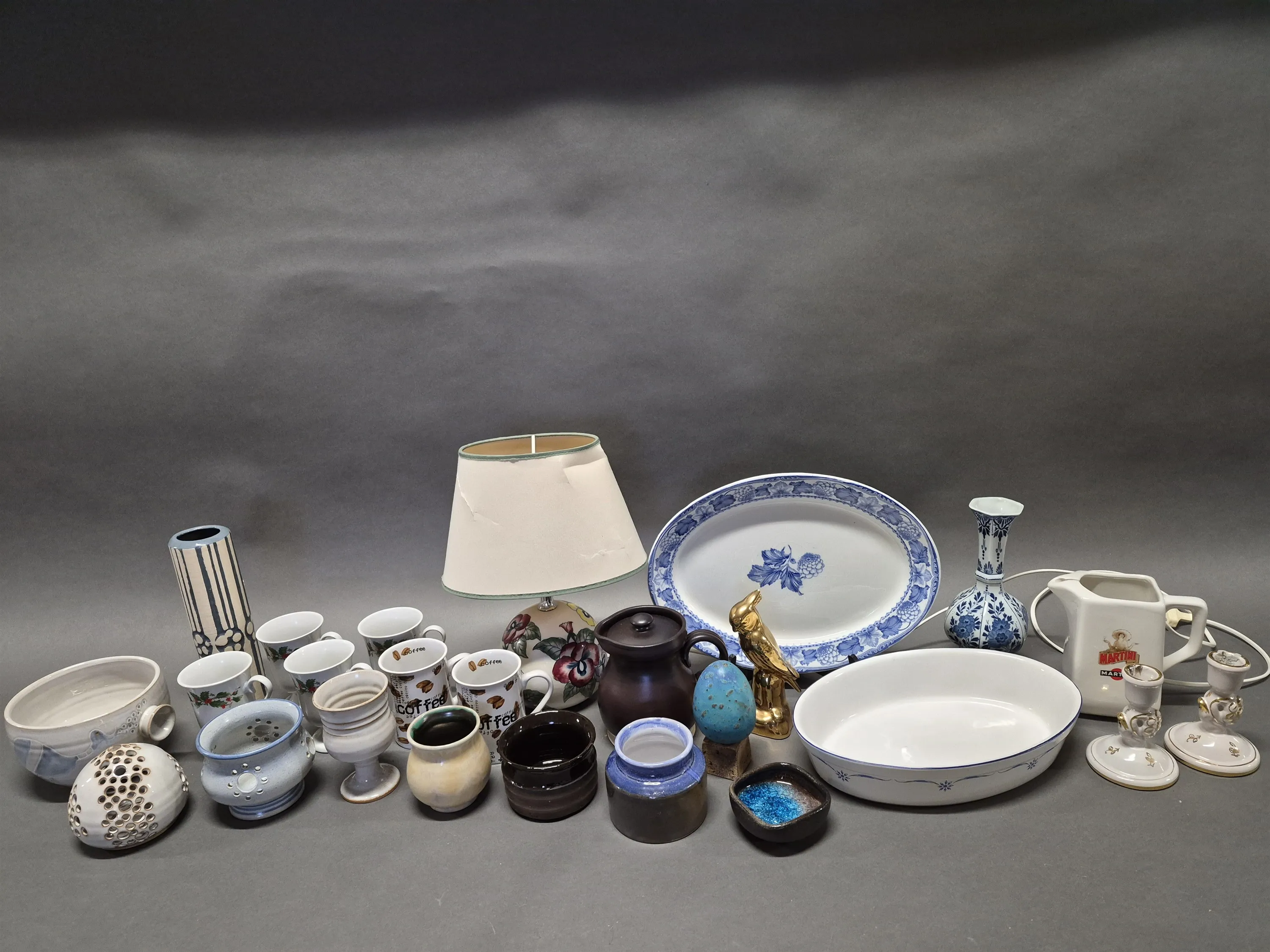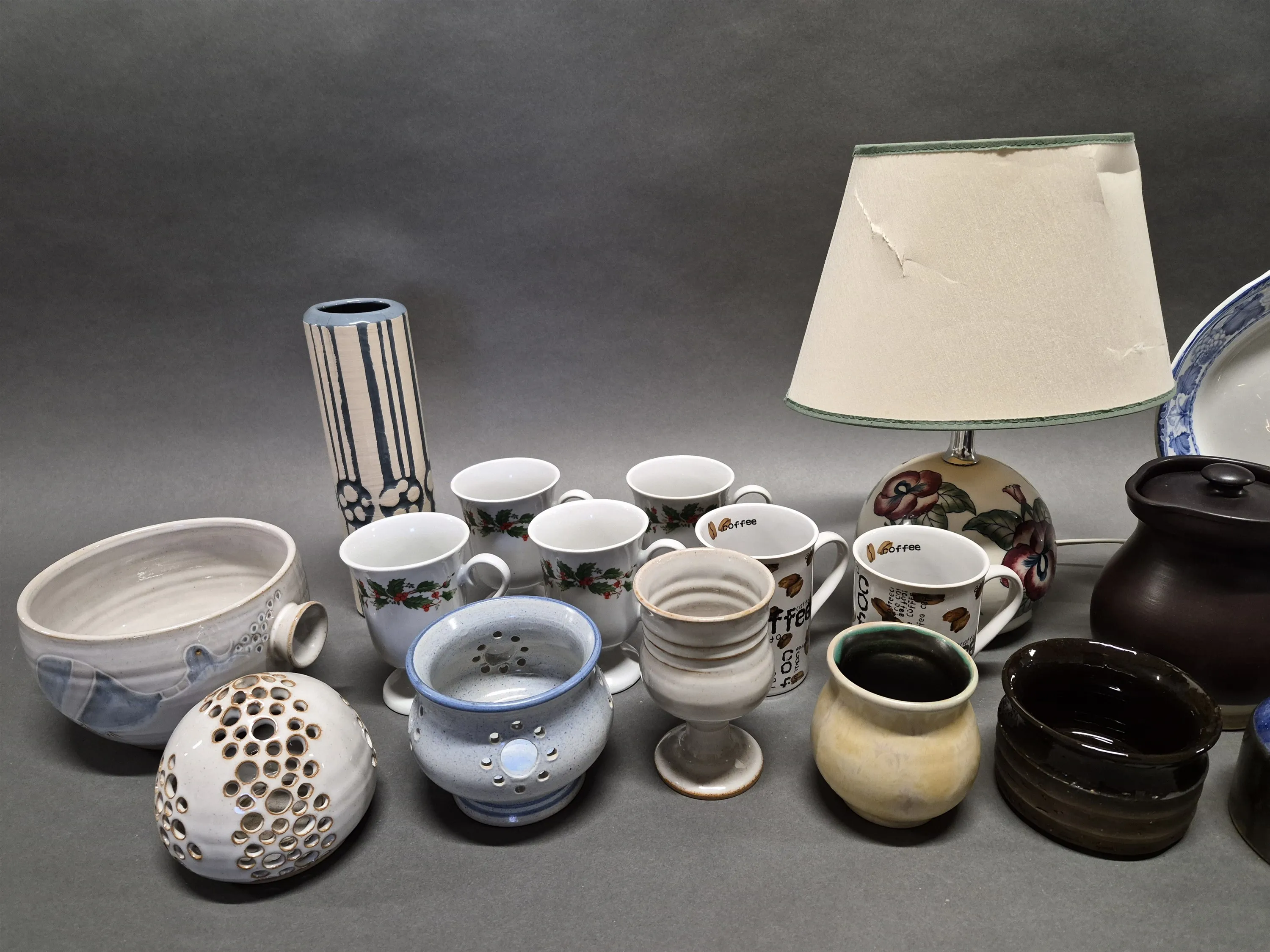 18987. Parti keramik bla fat och krus, högsta höjd 34 cm