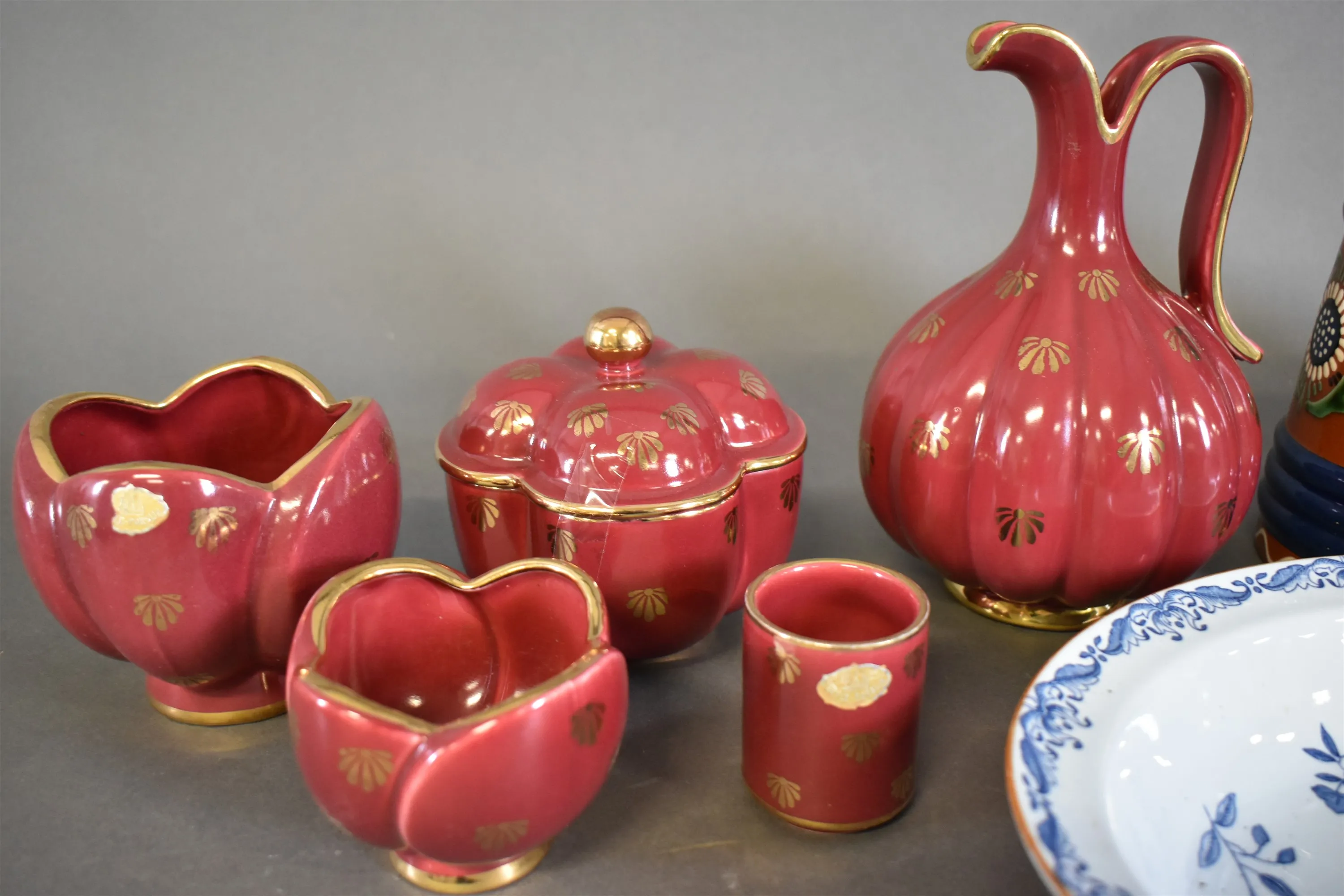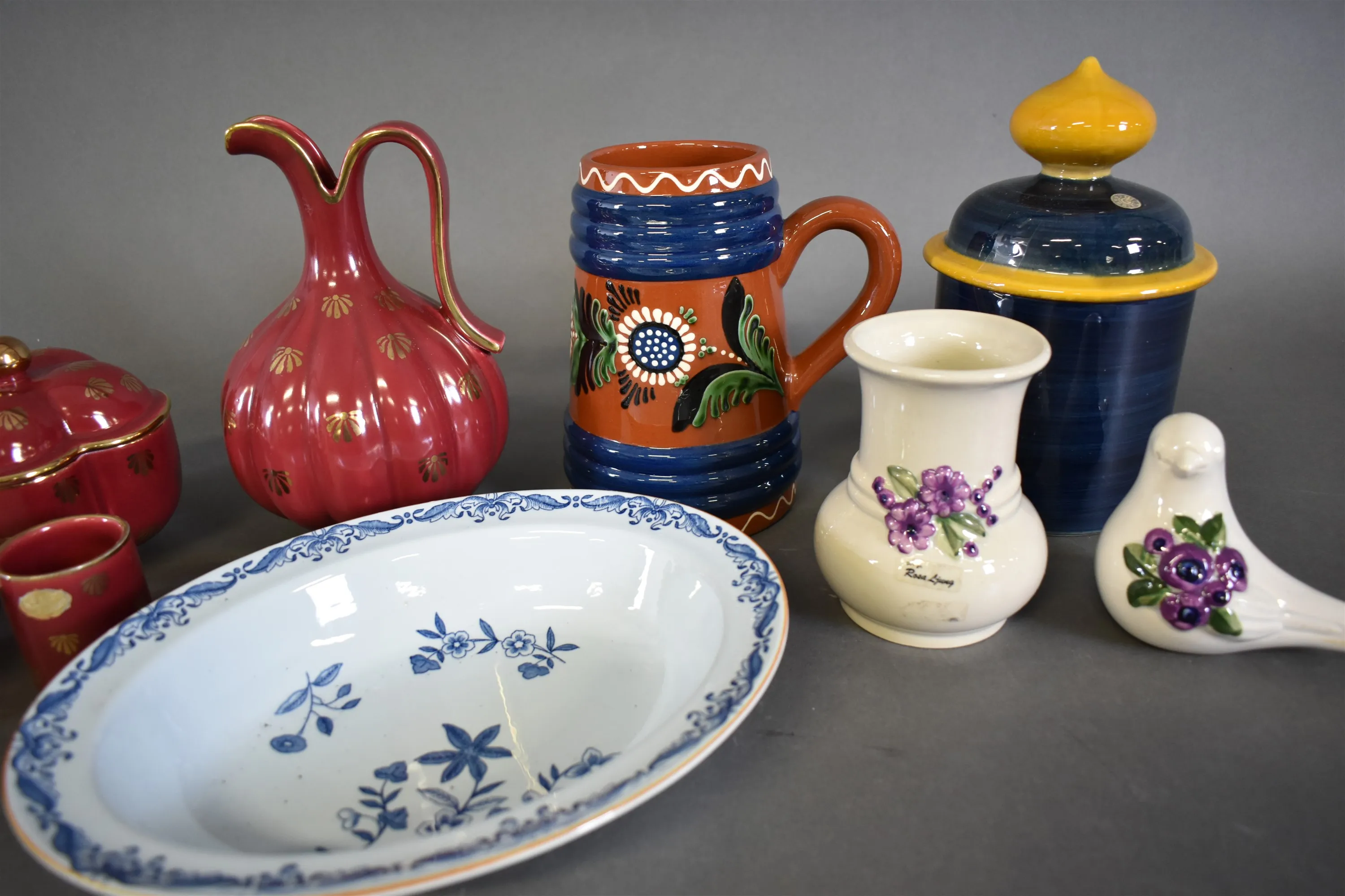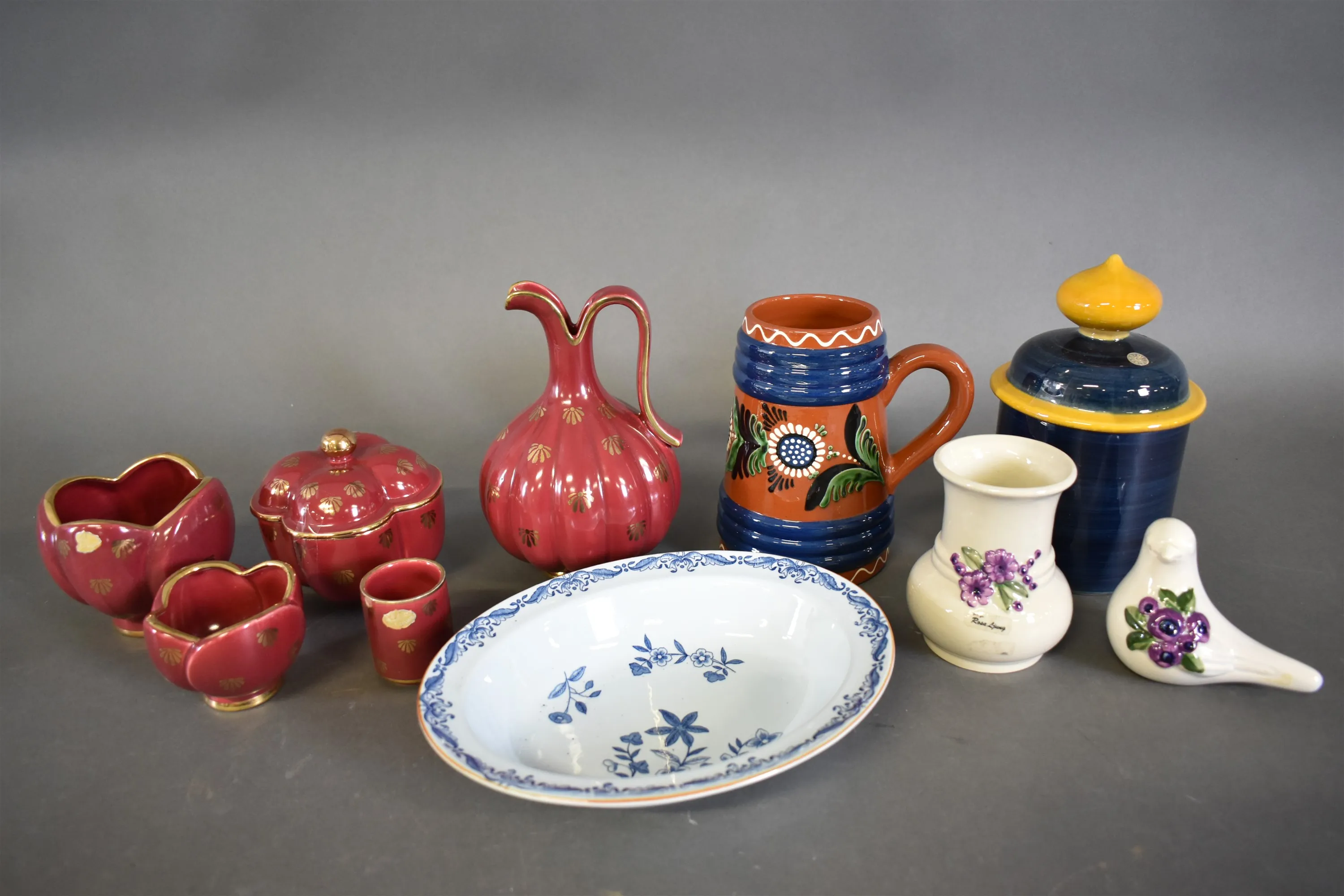 16802. Parti keramik bla Gefle "Röd Rubin" och Rörstrand "Ostindia" (undersidesnagg), högsta höjd 21 cm