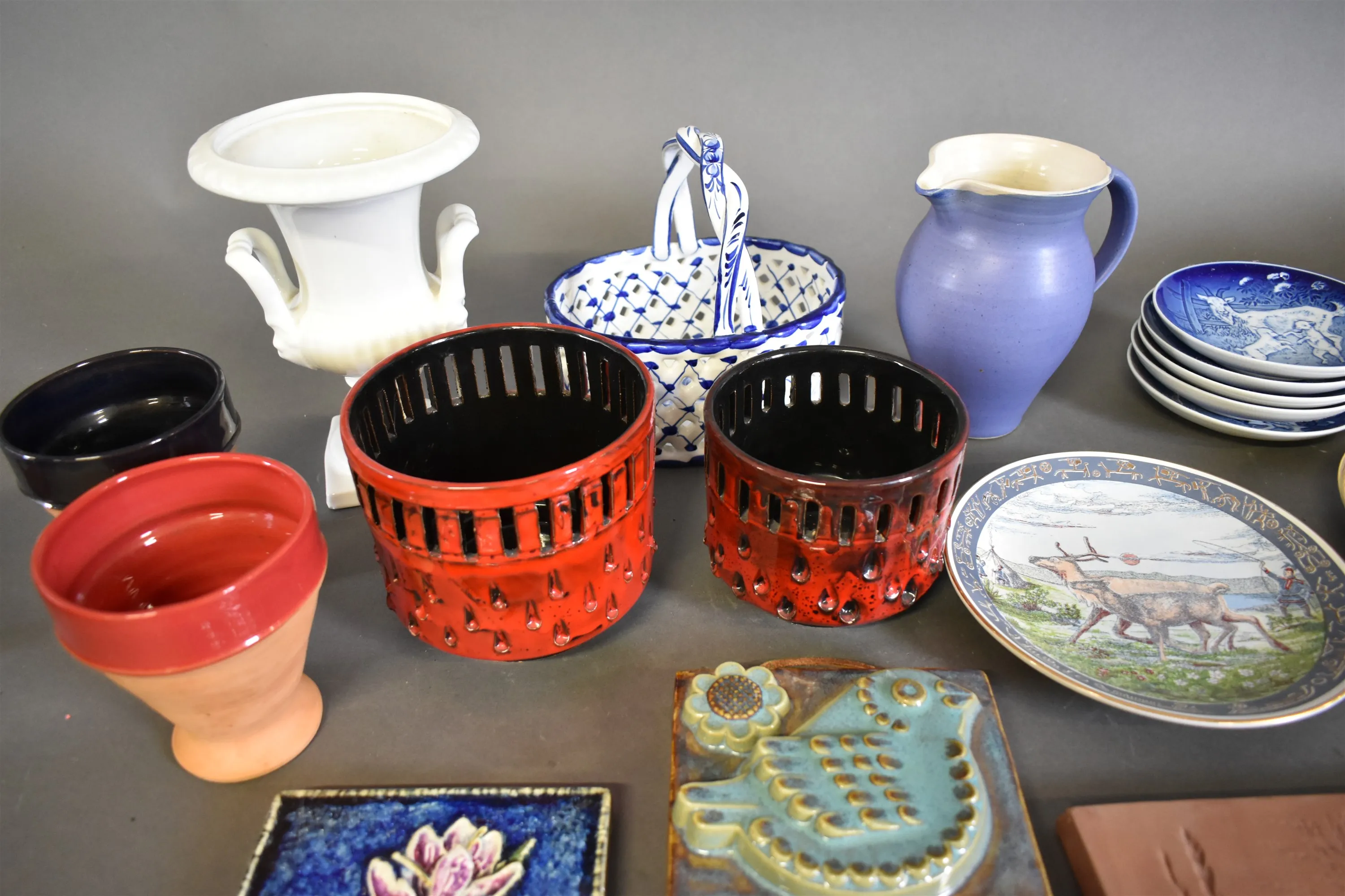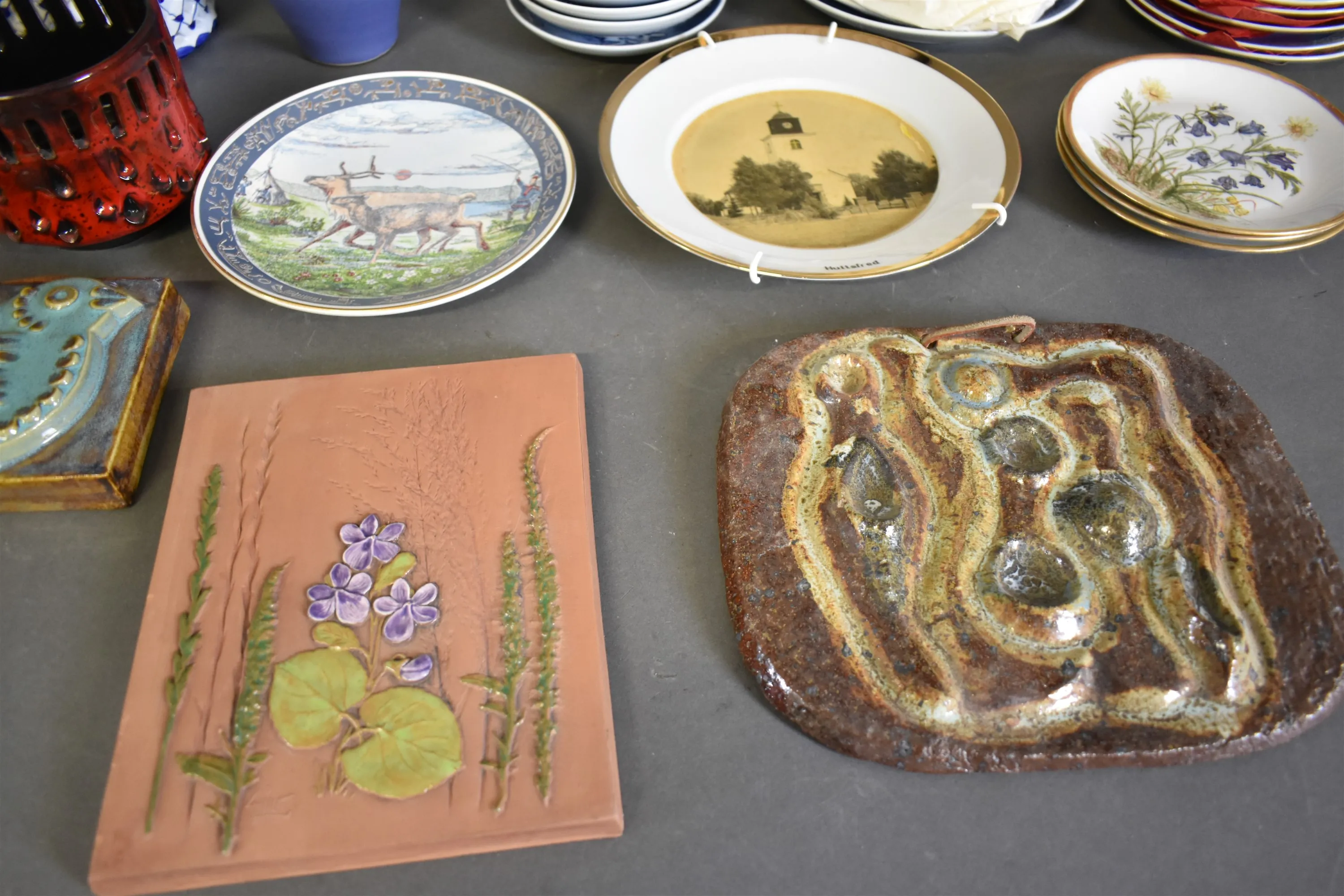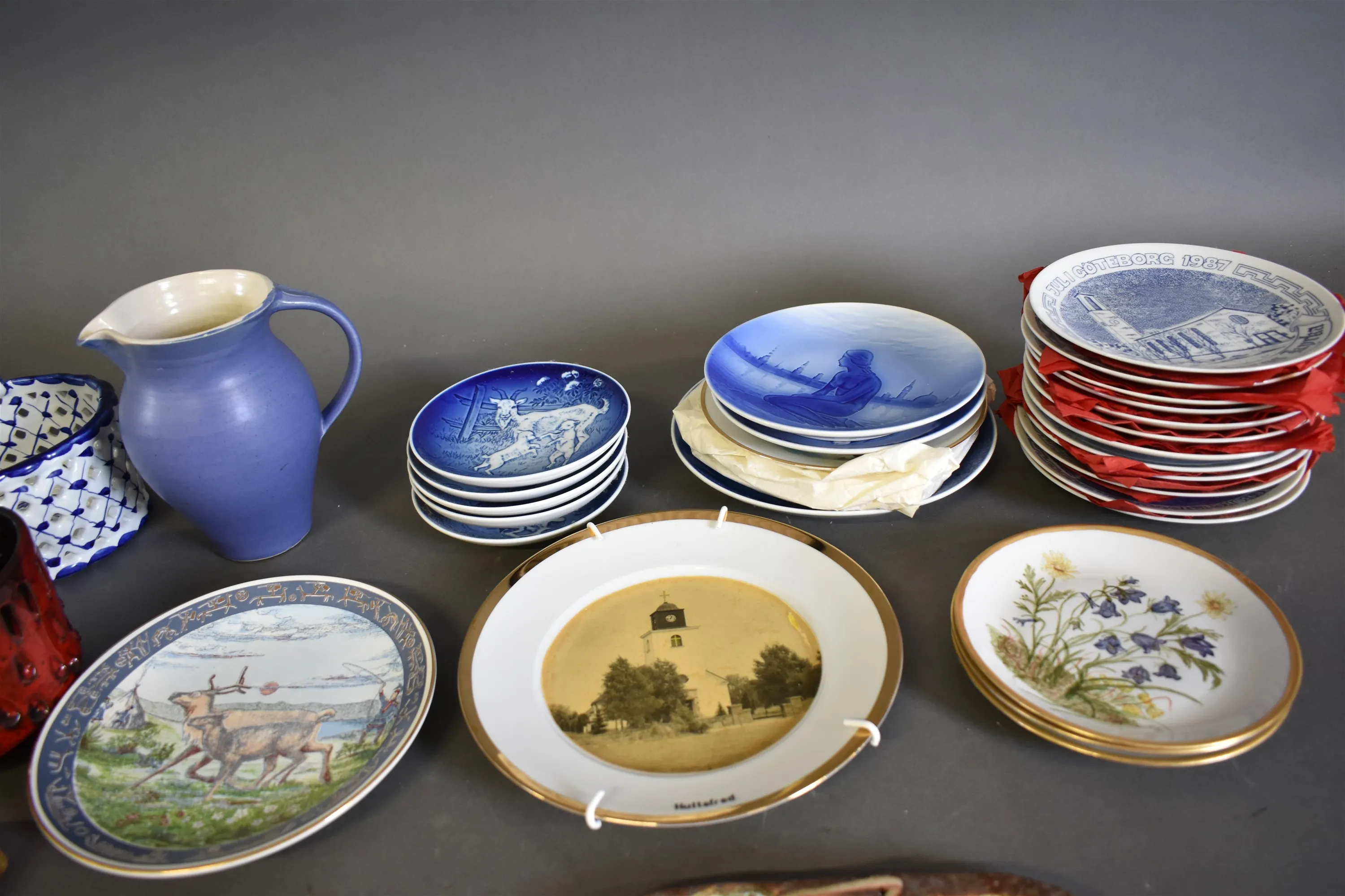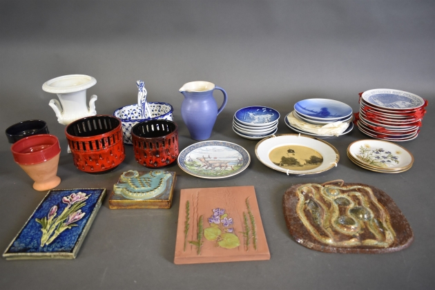 16504. Parti keramik bla minnestallrikar och väggtavlor, högsta höjd 23 cm, 2 lådor