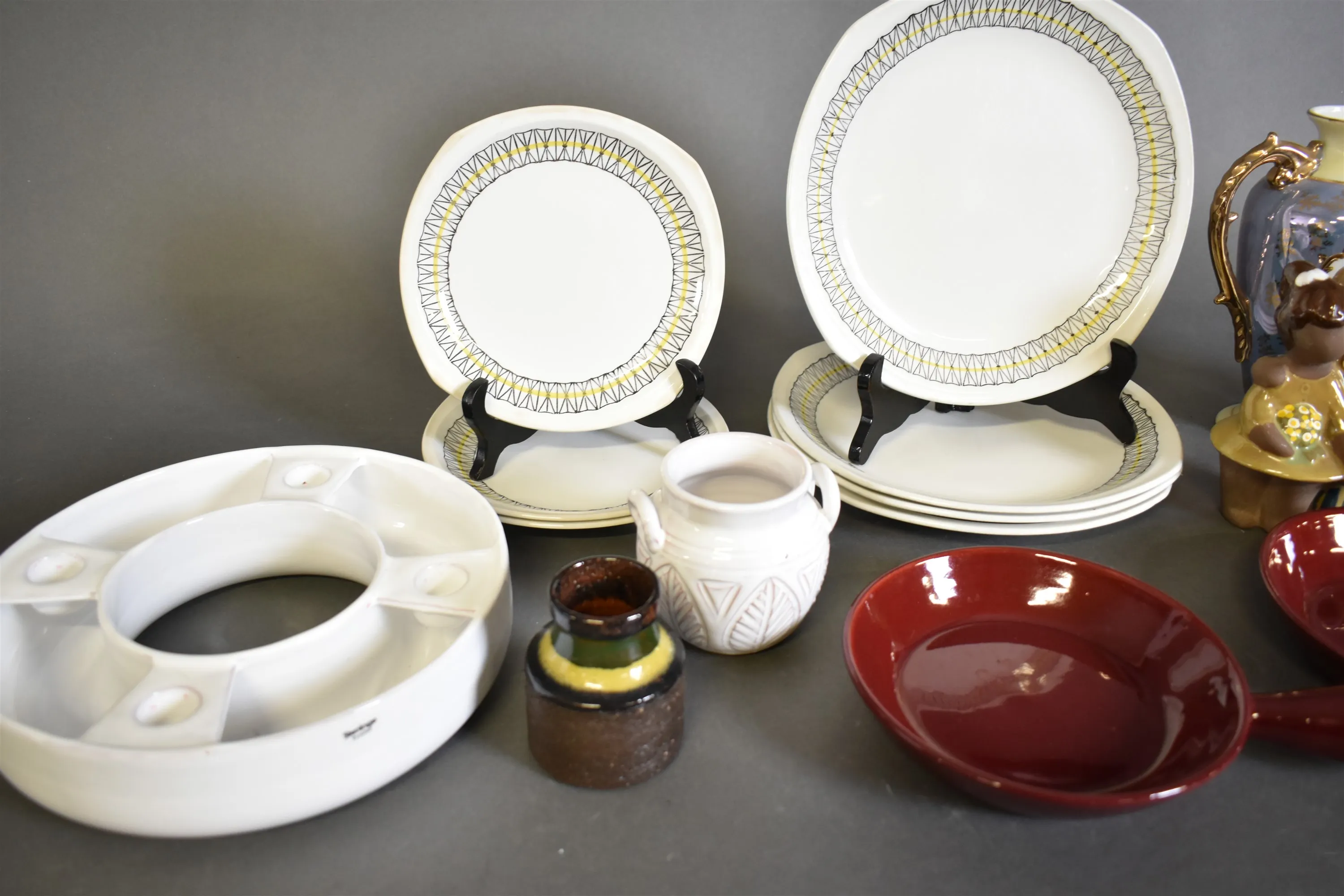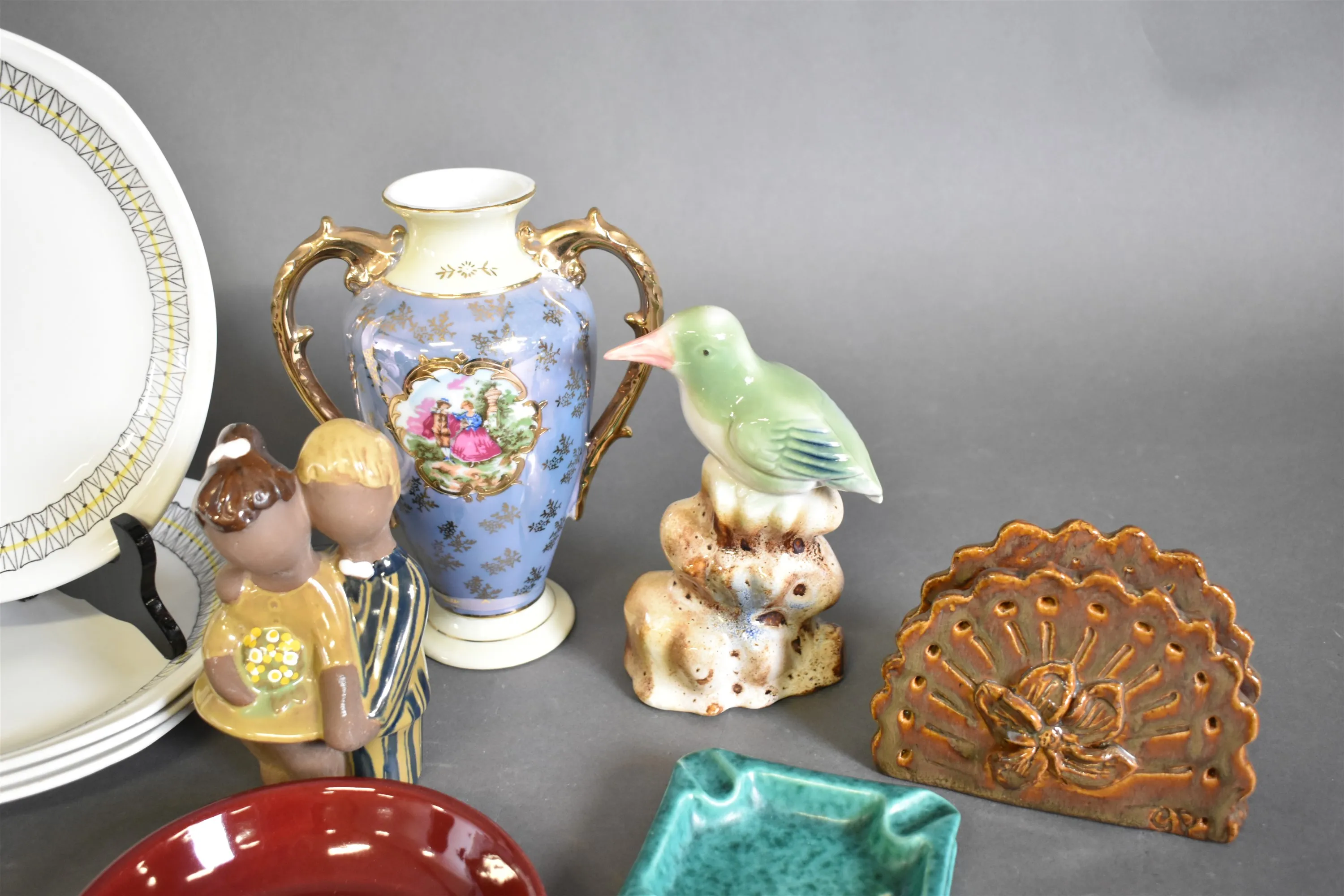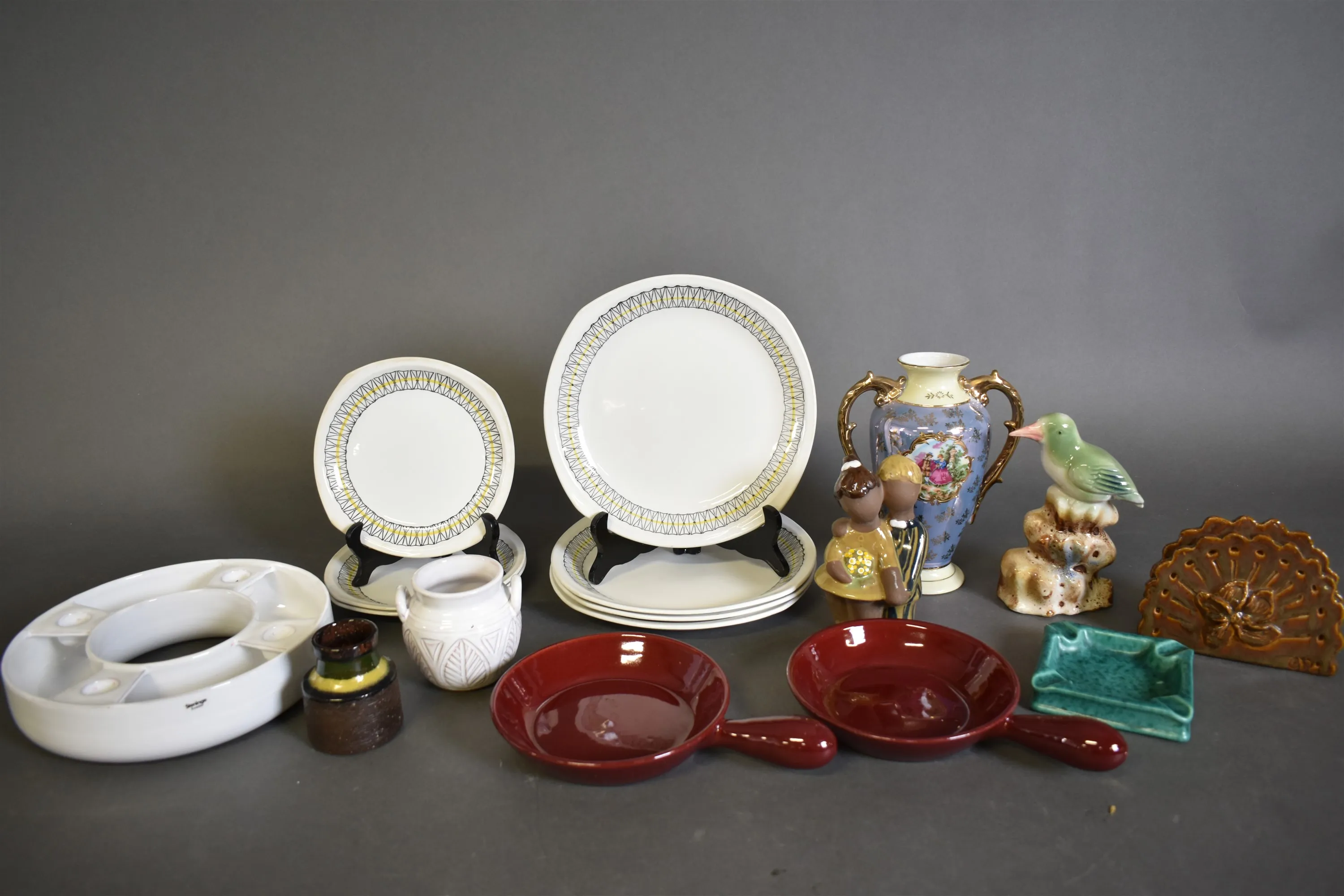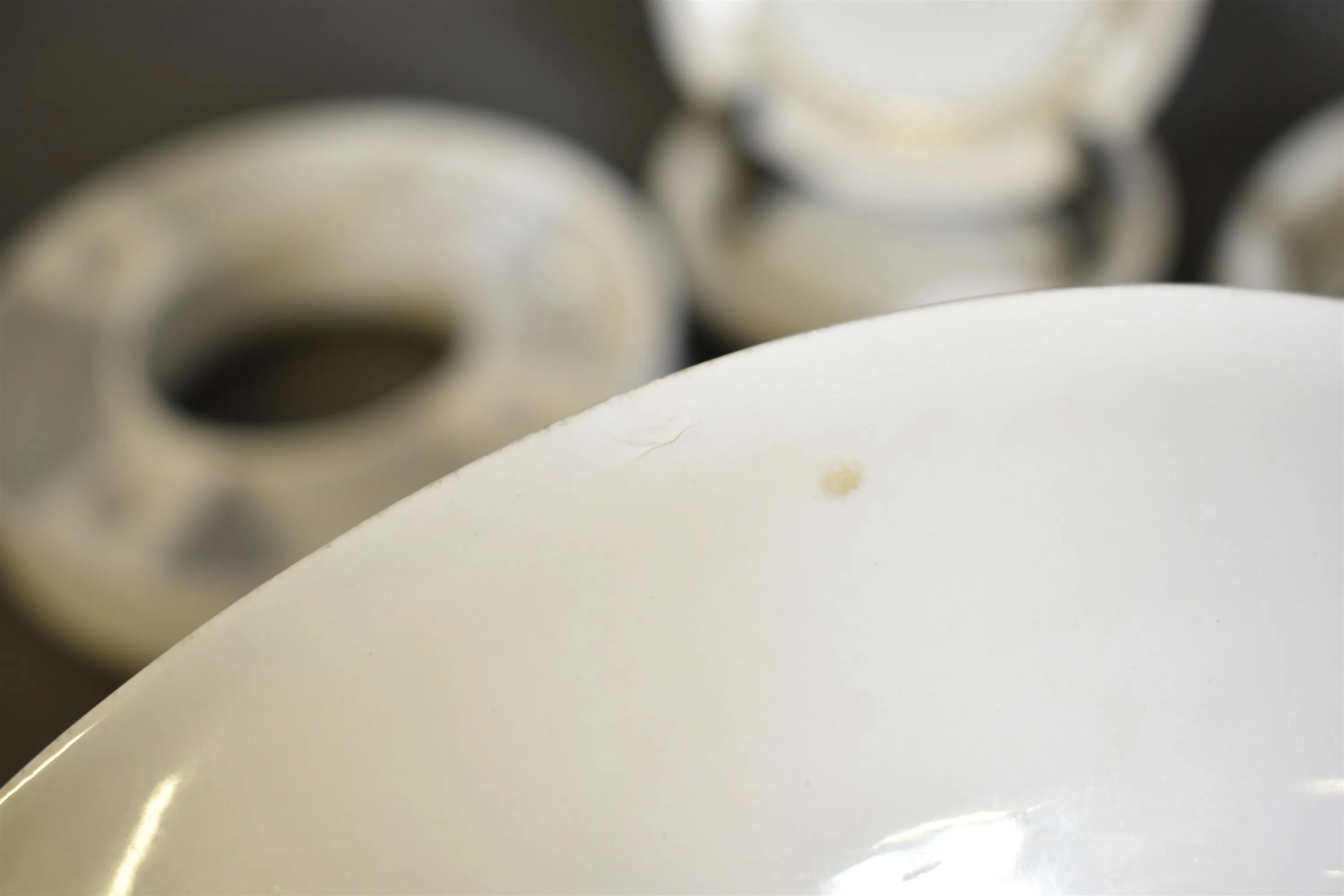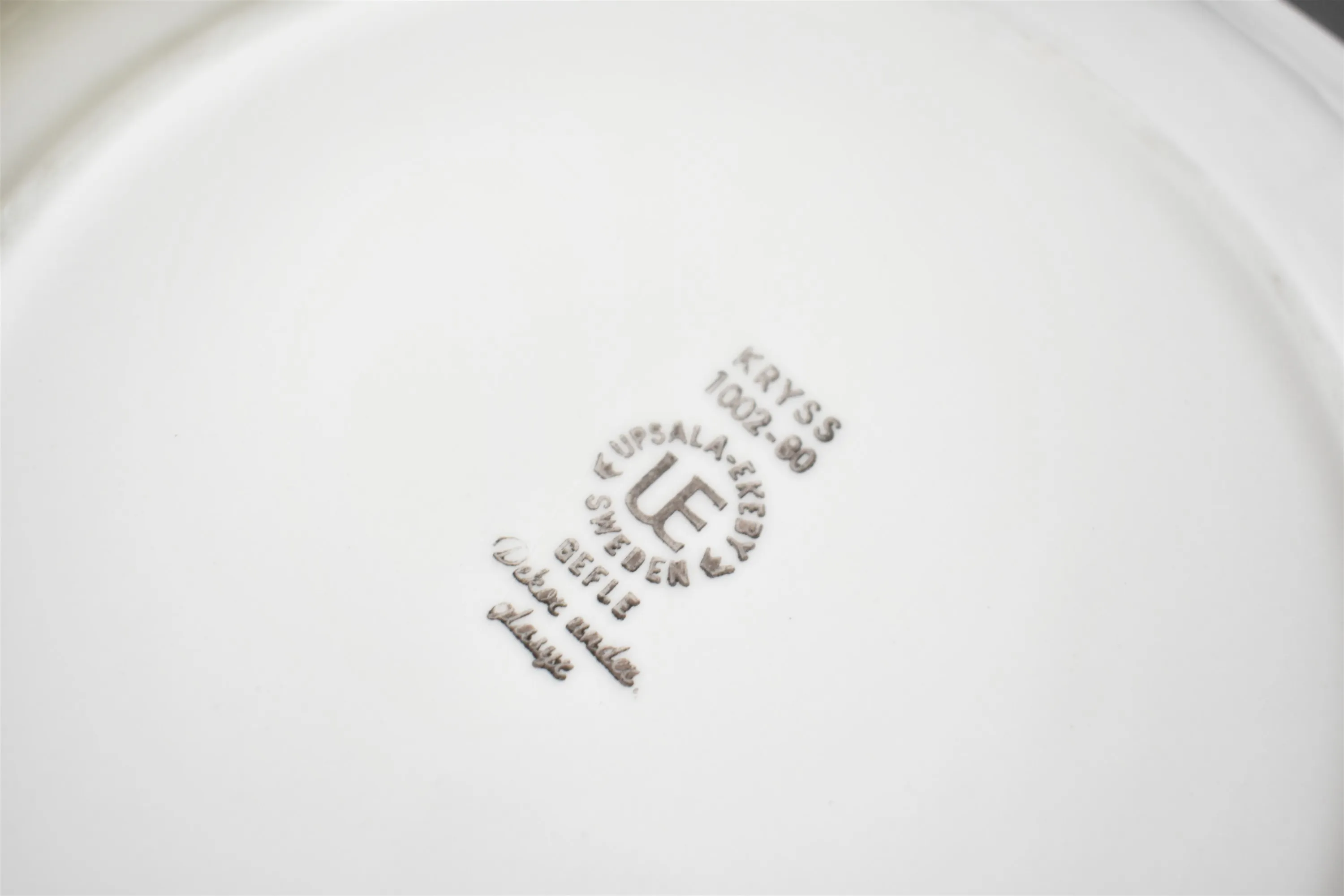 13579. Parti keramik bla tallrikar & fat Upsala Ekeby Gefle, figuriner och urna, största diameter 25 cm