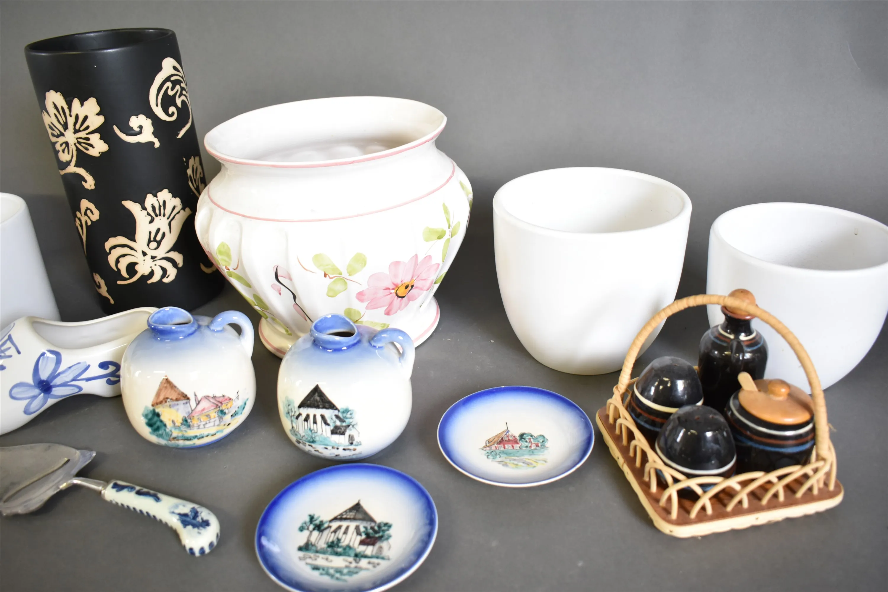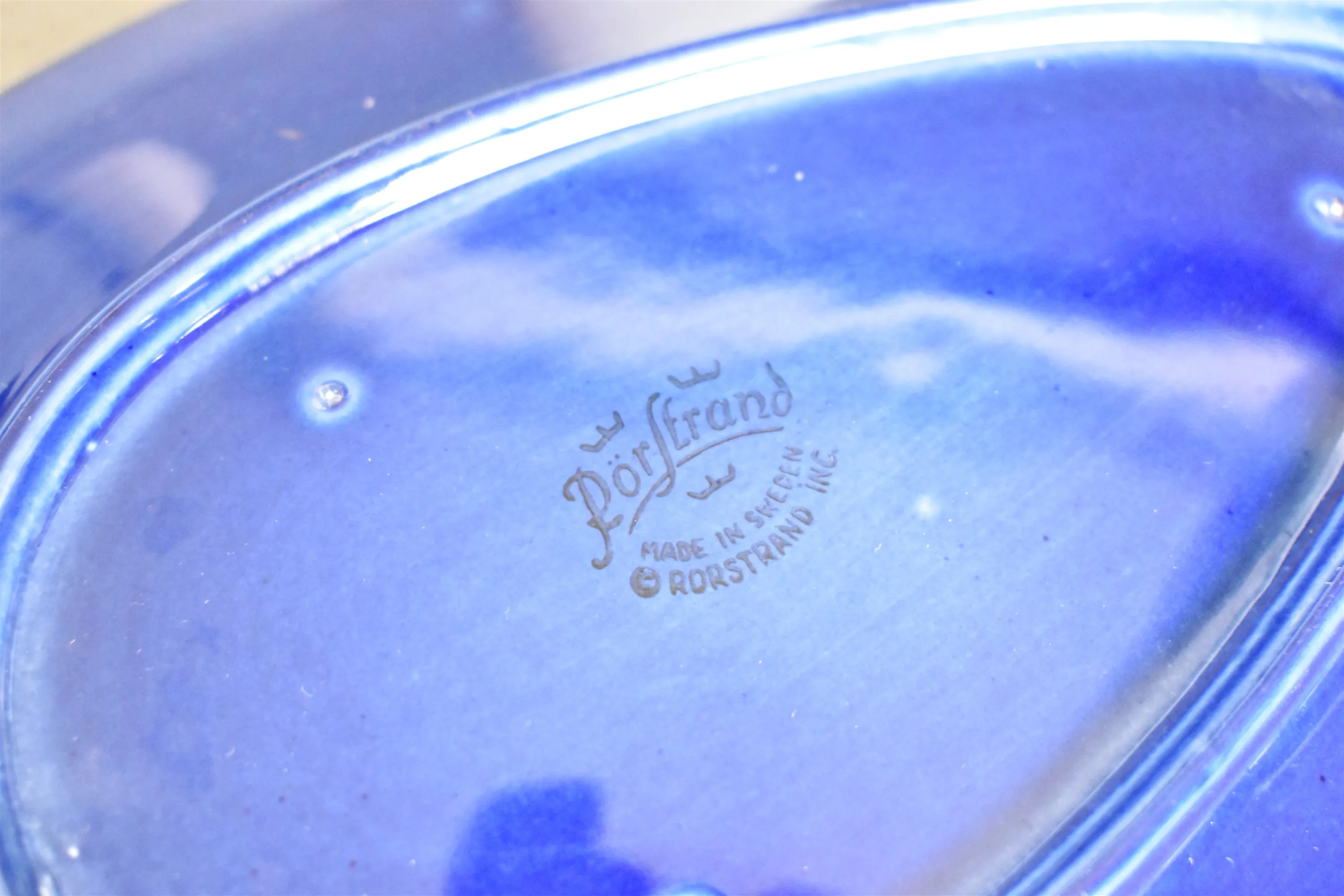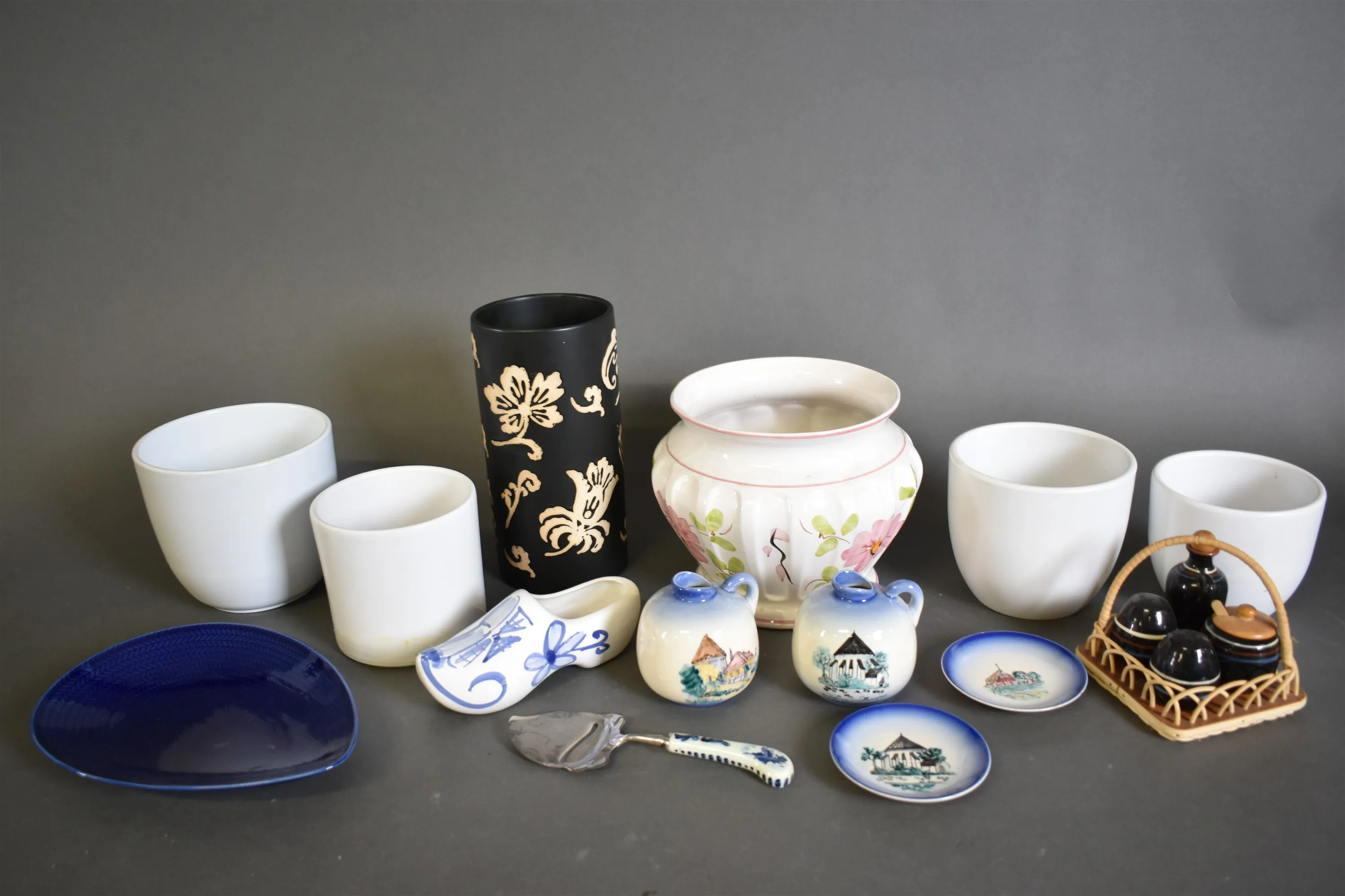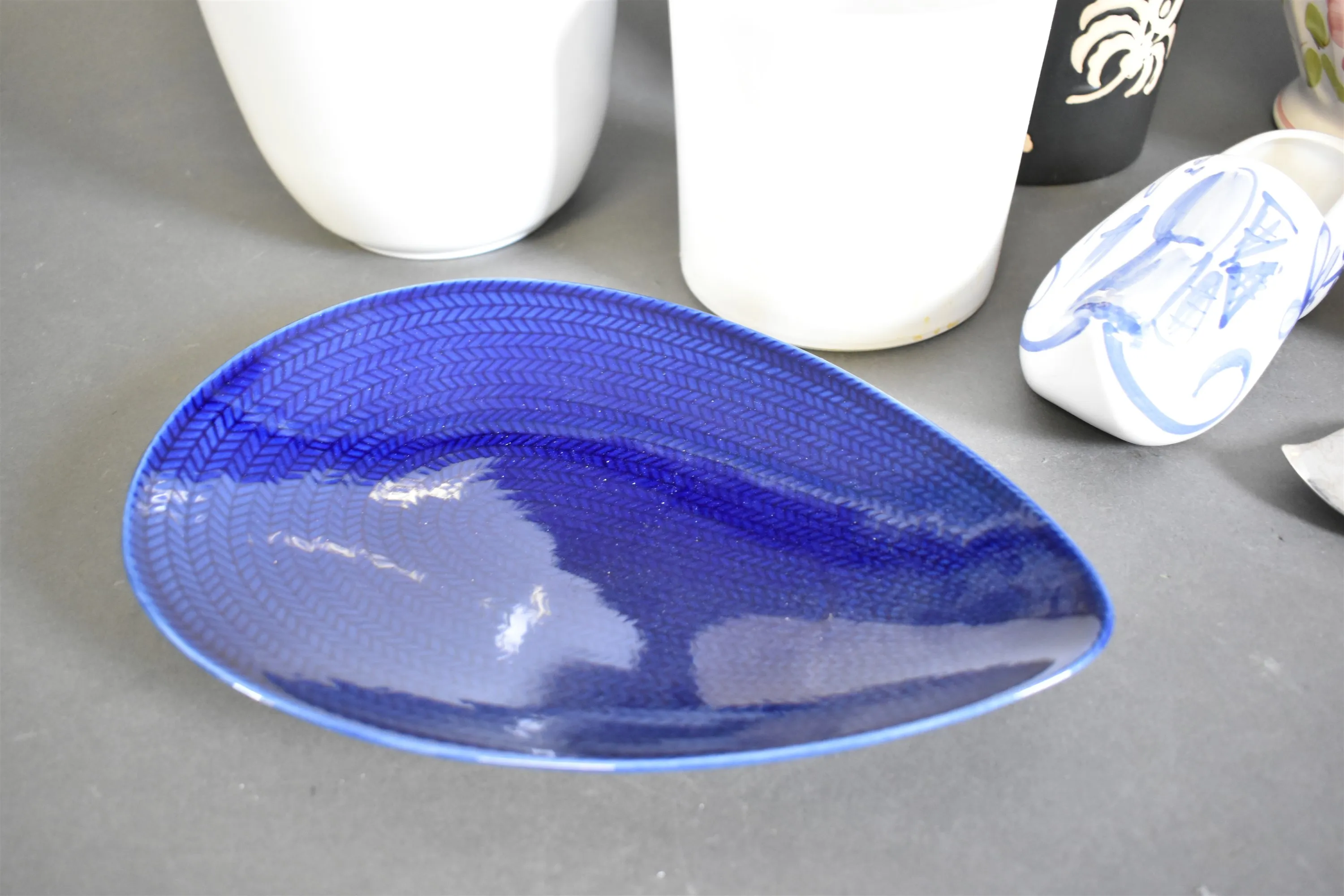 12374. Parti keramik bla ytterfoder och fat Rörstrand "Blå eld", högsta höjd 26 cm