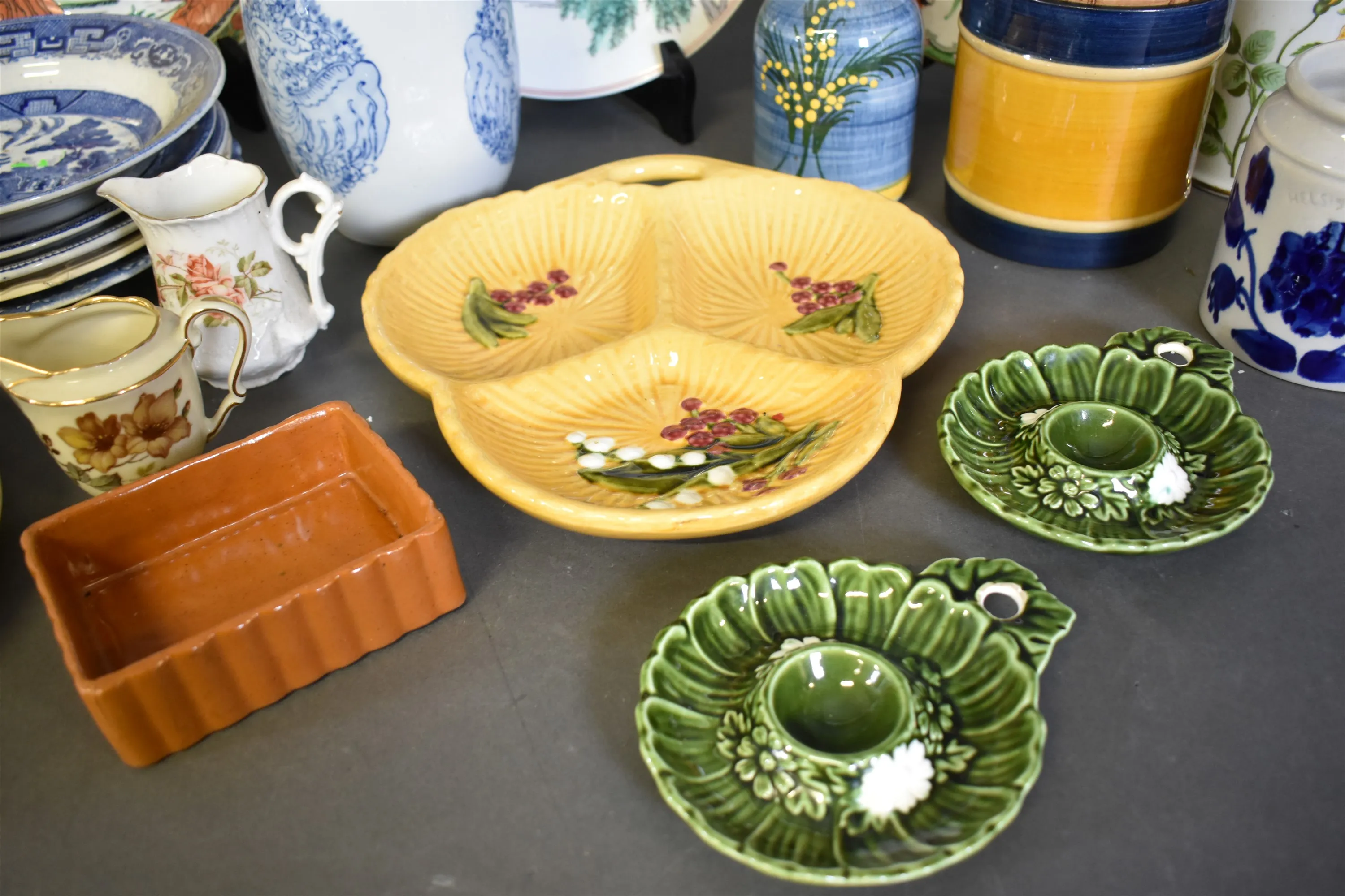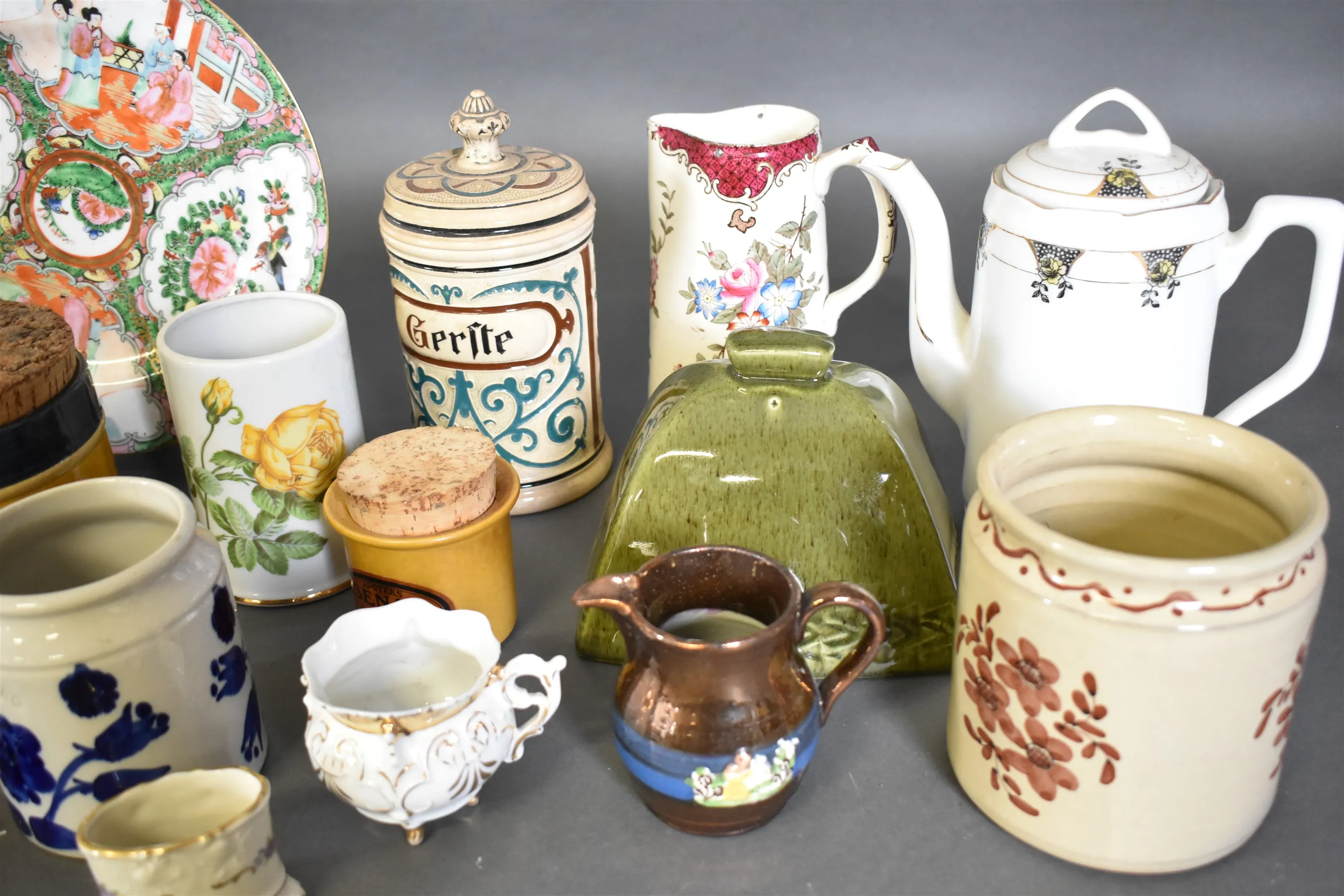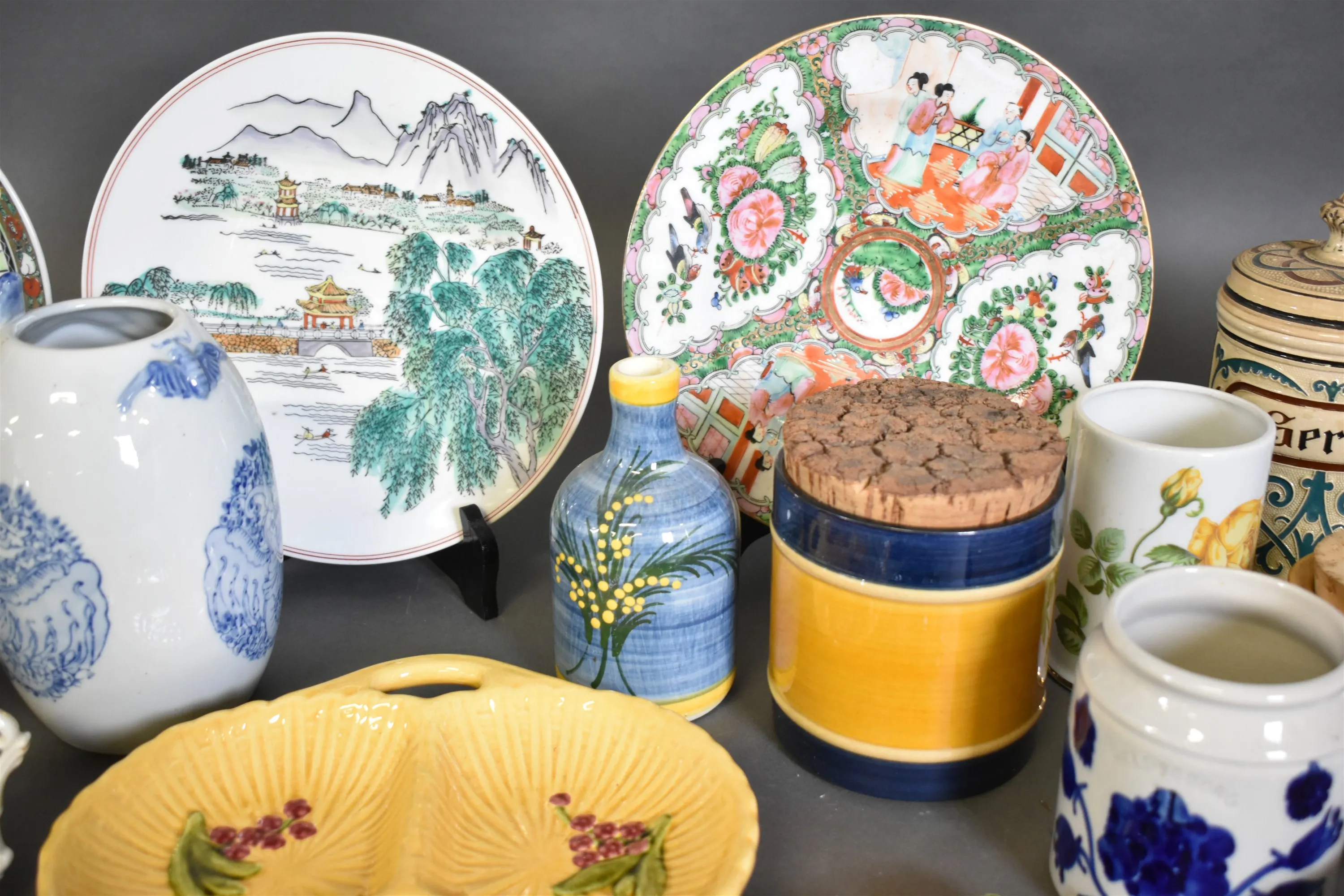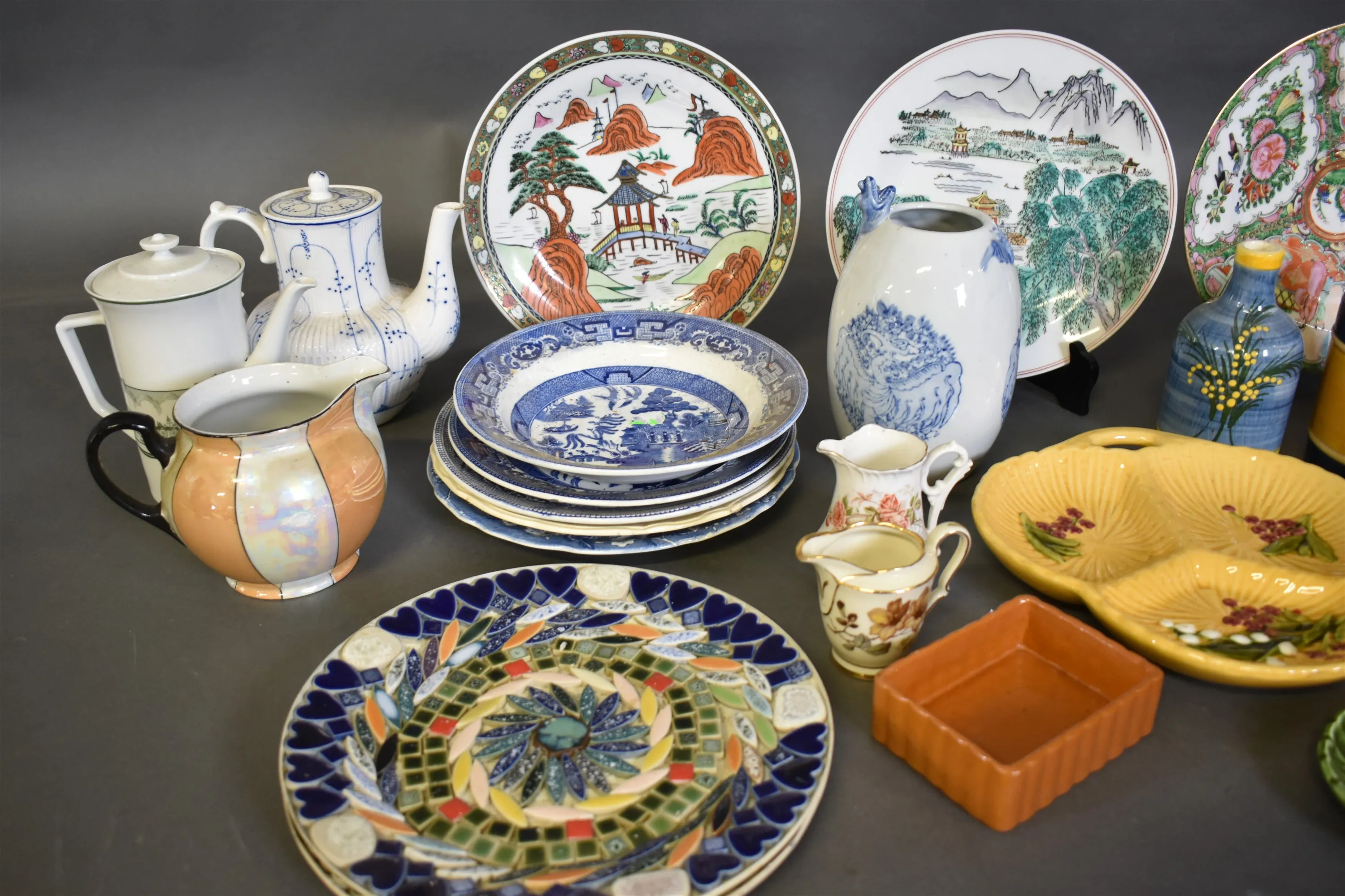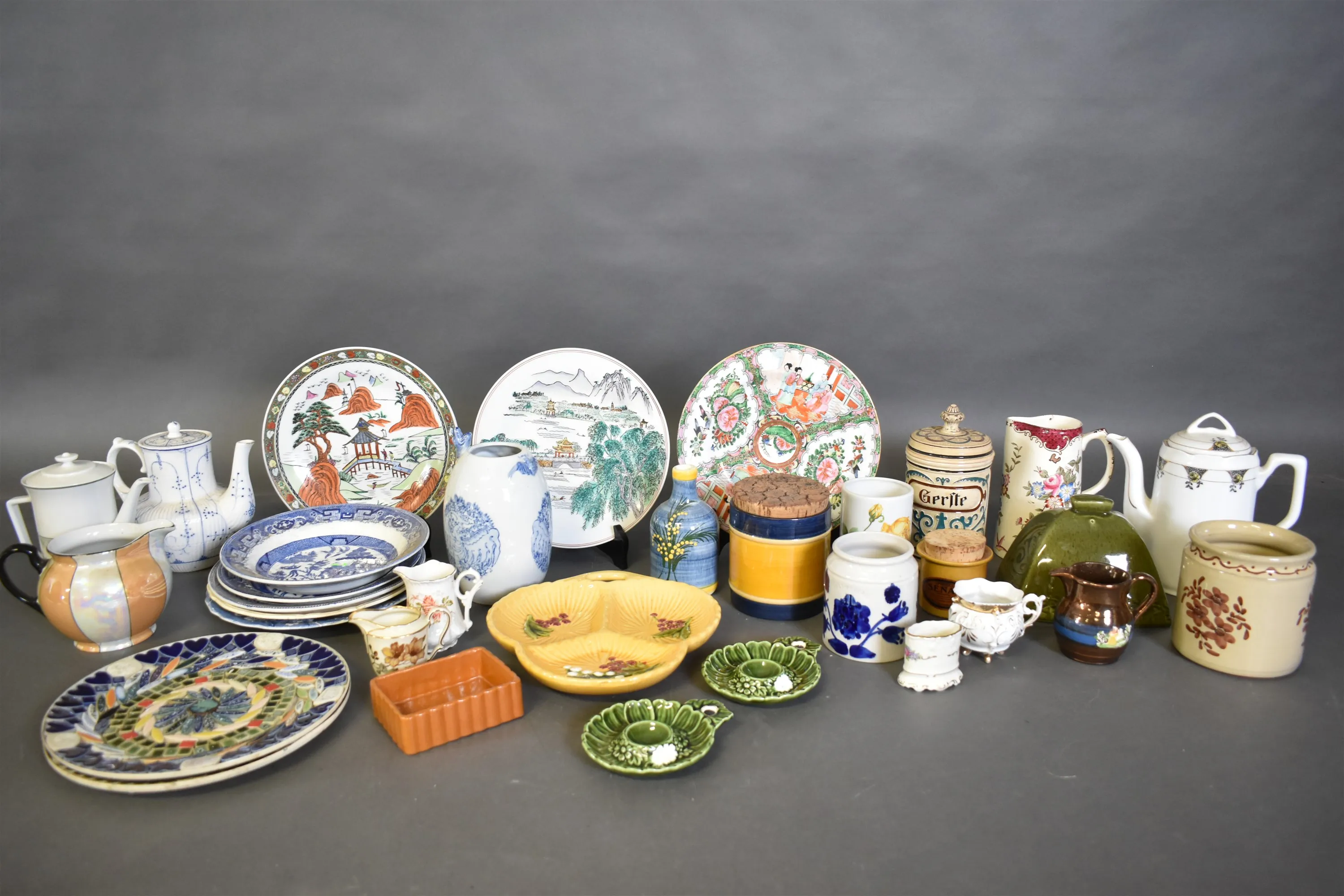 9289. Parti keramik och porslin bla tallrikar, kannor och krus, högsta höjd 27 cm