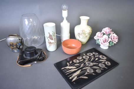6901. Parti keramik, porslin, glas och kamera Canon, högsta höjd 30 cm
