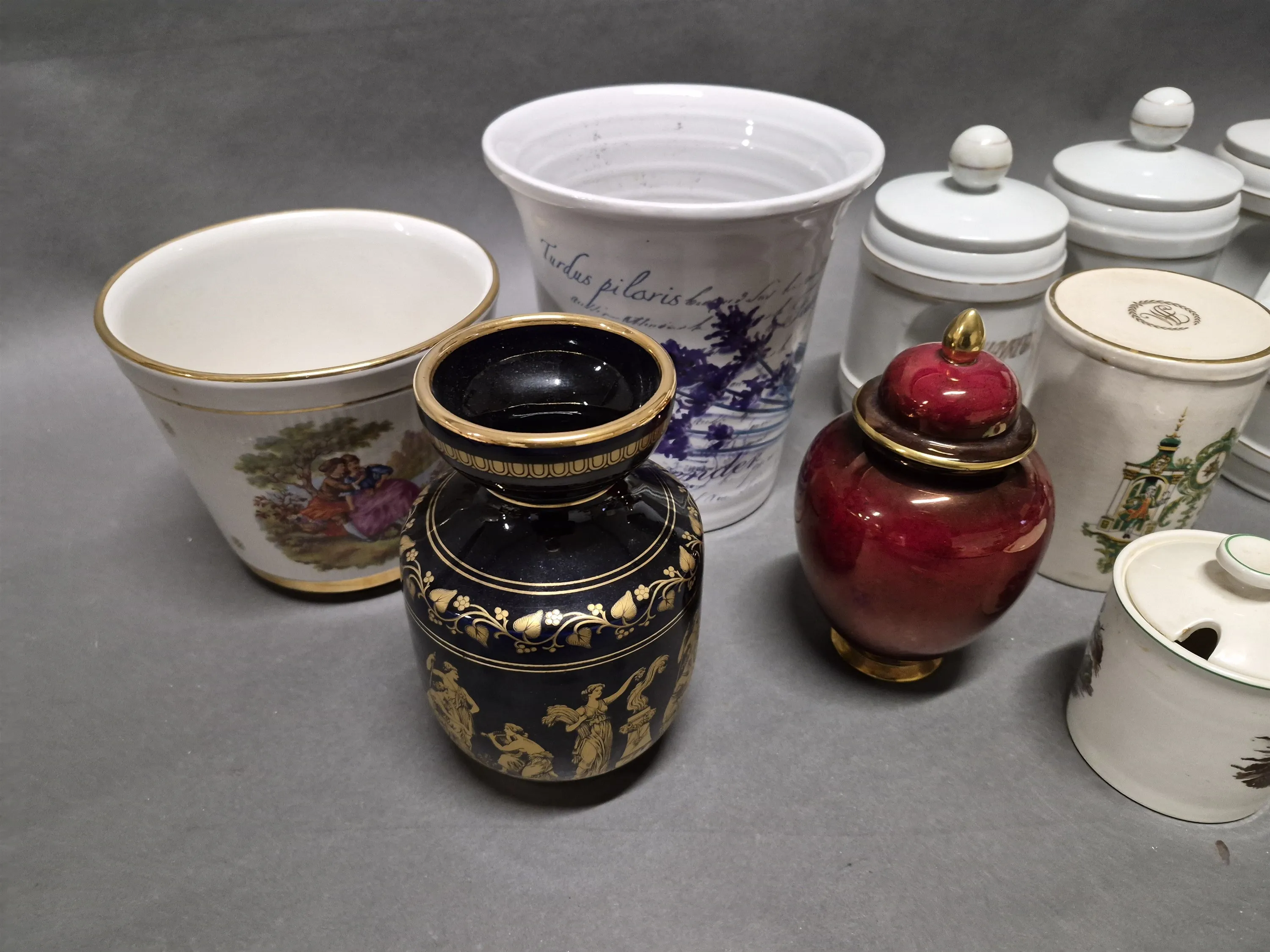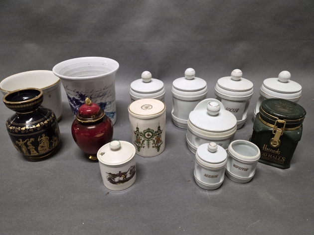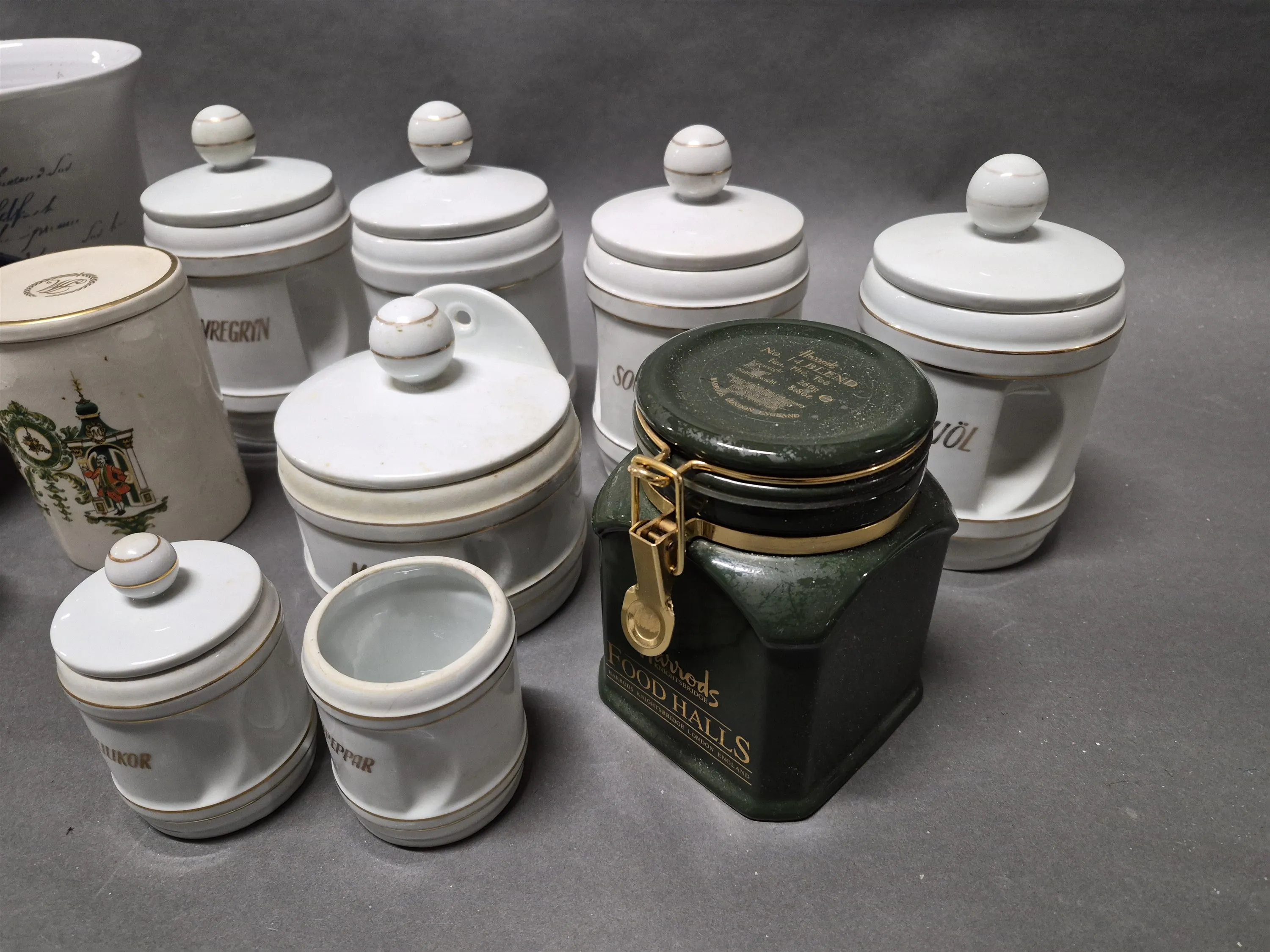 17788. Parti keramik/porslin bl.a kryddburkar & burk Harrods högstav22 cm