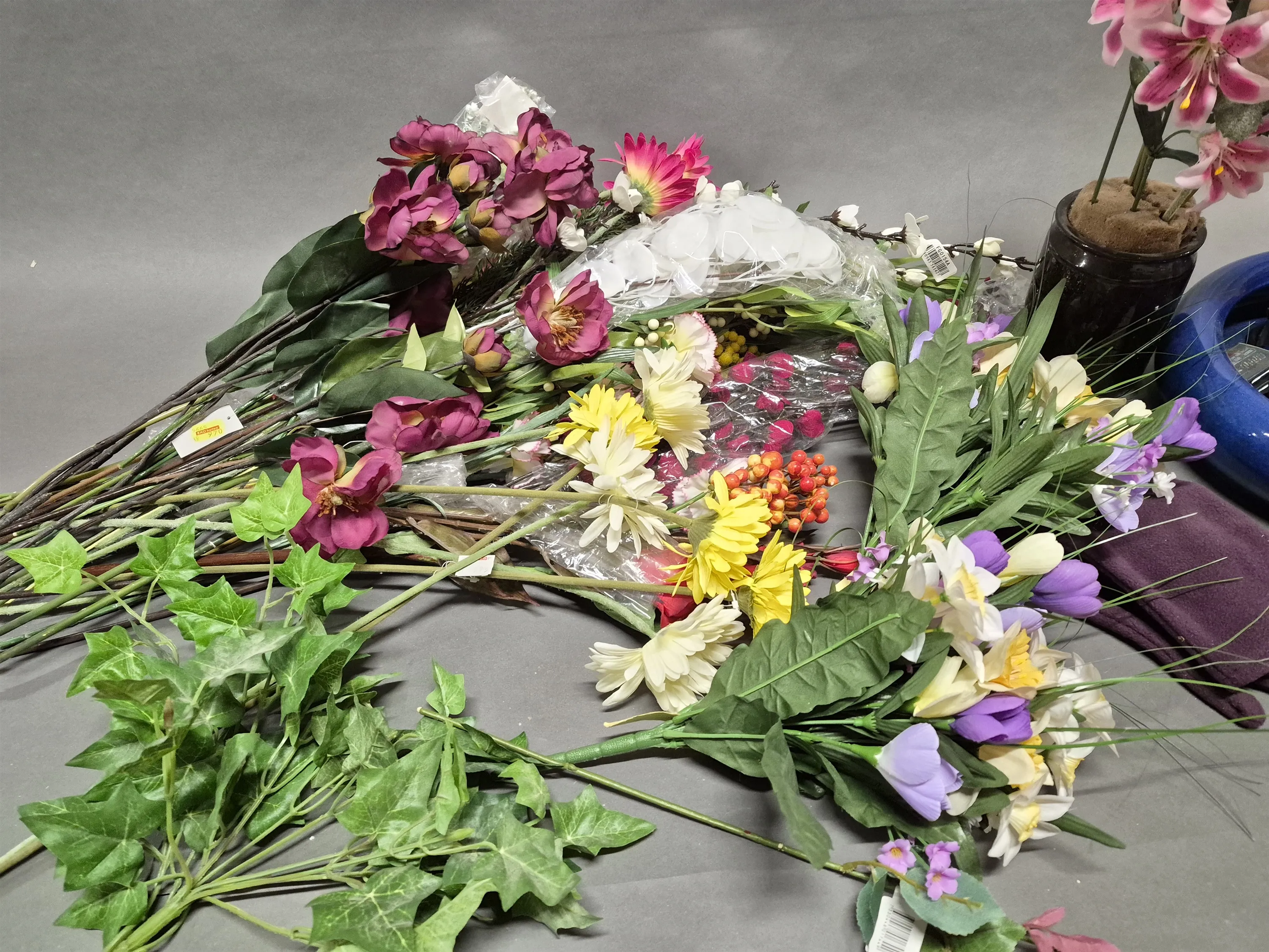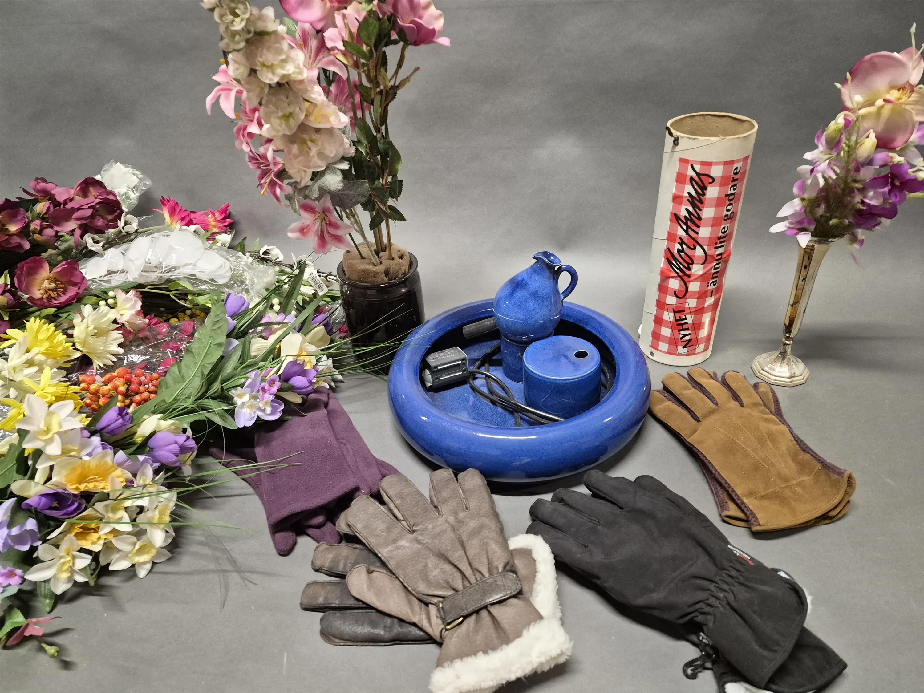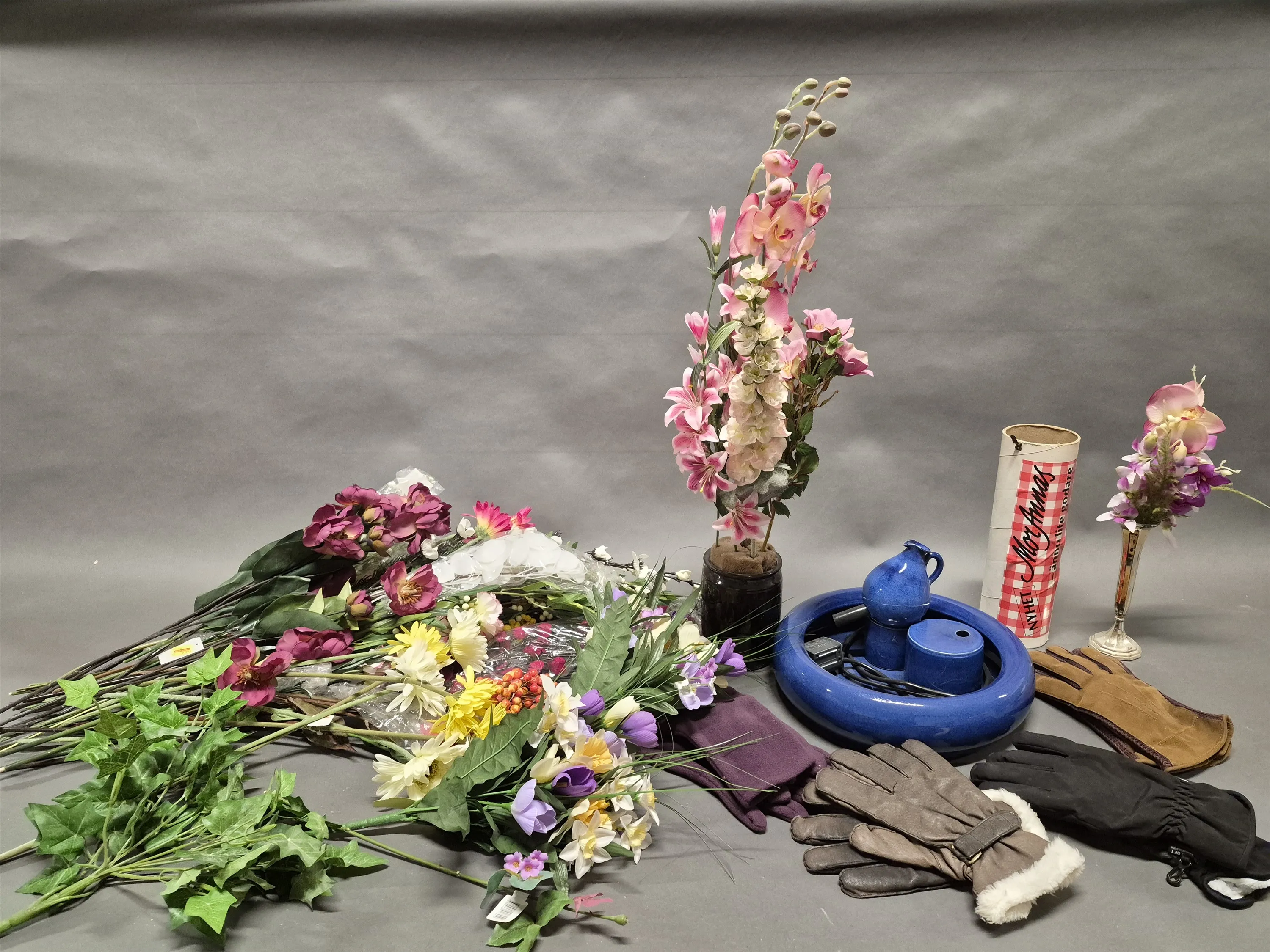 17456. Parti konstblommor, keramikfontän och vantar, högsta höjd på bild 75 cm